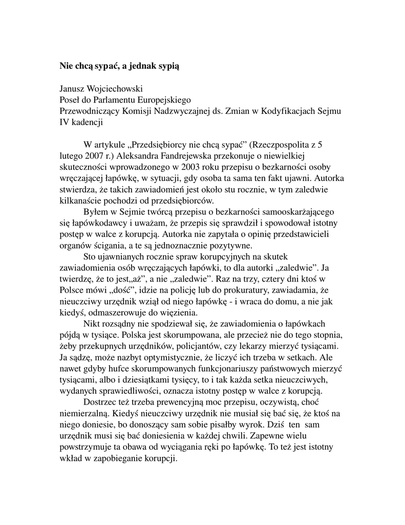 Nie chcą sypać, a jednak sypią Janusz Wojciechowski Poseł do Parlamentu Europejskiego Przewodniczący Komisji Nadzwyczajnej ds. Zmian w Kodyfikacjach Sejmu IV kadencji W artykule „Przedsiębiorcy nie chcą sypać” (Rzeczpospolita z 5 lutego 2007 r.) Aleksandra Fandrejewska przekonuje o niewielkiej skuteczności wprowadzonego w 2003 roku przepisu o bezkarności osoby wręczającej łapówkę, w sytuacji, gdy osoba ta sama ten fakt ujawni. Autorka stwierdza, że takich zawiadomień jest około stu rocznie, w tym zaledwie kilkanaście pochodzi od przedsiębiorców. Byłem w Sejmie twórcą przepisu o bezkarności samooskarżającego się łapówkodawcy i uważam, że przepis się sprawdził i spowodował istotny postęp w walce z korupcją. Autorka nie zapytała o opinię przedstawicieli organów ścigania, a te są jednoznacznie pozytywne. Sto ujawnianych rocznie spraw korupcyjnych na skutek zawiadomienia osób wręczających łapówki, to dla autorki „zaledwie”. Ja twierdzę, że to jest„aż”, a nie „zaledwie”. Raz na trzy, cztery dni ktoś w Polsce mówi „dość”, idzie na policję lub do prokuratury, zawiadamia, że nieuczciwy urzędnik wziął od niego łapówkę i wraca do domu, a nie jak kiedyś, odmaszerowuje do więzienia. Nikt rozsądny nie spodziewał się, że zawiadomienia o łapówkach pójdą w tysiące. Polska jest skorumpowana, ale przecież nie do tego stopnia, żeby przekupnych urzędników, policjantów, czy lekarzy mierzyć tysiącami. Ja sądzę, może nazbyt optymistycznie, że liczyć ich trzeba w setkach. Ale nawet gdyby hufce skorumpowanych funkcjonariuszy państwowych mierzyć tysiącami, albo i dziesiątkami tysięcy, to i tak każda setka nieuczciwych, wydanych sprawiedliwości, oznacza istotny postęp w walce z korupcją. Dostrzec też trzeba prewencyjną moc przepisu, oczywistą, choć niemierzalną. Kiedyś nieuczciwy urzędnik nie musiał się bać się, że ktoś na niego doniesie, bo donoszący sam sobie pisałby wyrok. Dziś ten sam urzędnik musi się bać doniesienia w każdej chwili. Zapewne wielu powstrzymuje ta obawa od wyciągania ręki po łapówkę. To też jest istotny wkład w zapobieganie korupcji. W publikacji przytoczony został przykład przedsiębiorcy budowlanego, który dał łapówkę i się do tego przyznał, a potem miał same problemy. Prokuratura długo badała jego sprawę. Potem oskarżony urzędnik pozwał go do sądu o zniesławienie. A teraz w jego firmie kontrola goni kontrolę. Świetny przykład, tyle, że wniosek z niego płynie dokładnie odwrotny do tez postawionych w artykule, Gdyby nie wprowadzony w 2003 roku przepis, to ten przedsiębiorca, oprócz wszystkich swoich obecnych kłopotów, miałby na głowie jeszcze jeden, najpoważniejszy – za wręczenie łapówki siedziałby w więzieniu. Dziś ma przynajmniej ten przywilej, że nie siedzi i siedział nie będzie. Owszem, nie miałby ów przedsiębiorca żadnego kłopotu, gdyby się do łapówki nie przyznał. Przede wszystkim jednak nie miałby kłopotu urzędnik przez tego przedsiębiorcę oskarżony. Urzędowałby dalej z wyciągniętą łapą, nie niepokojony przez nikogo. Przedsiębiorca miałby spokój, urzędnik miałby spokój. Prokuratura też miałaby spokój – nie ma doniesienia, nie ma sprawy. Jeśli o taki spokój chodzi, to przywróćmy bezwzględną karalność osoby wręczającej łapówkę i korupcjo trwaj.