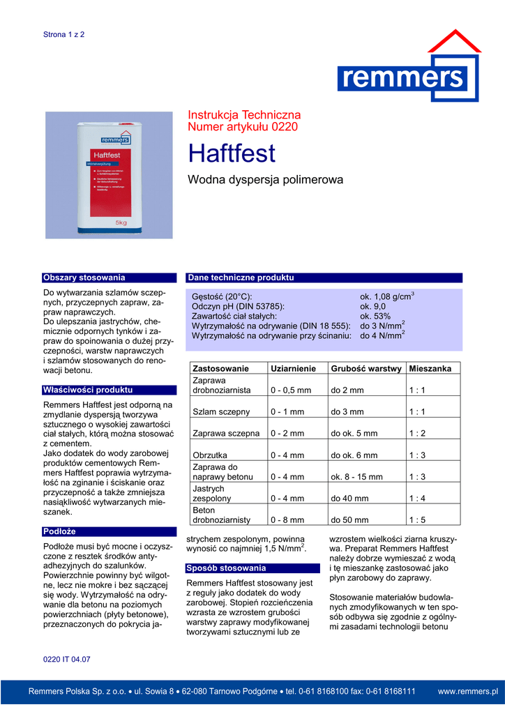 Strona 1 z 2 Instrukcja Techniczna Numer artykułu 0220 Haftfest Wodna dyspersja polimerowa Obszary stosowania Do wytwarzania szlamów sczepnych, przyczepnych zapraw, zapraw naprawczych. Do ulepszania jastrychów, chemicznie odpornych tynków i zapraw do spoinowania o dużej przyczepności, warstw naprawczych i szlamów stosowanych do renowacji betonu. Właściwości produktu Remmers Haftfest jest odporną na zmydlanie dyspersją tworzywa sztucznego o wysokiej zawartości ciał stałych, którą można stosować z cementem. Jako dodatek do wody zarobowej produktów cementowych Remmers Haftfest poprawia wytrzymałość na zginanie i ściskanie oraz przyczepność a także zmniejsza nasiąkliwość wytwarzanych mieszanek. Podłoże Podłoże musi być mocne i oczyszczone z resztek środków antyadhezyjnych do szalunków. Powierzchnie powinny być wilgotne, lecz nie mokre i bez sączącej się wody. Wytrzymałość na odrywanie dla betonu na poziomych powierzchniach (płyty betonowe), przeznaczonych do pokrycia ja- Dane techniczne produktu Gęstość (20°C): Odczyn pH (DIN 53785): Zawartość ciał stałych: Wytrzymałość na odrywanie (DIN 18 555): Wytrzymałość na odrywanie przy ścinaniu: ok. 1,08 g/cm ok. 9,0 ok. 53% 2 do 3 N/mm 2 do 4 N/mm 3 Zastosowanie Zaprawa drobnoziarnista Uziarnienie Grubość warstwy Mieszanka 0 - 0,5 mm do 2 mm 1:1 Szlam sczepny 0 - 1 mm do 3 mm 1:1 Zaprawa sczepna 0 - 2 mm do ok. 5 mm 1:2 Obrzutka Zaprawa do naprawy betonu Jastrych zespolony Beton drobnoziarnisty 0 - 4 mm do ok. 6 mm 1:3 0 - 4 mm ok. 8 - 15 mm 1:3 0 - 4 mm do 40 mm 1:4 0 - 8 mm do 50 mm 1:5 strychem zespolonym, powinna 2 wynosić co najmniej 1,5 N/mm . Sposób stosowania Remmers Haftfest stosowany jest z reguły jako dodatek do wody zarobowej. Stopień rozcieńczenia wzrasta ze wzrostem grubości warstwy zaprawy modyfikowanej tworzywami sztucznymi lub ze wzrostem wielkości ziarna kruszywa. Preparat Remmers Haftfest należy dobrze wymieszać z wodą i tę mieszankę zastosować jako płyn zarobowy do zaprawy. Stosowanie materiałów budowlanych zmodyfikowanych w ten sposób odbywa się zgodnie z ogólnymi zasadami technologii betonu 0220 IT 04.07 Remmers Remmers Polska Polska Sp. Sp. zz o.o. o.o. •• ul. ul. Sowia Sowia 88 •• 62-080 62-080 Tarnowo Tarnowo Podgórne Podgórne •• tel. tel. 0-61 0-61 8168100 8168100 fax: fax: 0-61 0-61 8168111 8168111 www.remmers.pl www.remmers.pl Strona 2 z 2 i materiałów cementowych oraz zgodnie ze stanem techniki. Dyspersje tworzyw sztucznych tworzą po wyschnięciu błonę, która działa jako warstwa rozdzielająca dla materiałów cementowych. Należy zawsze pracować świeże na świeże. Wskazówki Nie stosować w temperaturach poniżej +5°C. Podane właściwości techniczne obowiązują po całkowitym stwardnieniu przygotowanych mieszanek. Narzędzia, czyszczenie Ławkowiec, szczotka, szpachla lub kielnia. Czyszczenie: Czyścić na świeżo wodą, po związaniu stosować rozpuszczalnik V 101 w celu spęcznienia. Rodzaj opakowania, zużycie, składowanie Rodzaj opakowania: Pojemniki blaszane 1 kg, 5 kg i 10 kg. Zużycie: 2 0,1 - 0,8 kg/m zależnie od rodzaju zastosowania. Składowanie: W zamkniętych oryginalnych pojemnikach, przy składowaniu w chłodnym miejscu co najmniej 12 miesięcy. Bezpieczeństwo, ochrona środowiska, usuwanie Bliższe informacje na temat bezpieczeństwa podczas transportu, składowania i stosowania oraz na temat usuwania i ochrony środowiska znajdują się w aktualnej karcie charakterystyki produktu. Powyższe wskazówki zostały zestawione w naszym dziale produkcji według najnowszego stanu wiedzy i techniki stosowania. Ponieważ rodzaje zastosowań i sposób użycia są poza naszą kontrolą, z treści tej instrukcji nie wynika żadna odpowiedzialność producenta. Wskazówki wykraczające poza zawartość tej instrukcji lub wskazówki różniące się od treści instrukcji wymagają pisemnego potwierdzenia przez zakład macierzysty. W każdym przypadku obowiązują nasze ogólne warunki handlowe. Z wydaniem niniejszej instrukcji technicznej poprzednie tracą swoją ważność. 0220 IT 04.07 Remmers Polska Sp. z o.o. • ul. Sowia 8 • 62-080 Tarnowo Podgórne • tel. 0-61 8168100 fax: 0-61 8168111 www.remmers.pl