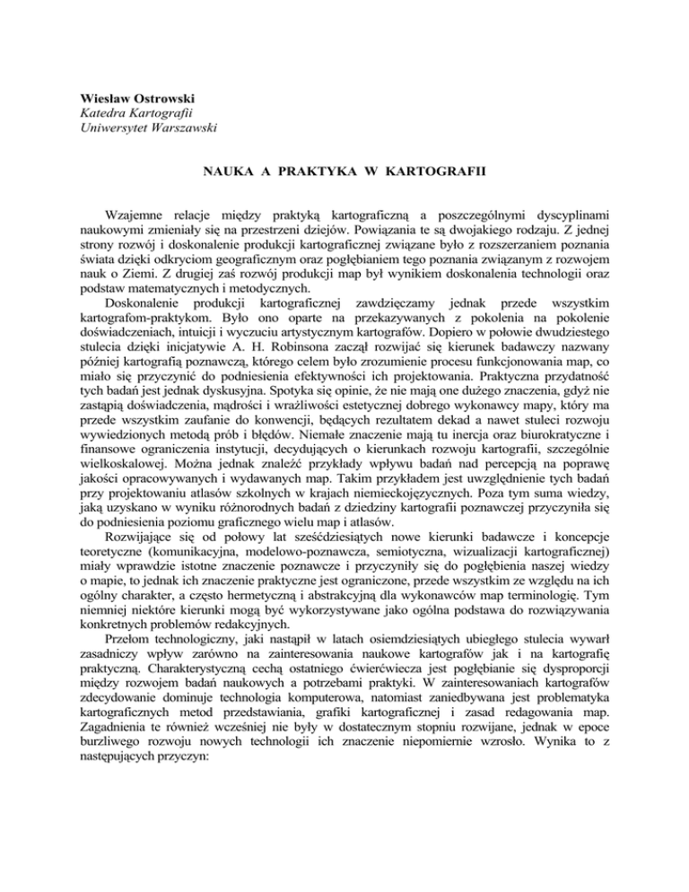 Wiesław Ostrowski Katedra Kartografii Uniwersytet Warszawski NAUKA A PRAKTYKA W KARTOGRAFII Wzajemne relacje między praktyką kartograficzną a poszczególnymi dyscyplinami naukowymi zmieniały się na przestrzeni dziejów. Powiązania te są dwojakiego rodzaju. Z jednej strony rozwój i doskonalenie produkcji kartograficznej związane było z rozszerzaniem poznania świata dzięki odkryciom geograficznym oraz pogłębianiem tego poznania związanym z rozwojem nauk o Ziemi. Z drugiej zaś rozwój produkcji map był wynikiem doskonalenia technologii oraz podstaw matematycznych i metodycznych. Doskonalenie produkcji kartograficznej zawdzięczamy jednak przede wszystkim kartografom-praktykom. Było ono oparte na przekazywanych z pokolenia na pokolenie doświadczeniach, intuicji i wyczuciu artystycznym kartografów. Dopiero w połowie dwudziestego stulecia dzięki inicjatywie A. H. Robinsona zaczął rozwijać się kierunek badawczy nazwany później kartografią poznawczą, którego celem było zrozumienie procesu funkcjonowania map, co miało się przyczynić do podniesienia efektywności ich projektowania. Praktyczna przydatność tych badań jest jednak dyskusyjna. Spotyka się opinie, że nie mają one dużego znaczenia, gdyż nie zastąpią doświadczenia, mądrości i wrażliwości estetycznej dobrego wykonawcy mapy, który ma przede wszystkim zaufanie do konwencji, będących rezultatem dekad a nawet stuleci rozwoju wywiedzionych metodą prób i błędów. Niemałe znaczenie mają tu inercja oraz biurokratyczne i finansowe ograniczenia instytucji, decydujących o kierunkach rozwoju kartografii, szczególnie wielkoskalowej. Można jednak znaleźć przykłady wpływu badań nad percepcją na poprawę jakości opracowywanych i wydawanych map. Takim przykładem jest uwzględnienie tych badań przy projektowaniu atlasów szkolnych w krajach niemieckojęzycznych. Poza tym suma wiedzy, jaką uzyskano w wyniku różnorodnych badań z dziedziny kartografii poznawczej przyczyniła się do podniesienia poziomu graficznego wielu map i atlasów. Rozwijające się od połowy lat sześćdziesiątych nowe kierunki badawcze i koncepcje teoretyczne (komunikacyjna, modelowo-poznawcza, semiotyczna, wizualizacji kartograficznej) miały wprawdzie istotne znaczenie poznawcze i przyczyniły się do pogłębienia naszej wiedzy o mapie, to jednak ich znaczenie praktyczne jest ograniczone, przede wszystkim ze względu na ich ogólny charakter, a często hermetyczną i abstrakcyjną dla wykonawców map terminologię. Tym niemniej niektóre kierunki mogą być wykorzystywane jako ogólna podstawa do rozwiązywania konkretnych problemów redakcyjnych. Przełom technologiczny, jaki nastąpił w latach osiemdziesiątych ubiegłego stulecia wywarł zasadniczy wpływ zarówno na zainteresowania naukowe kartografów jak i na kartografię praktyczną. Charakterystyczną cechą ostatniego ćwierćwiecza jest pogłębianie się dysproporcji między rozwojem badań naukowych a potrzebami praktyki. W zainteresowaniach kartografów zdecydowanie dominuje technologia komputerowa, natomiast zaniedbywana jest problematyka kartograficznych metod przedstawiania, grafiki kartograficznej i zasad redagowania map. Zagadnienia te również wcześniej nie były w dostatecznym stopniu rozwijane, jednak w epoce burzliwego rozwoju nowych technologii ich znaczenie niepomiernie wzrosło. Wynika to z następujących przyczyn: 1.Radykalnie zwiększa się zarówno liczba wydawanych map jak i ich różnorodność tematyczna. Przyczyną tego jest, poza nowymi możliwościami technologicznymi, docenianie syntetyzującej roli mapy wobec nadmiaru dostępnej informacji, a także postępujący proces globalizacji w sferze obiegu informacji (Internet, telewizja satelitarna). 2. Liczba opracowywanych i wydawanych map pozostaje w znacznej dysproporcji z liczbą osób o przygotowaniu lub choćby wyczuciu kartograficznym. Powoduje to, że mapy opracowują również ci, którzy opanowali jedynie wybrane programy komputerowe, przez co poziom tych map zarówno merytoryczny jak i graficzny jest często bardzo niski. 3.Technologia interaktywna umożliwia indywidualne wykorzystanie map poprzez udział w ich redagowaniu, co powoduje zatarcie granicy między opracowaniem a użytkowaniem mapy. Wymienione wyżej uwarunkowania sprawiają, że za rozwojem techniki, ułatwiającym samo wykonanie mapy, nie nadąża postęp w zakresie koncepcji, metodyki i grafiki kartograficznej, co powoduje, że możliwości, jakie dają nowe technologie są wykorzystywane w dalece niewystarczającym stopniu. Jednocześnie musimy sobie uświadomić, że proces „demokratyzacji” w zakresie opracowania map będzie dalej postępował i kartografowie powinni dążyć do opracowania praktycznych, możliwie prostych zasad i reguł prawidłowego posługiwania się językiem mapy, odnoszących się do jego tworzenia jak i wykorzystywania. Te reguły powinny mieć zarówno podstawy naukowe, jak też powinny wynikać z doświadczeń praktycznych. Nie mogą się one jednak ograniczać jedynie do ogólnych zasad i prawidłowości. Wobec wielkiej różnorodności map i sposobów ich wykorzystania konieczne jest opracowanie konkretnych zasad postępowania, odnoszących się do poszczególnych typów map, sposobów prezentacji czy też redagowania poszczególnych elementów treści mapy. Opracowania takie powinny być przeznaczone nie tylko dla kartografów, ale dla wszystkich potencjalnych twórców i użytkowników opracowań kartograficznych.
