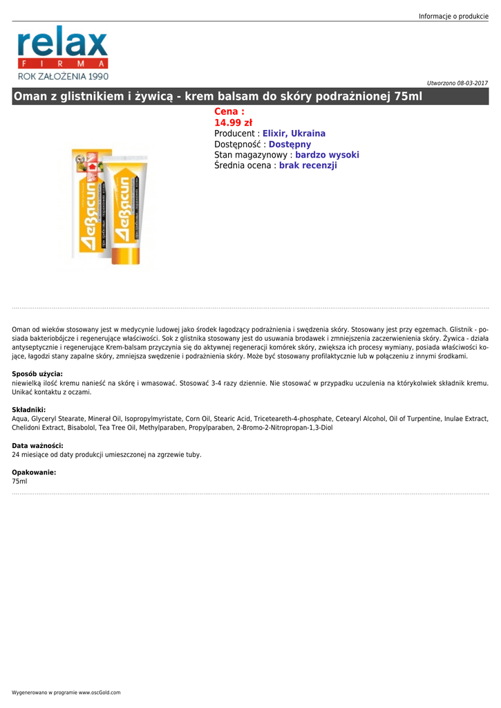 Informacje o produkcie Utworzono 08-03-2017 Oman z glistnikiem i żywicą - krem balsam do skóry podrażnionej 75ml Cena : 14.99 zł Producent : Elixir, Ukraina Dostępność : Dostępny Stan magazynowy : bardzo wysoki Średnia ocena : brak recenzji Oman od wieków stosowany jest w medycynie ludowej jako środek łagodzący podrażnienia i swędzenia skóry. Stosowany jest przy egzemach. Glistnik - posiada bakteriobójcze i regenerujące właściwości. Sok z glistnika stosowany jest do usuwania brodawek i zmniejszenia zaczerwienienia skóry. Żywica - działa antyseptycznie i regenerujące Krem-balsam przyczynia się do aktywnej regeneracji komórek skóry, zwiększa ich procesy wymiany, posiada właściwości kojące, łagodzi stany zapalne skóry, zmniejsza swędzenie i podrażnienia skóry. Może być stosowany profilaktycznie lub w połączeniu z innymi środkami. Sposób użycia: niewielką ilość kremu nanieść na skórę i wmasować. Stosować 3-4 razy dziennie. Nie stosować w przypadku uczulenia na którykolwiek składnik kremu. Unikać kontaktu z oczami. Składniki: Aqua, Glyceryl Stearate, Minerał Oil, Isopropylmyristate, Corn Oil, Stearic Acid, Triceteareth-4-phosphate, Cetearyl Alcohol, Oil of Turpentine, Inulae Extract, Chelidoni Extract, Bisabolol, Tea Tree Oil, Methylparaben, Propylparaben, 2-Bromo-2-Nitropropan-1,3-Diol Data ważności: 24 miesiące od daty produkcji umieszczonej na zgrzewie tuby. Opakowanie: 75ml Wygenerowano w programie www.oscGold.com