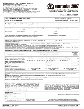 Międzynarodowe Targi Poznańskie Sp. z o.o. POZNAŃ INTERNATIONAL FAIR Ltd. Zespół Projektowy Tour Salon / Project Team Tour Salon ul. Głogowska 14, 60-734 Poznań, Poland tel. +48/61/ 869 22 65, 869 24 19, 869 00 00; fax +48 /61/ 869 29 69 Konto / Bank account: Bank Handlowy w Warszawie S.A. o/Poznań Wystawcy krajowi : 37 103012470000000055861201 Foreign exhibitors :PL 66 103012470000000055861358 SWIFT CITIPLPX Płatnik VAT czynny, NIP/ Tax Id 777-00-00-488, KRS 0000 202703 Targi Regionów i Produktów Turystycznych Trade Fair of Regions and Tourist Products Poznań 24-27.10.2007 ZGŁOSZENIE UCZESTNICTWA APPLICATION FORM termin nadsyłania zgłoszeń application deadline 21.05.2007 Firma Wystawcy (pełna nazwa) / Exhibitor’s company (full name): Ulica, nr / Street: Kraj / Country: Kod pocztowy / Postal code: Telefon / Phone: Miasto / City: Województwo / District: Fax: E-mail: Internet: Osoba upoważniona do reprezentowania firmy (imię i nazwisko, stanowisko) / Person authorised to company’s representation (name, position): Osoba kontaktowa / Contact person: NIP / Tax ID: Wpis do KRS/ ewidencji działalności gospodarczej nr / Company registration no: Data i miejsce/ date and place: Dane o wystawcy / We are: (Właściwe zakreślić / Mark the appropriate) producent / manufacturer firma handlowa / trader inne / others Zgodnie z Ustawą z dnia 18.07.2002 r. (Dz.U. nr 144, poz. 1204) o świadczeniu usług drogą elektroniczną, wyrażam zgodę na otrzymywanie informacji marketingowych od firmy Międzynarodowe Targi Poznańskie Sp. z o.o. drogą elektroniczną na ww. adres e-mail / We hereby declare our consent to receive marketing information from Poznań International Fair Ltd. on a/m e-mail address (according to Act on Electronic ServiceProvding of 18th July, 2002, published in Journal of Laws no 144 item 1204). TAK/YES NIE/NO Zamawiamy następującą powierzchnię: / We order exhibition space as follows: Rodzaj powierzchni / Kind of space Parter (niezabudowana w pawilonie) Ground floor (Indoors without a booth) Zamawiana ilość / Quantity required Zamawiana powierzchnia (właściwe zaznaczyć) / Space required (mark the applicable) Narożna / Comer location Szeregowa / Row location 290 PLN / m2 300 PLN / m2 Piętro (niezabudowana w pawilonie) Upper floor (Indoors without the booth) Otwarta (niezabudowana poza pawilonem) Outdoors ( without a booth) Z zabudową standardową w pawilonie Indoors – space with a standard booth Półwyspowa (minimum 20m2) / peninsular location (min. 20m2) 315 PLN / m2 2 Stoisko / Stand 6 m – Stoisko wyspowe (minimum 30m2) / Island location (min. 30m2) 330 PLN / m2 ……………m 2 200 PLN / m2 ……………m 2 70 PLN / m2 ……………m 2 2 Stoisko / Stand 12 m – 4.500 PLN 2.500 PLN 2 Stoisko / Stand 20 m – 6.500 PLN Ceny nie uwzględniają podatku od towarów i usług. The prices do not include VAT. Branża (MTP lokalizują ekspozycje wystawców w układzie branżowym. Prosimy o podanie wyłącznie jednej branży na podstawie formularza A1/L) Branch(PIF allocates space by branches. Please indicate only one branch acc. to List of Branches for location - A1/L) Numer branży / Branch number : ............................. ………………………………………………………………………………… Życzenia dot. lokalizacji / wymiarów stoiska spełniane w miarę możliwości MTP Location / stand dimensions requirements to be fulfilled by PIF if possible Podpisując niniejsze Zgłoszenie Uczestnictwa akceptujemy jako obowiązujące nas: REGULAMIN DLA UCZESTNIKÓW TARGÓW, PRZEPISY TECHNICZNE I PRZECIWPOŻAROWE, POSTANOWIENIA SZCZEGÓŁOWE ORAZ WARUNKI UCZESTNICTWA W TARGACH. Oświadczamy, że przejmujemy zobowiązania wobec MTP wynikające z niniejszego zamówienia w przypadku, gdy wskazany przez nas płatnik nie ureguluje należności za zamówioną powierzchnię. By signing the present Application Form we declare to comply with the following: REGULATION FOR PARTICIPANTS OF FAIRS, TECHNICAL AND FIRE SAFETY REGULATIONS, SPECIFIC PROVISIONS and TERMS OF PARTICIPATION IN THE FAIR. We hereby declare our responsibility towards PIF for all the liabilities resulting from the order in case the payer indicated should not meet the payments for the space lease. Płatnik / Payer (właściwe zaznaczyć / mark the applicable) ________________________________ Miejsce i data / Place and date of signing Wystawca / Exhibitor Firma wymieniona w formularzu A0 Company listed on A0 form TOUR SALON 2007 ________________________________ Pieczęć Wystawcy/ Company’s stamp ______________________________________ Podpis osoby upoważnionej do reprezentowania firmy/ Signature of person authorised to company's representation FORMULARZ / FORM A1