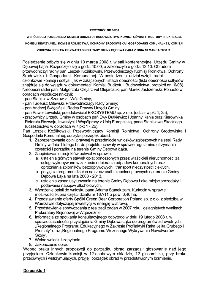 PROTOKÓŁ NR 16/08 WSPÓLNEGO POSIEDZENIA KOMISJI BUDśETU l BUDOWNICTWA, KOMISJI OŚWIATY, KULTURY l REKREACJI, KOMISJI REWIZYJNEJ, KOMISJI ROLNICTWA, OCHRONY ŚRODOWISKA l GOSPODARKI KOMUNALNEJ, KOMISJI ZDROWIA l SPRAW OBYWATELSKICH RADY GMINY DĘBOWA ŁĄKA Z DNIA 10 MARCA 2008 R. Posiedzenie odbyło się w dniu 10 marca 2008 r. w sali konferencyjnej Urzędu Gminy w Dębowej Łące. Rozpoczęło się o godz. 10.00, a zakończyło o godz. 12.10. Obradom przewodniczył radny pan Leszek Koźlikowski, Przewodniczący Komisji Rolnictwa, Ochrony Środowiska i Gospodarki Komunalnej. W posiedzeniu udział wzięli radni członkowie komisji i sołtysi, jak w załączonych listach obecności (lista obecności sołtysów znajduje się do wglądu w dokumentacji Komisji BudŜetu i Budownictwa, protokół nr 16/08). Nieobecni radni pani Małgorzata Olejarz vel Olejarczuk, pan Marek Jastrzemski. Ponadto w obradach współuczestniczyli: - pan Stanisław Szarowski, Wójt Gminy; - pan Tadeusz Milewski, Przewodniczący Rady Gminy; - pan Andrzej Święciński, Radca Prawny Urzędu Gminy; - pan Paweł Lewalski, przedstawiciel EKOSYSTEMU sp. z o.o. (udział w pkt 1, 2a); - pracownicy Urzędu Gminy w osobach pań Ewy Dutkiewicz i Joanny Kania oraz Kierownika Referatu Rozwoju, Inwestycji i Współpracy z Unią Europejską, pana Stanisława Skockiego (uczestnictwo w obradach w 7 pkt 1 - 2b). Pan Leszek Koźlikowski, Przewodniczący Komisji Rolnictwa, Ochrony Środowiska i Gospodarki Komunalnej, odczytał porządek obrad: 1. Zaprezentowanie opinii prawnej w przedmiocie wniosków zgłoszonych na sesji Rady Gminy w dniu 1 lutego br. do projektu uchwały w sprawie regulaminu utrzymania czystości i porządku na terenie Gminy Dębowa Łąka. 2. Zaopiniowanie projektów uchwał w sprawie: a. ustalenia górnych stawek opłat ponoszonych przez właścicieli nieruchomości za usługi wykonywane w zakresie odbierania odpadów komunalnych oraz opróŜniania zbiorników bezodpływowych i transport nieczystości ciekłych, b. przyjęcia programu działań na rzecz osób niepełnosprawnych na terenie Gminy Dębowa Łąka na lata 2008 - 2013, c. ustalenia zasad usytuowania na terenie Gminy Dębowa Łąka miejsc sprzedaŜy i podawania napojów alkoholowych. 3. WyraŜenie opinii do wniosku pana Adama Stanek zam. Kurkocin w sprawie moŜliwości kupna części działki nr 167/11 o pow. 0,40 ha. 4. Przedstawienie oferty Spółki Green Bear Corporation Poland sp. z o.o. z siedzibą w Warszawie dotyczącej inwestycji w energię wiatrową. 5. Przedstawienie sprawozdania z realizacji zadań w 2007 roku i osiągniętych wynikach Prokuratury Rejonowej w Wąbrzeźnie. 6. Informacja ze spotkania konsultacyjnego odbytego w dniu 19 lutego 2008 r. w sprawie zasadności przystąpienia Gminy Dębowa Łąka do programów zdrowotnych: „Regionalnego Programu Edukacyjnego w Zakresie Profilaktyki Raka Jelita Grubego i Prostaty" oraz „Regionalnego Programu Wczesnego Wykrywania Nowotworów Skóry". 7. Wolne wnioski i zapytania. 8. Zakończenie obrad. Wobec braku innych propozycji do porządku obrad zarządził głosowanie nad jego przyjęciem. Członkowie komisji w 12-osobowym składzie, 12 głosami za, przy braku przeciwnych i wstrzymujących, przyjęli porządek obrad w przedstawionym brzmieniu. Do punktu 1 Zaprezentowanie opinii prawnej w przedmiocie wniosków zgłoszonych na sesji Rady Gminy w dniu 1 lutego br. do projektu uchwały w sprawie regulaminu utrzymania czystości i porządku na terenie Gminy Dębowa Łąka. Prowadzący obrady, tytułem wstępu przypomniał, iŜ na sesji 1 lutego br. zawnioskowano o oddalenie projektu uchwały w sprawie regulaminu utrzymania czystości i porządku na terenie Gminy Dębowa Łąka, wnioskując o uwzględnienie w jego treściach zapisów obligujących EKOSYSTEM do nieodpłatnego odbioru segregowanych odpadów komunalnych, przedkładania rocznych informacji dotyczących kalkulacji kosztów odbioru odpadów komunalnych mieszanych (odbiór segregowanych nieodpłatny) i konieczności negocjacji tychŜe kosztów, przy ewentualnie planowanych podwyŜkach. Wnioski radnych poddano opinii prawnej, która została zaprezentowana przez radcę prawnego, pana Andrzeja Święcińskiego (opinia prawna w załączeniu do protokółu). Do punktu 2 a. Zaopiniowanie projektu uchwały w sprawie: - ustalenia górnych stawek opłat ponoszonych przez właścicieli nieruchomości za usługi wykonywane w zakresie odbierania odpadów komunalnych oraz opróŜniania zbiorników bezodpływowych i transport nieczystości ciekłych. Przewodniczący obrad odczytał projekt uchwały w sprawie ustalenia górnych stawek opłat ponoszonych przez właścicieli nieruchomości za usługi wykonywane w zakresie odbierania odpadów komunalnych oraz opróŜniania zbiorników bezodpływowych i transport nieczystości ciekłych. Pani Ewa Dutkiewicz przekazała do wiadomości, Ŝe górne stawki wykazane w projekcie uchwały, po uzgodnieniach z przedstawicielem Ekosystemu i Kierownikiem Referatu Rozwoju, Inwestycji i Współpracy z Unią Europejską, uległy zmianie i wynoszą: 1) za jednorazowe opróŜnianie i przekazanie do unieszkodliwiania nie segregowanych odpadów komunalnych: a) z pojemnika o pojemności ok. 120 l w wysokości - 10,00 zł, b) z pojemnika o pojemności ok. 1100 l w wysokości - 80,00 zł. Po rozpoznaniu prawnym, przez aklamację, z projektu uchwały wykreślono zapis kolidujący z ustawą o utrzymaniu czystości i porządku w gminach w brzmieniu „z pojemnika nietypowego lub sprzątanie luzem w wysokości 150.00 zł". Pan Lewalski zapewnił, iŜ osoby prawne mogą dostarczać własnym transportem odpady komunalne, materia ta obejmuje równieŜ odpady z terenu cmentarzy. Pan Wójt uznał, iŜ usługodawca transportu odpadów z cmentarza na wysypisko, winien posiadać pisemne potwierdzenie Księdza, co pozostało zaaprobowane przez uczestników debaty. Dalszy nurt obrad został zdominowany zasadnością wprowadzenia zmniejszo
