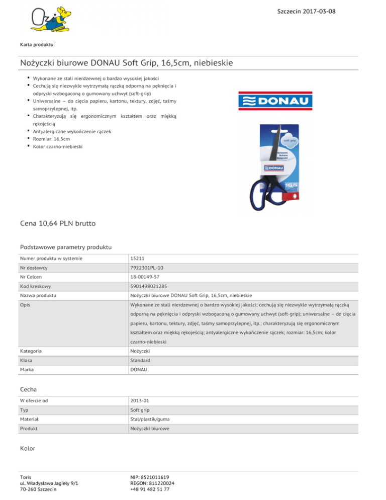 Szczecin 2017-03-08 Karta produktu: Nożyczki biurowe DONAU Soft Grip, 16,5cm, niebieskie Wykonane ze stali nierdzewnej o bardzo wysokiej jakości Cechują się niezwykle wytrzymałą rączką odporną na pęknięcia i odpryski wzbogaconą o gumowany uchwyt (soft-grip) Uniwersalne – do cięcia papieru, kartonu, tektury, zdjęć, taśmy samoprzylepnej, itp. Charakteryzują się ergonomicznym kształtem oraz miękką rękojeścią Antyalergiczne wykończenie rączek Rozmiar: 16,5cm Kolor czarno-niebieski Cena 10,64 PLN brutto Podstawowe parametry produktu Numer produktu w systemie 15211 Nr dostawcy 7922301PL-10 Nr Celcen 18-00149-57 Kod kreskowy 5901498021285 Nazwa produktu Nożyczki biurowe DONAU Soft Grip, 16,5cm, niebieskie Opis Wykonane ze stali nierdzewnej o bardzo wysokiej jakości; cechują się niezwykle wytrzymałą rączką odporną na pęknięcia i odpryski wzbogaconą o gumowany uchwyt (soft-grip); uniwersalne – do cięcia papieru, kartonu, tektury, zdjęć, taśmy samoprzylepnej, itp.; charakteryzują się ergonomicznym kształtem oraz miękką rękojeścią; antyalergiczne wykończenie rączek; rozmiar: 16,5cm; kolor czarno-niebieski Kategoria Nożyczki Klasa Standard Marka DONAU Cecha W ofercie od 2013-01 Typ Soft grip Materiał Stal/plastik/guma Produkt Nożyczki biurowe Kolor Toris ul. Władysława Jagieły 9/1 70-260 Szczecin NIP: 8521011619 REGON: 811220024 +48 91 482 51 77 Szczecin 2017-03-08 Karta katalogowa produktu cd. Nożyczki biurowe DONAU Soft Grip, 16,5cm, niebieskie Kolor Czarny/niebieski Wspólny słownik zamówień CPV 39241200-5 Nożyczki Certyfikaty Nowy produkt w ofercie Standard Hit Standard Wymiary Rozmiar 16,5cm Serdecznie zapraszamy do współpracy Toris zespół. Toris ul. Władysława Jagieły 9/1 70-260 Szczecin NIP: 8521011619 REGON: 811220024 +48 91 482 51 77