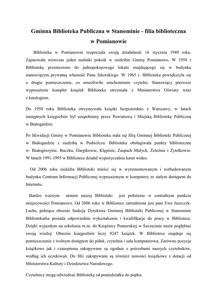 Gminna Biblioteka Publiczna w Stanominie - filia biblioteczna w Pomianowie Biblioteka w Pomianowie rozpoczęła swoją działalność 16 stycznia 1949 roku. Zajmowała wówczas jeden malutki pokoik w siedzibie Gminy Pomianowo. W 1958 r Bibliotekę przeniesiono do jednopokojowego lokalu znajdującego się w budynku stanowiącym prywatną własność Pana Sikorskiego. W 1965 r. Biblioteka powiększyła się o drugie pomieszczenie, co umożliwiło uruchomienie czytelni. Stanowiący pierwsze wyposażenie komplet książek Biblioteka otrzymała z Ministerstwa Oświaty wraz z katalogiem. Do 1958 roku Biblioteka otrzymywała książki bezpośrednio z Warszawy, w latach następnych księgozbiór był uzupełniany przez Powiatową i Miejską Bibliotekę Publiczną w Białogardzie. Po likwidacji Gminy w Pomianowie Biblioteka stała się filią Gminnej Biblioteki Publicznej w Białogardzie z siedzibą w Podwilczu. Biblioteka obsługiwała punkty biblioteczne w: Białogórzynie, Buczku, Dargikowie, Klępinie, Zaspach Małych, Żeleźnie i Żytelkowie. W latach 1991-1995 w Bibliotece działał wypożyczalnia kaset wideo. Od 2006 roku siedziba Biblioteki mieści się w wyremontowanym i rozbudowanym budynku Centrum Informacji Publicznej wyposażonym w komputery ze stałym dostępem do Internetu. Bardzo ważnym atutem naszej Biblioteki jest położenie w centralnym punkcie miejscowości Pomianowo. Od 2006 roku w Bibliotece zatrudniona jest pani Ewa JuszczykLachs, pełniąca obecnie funkcję Dyrektora Gminnej Biblioteki Publicznej w Stanominie Bibliotekarka posiada odpowiednie wykształcenie i kwalifikacje do pracy w Bibliotece. Dzięki wyjazdom na szkolenia m.in. do Książnicy Pomorskiej w Szczecinie może pogłębiać swoją wiedzę. Obecnie księgozbiór liczy 9247 książek. W Bibliotece znajduje się pomieszczenie z wolnym dostępem do półek, czytelnia i sala komputerowa, Zarówno pozycje książkowe jak i czasopisma zakupywane są zgodnie z potrzebami naszych czytelników, według ich oczekiwań. Do filii zakupywane są również nowości książkowe z dotacji od Ministerstwa Kultury i Dziedzictwa Narodowego. Czytelnicy mogą odwiedzać Bibliotekę od poniedziałku do piątku. Rodzice wraz z najmłodszymi czytelnikami chętnie odwiedzają naszą bibliotekę, dla których przygotowany jest kącik biblioteczny - miejsce to wyposażone jest w gry planszowe, puzzle oraz książeczki edukacyjne, które stoją na kolorowych regałach zachęcających dzieci do sięgnięcia po książkę. Książeczki edukacyjne są bardzo ważne w rozwoju dziecka w początkowych latach życia, dlatego są wykorzystywanie przez dzieci i rodziców – czytelników naszej filii. W naszym dziecięcym kąciku znajdują się również kolorowe czasopisma przeznaczone dla najmłodszych. Dużym naszym atutem jest to, iż Biblioteka jest jedynym ośrodkiem kultury na naszych terenach wiejskich. Filia biblioteczna od wielu lat współpracuje z Gimnazjum w Pomianowie. Wspólnie z nauczycielami j. polskiego są organizowane lekcje biblioteczne z uczniami szkoły poświęcone tematyce wybranego autora. Radny, Sołtys, Rada Sołecka oraz mieszkańcy wsi są współorganizatorami uroczystości odbywających się w Bibliotece: Dzień Babci, Dzień Dziadka, Dzień Matki, Halloween, Andrzejki. W Bibliotece organizowane są również Jasełka pokoleniowe, w których udział biorą bibliotekarze oraz mieszkańcy wsi Pomianowo. Dzięki ludziom „dobrego serca” możemy, co roku zorganizować Bal karnawałowy także dla dzieci niepełnosprawnych z Pomianowa i okolic. Zapraszamy wszystkich, którzy chcieliby skorzystać z bogatej ofert Biblioteki nie tylko z Pomianowa, ale także z okolic. W najbliższym czasie akcja „Mój przyjaciel pies” i przygotowania do Jasełek pokoleniowych. Przygotowania do „Halloween” Jasełka pokoleniowe Lekcja biblioteczna z uczniami Gimnazjum w Pomianowie Realizacja projektu „Pożyteczne wakacje” „Tłusty czwartek” w filii bibliotecznej w Pomianowie