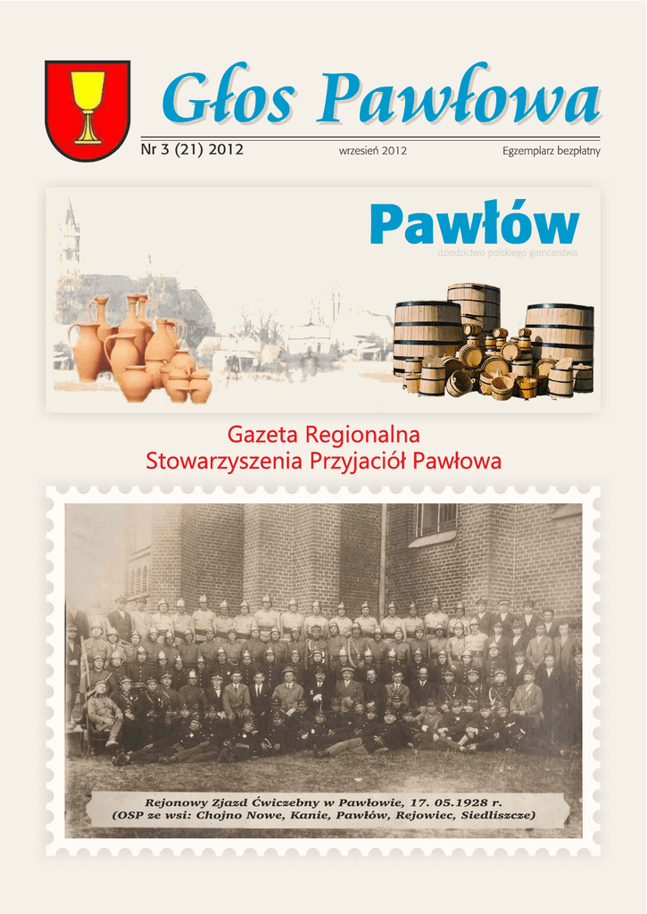 Spis treści: 1. Epizody w historii garncarstwa pawłowskiego XX wieku (cz. I.)......................... 3 str. Michał Trzewik 2. W 68 rocznicę powstania I Korpusu Pancernego................................................... 4 str. płk w st. spocz. doc. dr Zbysław Szymczak 3. Dożynki w Kaniem................................................................................................. 6 str. Andrzej Kosz 4. Złoża węgla kamiennego „Pawłów” Zdzisław Krupa 5. Wystawa fotograficzna w Krasnem........................................................................ 7 str. Agnieszka Hasiec-Bzowskas 6. Łysk, Łyszcze, Łyszcz, Pawłów............................................................................. 8 str. Andrzej Przychodzki 7. Unijne środki - pawłowska realizacja..................................................................... 9 str. Andrzej Kosz 8. Jarmark w Pawłowie ..............................................................................................10 str. Andrzej Kosz 9. Aktywni i odpowiedzialni......................................................................................10 str. Adam Kędzierawski 10. Wybory w Stowarzyszeniu Przyjaciół Pawłowa....................................................12 str. Redakcja 11. Pawłów poczeka na fontannę.................................................................................13 str. Zdzisław Krupa 12. Wakacyjnie, aktywnie i pożytecznie w Lisznie Kolonii.........................................14 str. Agnieszka Hasiec-Bzowska 13. Ruszy sołeckie festyny dla dzieci i młodzieży!......................................................14 str. Agnieszka Hasiec-Bzowska 14. Z życia Rady Gminy Rejowiec Fabryczny.............................................................15 str. Małgorzata Czerwińska 15. Dzieje Pawłowa......................................................................................................16 str. Artur Borzęcki 16. Przydrożna kapliczka w Lisznie ............................................................................17 str. Aneta Psujek 17. Myśli i sentencje Adama Kędzierawskiego............................................................18 str. 18. Kącik poetycki........................................................................................................19 str. 19. Fotoreportaż „Głosu Pawłowa”..............................................................................20 str. Garncarstwo pawłowskie weszło w dwudziesty wiek z pełnym asortymentem naczyń, od siwaków przez biskwity, naczynia glazurowane aż do wyrobów malowanych. Przewagę nadal miały siwaki, które ustępowały znacznie w cenie naczyniom glazurowanym nie mówiąc już o malowanych. Ludność wiejska nadal przekonana była o większej trwałości siwaków od glazurowanych. Decydującym elementem, który powodował popularność naczyń siwych, był fakt stosunkowo niskiego nasycenia rynku wyrobami metalowymi produkcji fabrycznej i ich wysokiej ceny. Jacques de Verdmon opisując Pawłów na początku XX wieku pisze, że „ludność trudni się wyłącznie rolnictwem i garncarstwem, ale ten ostatni przemysł upada”. Trochę trudno uwierzyć w to stwierdzenie, skoro liczba garncarzy pracujących w Pawłowie na przełomie XIX i XX wieku oscylowała w granicach 90-100. Zaprzeczeniem informacji Jacques'a de Verdmon jest przekaz E. Domańskiego z 1902 roku w „Księdze Pamiątkowej Wystaw Lubelskich”, który stwierdza wysoki poziom rzemiosła garncarskiego w Pawłowie. Wyroby pawłowskie „…nader obficie zaprodukowane, miały na wystawie rywala w wyrobach zdunów z okolic Urzędowa, z której to rywalizacji przyznać należy wyszły zwycięsko, odznaczały się albowiem daleko lepszem formowaniem, a przede wszystkiem polewą znacznie trwalszą i nie tak łatwo ścierającą się, jak z Urzędowskich. Toteż wyroby te miały wielu chętnych nabywców, że pomimo swej znacznej ilości prawie wszystkie rozsprzedane zostały”. Autor zauważył również dążność garncarzy pawłowskich do nadania swoim wyrobom nowych form, a także usiłowania wyrobu zabawek dziecięcych z gliny, np. świstawek, figurek i in. Wysunął również propozycję: „...gdyby choć jednego z pomiędzy zdolniejszych młodych zdunów oddać na czas jakiś na naukę do rzeźbiarza lub modelarni, pewni jesteśmy, że garncarstwo w okolicach Pawłowa w szybkim czasie zyskałoby na rozwoju”. Z relacji starych garncarzy dowiadujemy się o proboszczu parafii rzymsko-katolickiej, który za czasów rosyjskich pomagał materialnie garncarzom pawłowskim. W materiałach Sekcji Badania Plastyki Ludowej Instytutu Sztuki Polskiej PAN w Krakowie odnajdujemy potwierdzenie tego przekazu – był to ks. Antoni Wójcikowski. Pomagał on garncarzom i zachęcał do uczenia się i udoskonalania rzemiosła. Wysyłał on też garncarzy na kursy ceramiczne do Lwowa. Zorganizował również wysyłkę dużej partii wyrobów garncarzy pawłowskich na wystawę w Lublinie na początku naszego stulecia. Wspomnieć również tu musimy o drugiej osobie duchownej, księdzu Koronacie Piotrkowskim (przyp. red. Konradzie Piotrowskim), który przez parę lat I dekady XX wieku pracował w Pawłowie. I to właśnie ten duchowny stanowi nasz epizod w historii garncarstwa pawlowskiego. Otrzymał on wprawdzie – jak pisze „wielki medal bronzowy” za popieranie przemysłu garncarskiego, garncarze zaś listy pochwalne, lecz działalność ta szczęśliwie nie wpłynęła na zmianę profilu produkcji. W okresie pobytu K. Piotrowskiego w Pawłowie pracowało Siwaki Kazimierza Wanarskiego 45 majstrów, nie wliczając w tą liczbę czeladników. „Cała wieś robi wrażenie małej osady garncarskiej. Wszędzie spotkać można piece tzw. „horny” do wypalania naczyń glinianych, niskie chałupy z pułkami na zewnątrz do suszenia garnków. Ciekawy to lud, bogaty w fantazję, choć smutny i dziwnie zamknięty w sobie”. K