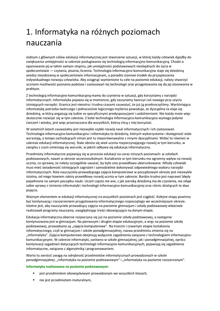 1. Informatyka na różnych poziomach nauczania Informa tyka a technologia in for macyjna Jednym z głównych celów edukacji informatycznej jest stworzenie sytuacji, w której każdy człowiek dążyłby do zwiększenia umiejętności w zakresie posługiwania się technologią informacyjno-komunikacyjną. Chodzi o opanowanie jej w takim samym stopniu, jak umiejętności podstawowych niezbędnych do życia w społeczeństwie — czytania, pisania, liczenia. Technologia informacyjno-komunikacyjna staje się dziedziną wiedzy nieodzowną w społeczeństwie informacyjnym, a ponadto stanowi środek do przyspieszenia indywidualnego rozwoju człowieka. Aby osiągnąć wymienione tu cele na poziomie edukacji, należy stworzyć uczniom możliwości poznania podstaw i zastosowań tej technologii oraz przygotowania się do jej stosowania w praktyce. Z technologią informacyjno-komunikacyjną mamy do czynienia w sytuacji, gdy korzystamy z narzędzi informatycznych. Informatyka pojawia się w momencie, gdy zaczynamy tworzyć coś nowego przy użyciu istniejących narzędzi. Granica jest nieostra i trudno czasami zauważyć, że już ją przekroczyliśmy. Wyróżniająca informatykę potrzeba twórczego i jednocześnie logicznego myślenia powoduje, że dyscyplina ta staje się dziedziną, w którą angażują się ludzie ze specyficznymi predyspozycjami i uzdolnieniami. Nie każdy może więc skutecznie rozwijać się w tym zakresie. Z kolei technologia informacyjno-komunikacyjna wymaga jedynie ćwiczeń i wiedzy, jest więc przeznaczona dla wszystkich, którzy chcą z niej korzystać. W ostatnich latach zauważalny jest niezwykle szybki rozwój nauk informatycznych i ich zastosowań. Technologia informacyjno-komunikacyjna i informatyka to dziedziny, których wykorzystanie i dostępność stale wzrastają, a tempo zachodzących zmian jest tu nieporównywalne z innymi dyscyplinami. Widać to również w zakresie edukacji informatycznej. Stale obniża się wiek ucznia rozpoczynającego rozwój w tym kierunku, w związku z czym zmieniają się warunki, w jakich odbywa się edukacja informatyczna. Przedmioty informatyczne pojawiają się w procesie edukacji na coraz niższych poziomach: w szkołach podstawowych, nawet w okresie wczesnoszkolnym. Kształcenie w tym kierunku ma ogromny wpływ na rozwój ucznia, co sprawia, że należy szczególnie uważać, by było ono prawidłowo ukierunkowane. Młody człowiek musi mieć świadomość istniejących zagrożeń i samodzielnie dokonywać odpowiedniego wyboru narzędzi informatycznych. Rola nauczyciela prowadzącego zajęcia komputerowe w początkowym okresie jest niezwykle istotna, od niego bowiem zależy prawidłowy rozwój ucznia w tym zakresie. Bardzo trudno jest naprawić błędy popełnione na samym początku nauki. Uczeń często nie wie, z jak szeroką dziedziną ma do czynienia, nie zdaje sobie sprawy z istnienia informatyki i technologii informacyjno-komunikacyjnej oraz różnic dzielących te dwa pojęcia. Ważnym elementem w edukacji informatycznej na wszystkich poziomach jest ciągłość. Kolejne etapy powinny być kontynuacją i rozszerzeniem przygotowania informatycznego rozpoczętego we wcześniejszym okresie. Istotne jest, aby nauczyciele prowadzący zajęcia na poziomie gimnazjum i szkoły podstawowej właściwie realizowali programy nauczania, uwzględniając treści obowiązujące na danym etapie. Edukacja informatyczna obecnie rozpoczyna się już na poziomie szkoły podstawowej, a następnie kontynuowana jest w gimnazjum. Na pierwszym i drugim etapie edukacyjnym, a więc na poziomie szkoły podstawowej, prowadzone są „zajęcia komputerowe”. Na trzecim i czwartym etapie kształcenia informatycznego, czyli w gimnazjum i szkole ponadgimnazjalnej, nazwa przedmiotu zmienia się na „informatyka”. Zajęcia komputerowe obejmują wyłącznie zagadnienia związane z technologiami informacyjnokomunikacyjnymi. W zakresie informatyki, zarówno w szkole gimnazjalnej, jak i ponadgimnazjalnej, oprócz kontynuacji zagadnień dotyczących technologii informacyjno-komunikacyjnych, pojawiają się zagadnienia informatyczne, związane z algorytmiką i programowaniem. Warto tu zwrócić uwagę na odrębność przedmiotów informatycznych prowadzonych w szkole ponadgimnazjalnej: „informatyka na poziomie podstawowym” i „informatyka na poziomie rozszerzonym”. Informatyka realizowana na poziomie podstawowym: jest przedmiotem obowiązkowym prowadzonym we wszystkich klasach, nie jest przedmiotem maturalnym, stanowi poziom podstawowy dla przedmiotu „informatyka na poziomie rozszerzonym”, a więc wchodzi w zakres wymagań maturalnych tego przedmiotu. Informatyka prowadzona na poziomie rozszerzonym: nie jest przedmiotem obowiązkowym, a więc realizowana jest wyłącznie w klasach, w których zaplanowano rozszerzenie edukacji informatycznej przez dodanie tego przedmiotu, jest przedmiotem maturalnym znajdującym się w grupie przedmiotów dodatkowych, stąd egzamin maturalny z informatyki można zdawać wyłącznie na poziomie rozszerzonym. 2. Charakterystyka i założenia programu Program nauczania realizowany w klasach przygotowujących ucznia szkoły ponadgimnazjalnej do egzaminu maturalnego z informatyki musi obejmować materiał obowiązujący na takim egzaminie oraz pracę z uczniem w zakresie rozwoju jego samodzielnego i twórczego myślenia, rozwiązywania problemów, konstruowania algorytmów. W konsekwencji absolwenci tych klas powinni być dobrze przygotowani do studiów informatycznych i innych w dziedzinie nauk ścisłych. Przedstawiony tu program zawiera materiał przeznaczony dla szkół ponadgimnazjalnych. Został on tak dobrany, aby przygotować ucznia do kontynuacji nauki na studiach wyższych. Realizacja programu powinna pomóc mu w podjęciu decyzji o kontynuowaniu nauki oraz wyborze kierunku studiów. Duży nacisk położono więc na takie zagadnienia jak: stosowanie podejścia algorytmicznego przy rozwiązywaniu problemów 