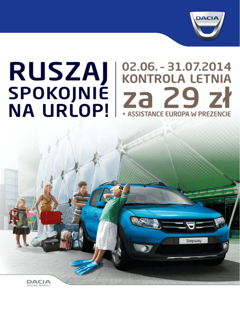 RUSZAJ 02.06. – 31.07.2014 KONTROLA LETNIA NA URLOP! + ASSISTANCE EUROPA w prezencie SPOKOJNIE za 29 zł KONTROLA LETNIA, ABY MÓC CIESZYĆ SIĘ BEZPIECZNYM URLOPEM Za 29 zł sprawdzimy 15 istotnych elementów w Twoim samochodzie a w prezencie otrzymasz ASSISTANCE EUROPA na okres wakacji* ! PROFESJONALNA OBSŁUGA - TO TWOJE BEZPIECZEŃSTWO NA DRODZE RABAT PROMOCYJNY 20% NA WYBRANE CZĘŚCI : • hamulce • zawieszenie • amortyzatory 7 4 3 6 1 5 2 1 Hamulce • Sprawdzenie stanu klocków i zużycia tarcz hamulcowych • Sprawdzenie poziomu płynu i szczelności układu hamulcowego 2 Zawieszenie • Sprawdzenie luzów w układzie zawieszenia i kierowniczym 3 Opony • Sprawdzenie / regulacja ciśnienia w oponach • Sprawdzenie stanu opon / zużycia bieżnika • Sprawdzenie ciśnienia w kole zapasowym / daty ważności zestawu do naprawy opon 4 Widoczność •S prawdzenie zużycia piór wycieraczek • Sprawdzenie poziomu płynu do spryskiwaczy •S prawdzenie przedniej szyby i lusterek bocznych •S prawdzenie zewnętrzne / wewnętrzne oświetlenia i sygnalizacji hamulce z rabatem 20%: 5 Klimatyzacja •S prawdzenie działanie klimatyzacji Klocki hamulcowe 6 Silnik •S prawdzenie poziomu oleju w silniku •S prawdzenie działania układu chłodzenia •S prawdzenie poziomu płynu chłodzenia SANDERO LODGY od 163 zł DOKKER od 189 zł LODGY DUSTER od 189 zł 7 GAŚNICA •S prawdzenie daty ważności gaśnicy *Cena kontroli zawiera podatek VAT i usługę Assistance. Oferta Assistance Europa przeznaczona jest dla samochodów Dacia po okresie gwarancji. Dla samochodów objętych gwarancją lub mających aktywną umowę Formuła Non Stop przeznaczona jest oferta Assistance Komfort. Więcej informacji uzyskasz w Serwisie Dacia. Rabaty obowiązują w przypadku zastosowania oryginalnych części zamiennych i nie dotyczą części Motrio. 203 zł 236 zł 236 zł AKCESORIA LETNIE – DLA TWOJEGO KOMFORTU Rabat promocyjny 20% na wybrane akcesoria letnie: RABAT 20 % •bagażniki dachowe • bagażniki rowerowe • haki holownicze • lodówki podręczne • wkłady do bagażnika DVD Lenco DVP-937 Tablet Lenco Cartab-925 Przenośny odtwarzacz 9” z bezprzewodowymi słuchawkami oraz uchwytem do mocowania na zagłówku. 549 zł! Z ekranem 9” i uchwytem do mocowania na zagłówku. 649 zł! Teraz w promocyjnej cenie: Teraz za jedyne Pieczątka Autoryzowanego Partnera Dacia Infolinia Dacia – tel. 22 575 94 44 Szczegółowe informacje w wybranych serwisach Dacia lub na www.dacia.pl Wszystkie podane ceny zawierają VAT i są cenami zalecanymi przez Renault Polska. Podana cena zawiera podatek VAT oraz usługę Assistance. Kontrola nie zastępuje przeglądu okresowego. Promocja jest ważna w okresie od 2.06.2014 r. do 31.07.2014 r. Szczegółowe informacje dotyczące promocji można uzyskać u wybranych Partnerów Dacia biorących udział w promocji. Podane w ulotce informacje są zaproszeniem do zawarcia umowy i nie stanowią oferty handlowej w rozumieniu Kodeksu Cywilnego.