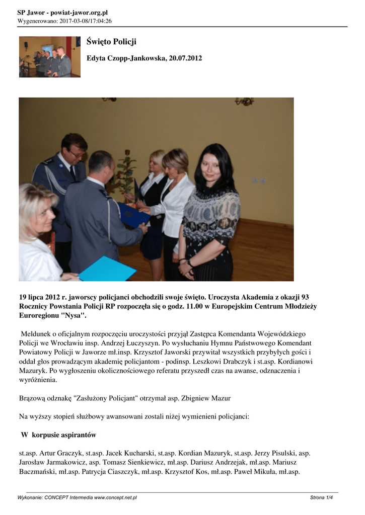 SP Jawor - powiat-jawor.org.pl Wygenerowano: 2017-03-08/17:04:26 Święto Policji Edyta Czopp-Jankowska, 20.07.2012 19 lipca 2012 r. jaworscy policjanci obchodzili swoje święto. Uroczysta Akademia z okazji 93 Rocznicy Powstania Policji RP rozpoczęła się o godz. 11.00 w Europejskim Centrum Młodzieży Euroregionu "Nysa". Meldunek o oficjalnym rozpoczęciu uroczystości przyjął Zastępca Komendanta Wojewódzkiego Policji we Wrocławiu insp. Andrzej Łuczyszyn. Po wysłuchaniu Hymnu Państwowego Komendant Powiatowy Policji w Jaworze mł.insp. Krzysztof Jaworski przywitał wszystkich przybyłych gości i oddał głos prowadzącym akademię policjantom - podinsp. Leszkowi Drabczyk i st.asp. Kordianowi Mazuryk. Po wygłoszeniu okolicznościowego referatu przyszedł czas na awanse, odznaczenia i wyróżnienia. Brązową odznakę "Zasłużony Policjant" otrzymał asp. Zbigniew Mazur Na wyższy stopień służbowy awansowani zostali niżej wymienieni policjanci: W korpusie aspirantów st.asp. Artur Graczyk, st.asp. Jacek Kucharski, st.asp. Kordian Mazuryk, st.asp. Jerzy Pisulski, asp. Jarosław Jarmakowicz, asp. Tomasz Sienkiewicz, mł.asp. Dariusz Andrzejak, mł.asp. Mariusz Baczmański, mł.asp. Patrycja Ciaszczyk, mł.asp. Krzysztof Kos, mł.asp. Paweł Mikuła, mł.asp. Wykonanie: CONCEPT Intermedia www.concept.net.pl Strona 1/4 SP Jawor - powiat-jawor.org.pl Wygenerowano: 2017-03-08/17:04:26 Mirosław Pierun, mł.asp. Paweł Tomaszczyk, sierż.sztab. Arkadiusz Graczyk, sierż.sztab. Dariusz Lewucha. Akty mianowania wręczył Z-ca Komendanta Wojewódzkiego insp. Andrzej Łuczyszyn i Komendant Powiatowy Policji w Jaworze, mł.insp. Krzysztof Jaworski. W korpusie podoficerów st.sierż. Paweł Bielak, st.sierż. Błażej Dudzic, st.sierż. Krzysztof Grządziel, st.sierż. Tomasz Staworko, sierż. Tomasz Choszowski, sierż. Krzysztof Dąbrowa, sierż. Jacek Gronczewski, sierż. Kamil Rawski, sierż. Magdalena Sokołowska. Akty mianowania wręczył Z-ca Komendanta Wojewódzkiego insp. Andrzej Łuczyszyn i Komendant Powiatowy Policji w Jaworze, mł.insp. Krzysztof Jaworski. W korpusie posterunkowych post. Łukasz Tereszkiewicz. Akt mianowania wręczył Z-ca Komendanta Wojewódzkiego insp. Andrzej Łuczyszyn i Komendant Powiatowy Policji w Jaworze, mł.insp. Krzysztof Jaworski, Komendant Powiatowy Policji w Jaworze, mł.insp. K. Jaworski wyróżnił listami gratulacyjnymi następujących pracowników Policji: Panią Agnieszkę Ferfecką, Panią Monikę Haraburda, Panią Dorotę Pruś. Uchwałą Zarządu Głównego NSZZ Policjantów odznaczeni zostali: Złotą odznaką asp.sztab. Wiesław Bojczuk Srebrną odznaką asp.sztab. Krzysztof Jacewicz, asp.sztab. Ireneusz Fuja, asp.sztab. Arkadiusz Loranty, asp.sztab. Łukasz Kubiś, asp. Stanisław Orda Brązową odznaką st.asp. Artur Kwolek, asp. Marek Stawiarski, mł.asp. Mariusz Baczmański, st.sierż. Krzysztof Łukaszczyk, sierż. Jacek Gronczewski. Uchwałą Zarządu Głównego NSZZ Policjantów nadane zostały Medale Honorowe za współpracę, które otrzymali: Pani poseł Elżbieta Witek, Pani Joanna Piżyk, Pani Alicja Żarnicka, Pan Bogusław Matuszewski, Pan Piotr Olchówka, Pan Szczepan Rojak. Na zakończenie akademii nastąpiło rozstrzygnięcie plebiscytu "Najpopularniejszy dzielnicowy 2012". Zaprezentowany został film przedstawiający sylwetki dzielnicowych KPP w Jaworze oraz pokazujący Wykonanie: CONCEPT Intermedia www.concept.net.pl Strona 2/4 SP Jawor - powiat-jawor.org.pl Wygenerowano: 2017-03-08/17:04:26 ich codzienną pracę. Po obejrzeniu filmu głos zabrał Starosta Jaworski Stanisław Laskowski, który ogłosił wyniki plebiscytu. Zwycięzcą został mł.asp. Leszek Niewiadomski, II miejsce zajął mł.asp. Krzysztof Kos, a na III miejscu uplasował się asp. Jarosław Plewiński. Laureaci plebiscytu otrzymali nagrody ufundowane przez samorządy powiatu jaworskiego. Najpopularniejszy dzielnicowy wylosował trzech mieszkańców powiatu jaworskiego, którzy głosowali w plebiscycie i otrzymają nagrody na najbliższej sesji Rady Powiatu. Uroczystą Akademię zakończył Komendant Powiatowy Policji w Jaworze, zapraszając zebranych gości na okolicznościowy poczęstunek. Wykonanie: CONCEPT Intermedia www.concept.net.pl Strona 3/4 SP Jawor - powiat-jawor.org.pl Wygenerowano: 2017-03-08/17:04:26 Wykonanie: CONCEPT Intermedia www.concept.net.pl Strona 4/4