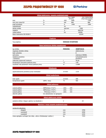 ZESPÓŁ PRĄDOTWÓRCZY FP 1000 Układ elektryczny zespołu prądotwórczego moc 3~ moc przy cosφ 0,8 3~ prąd szczytowy 3~ moc ciągła (P.R.P.) 1000 kVA kW A Hz obr/min V On częstotliwość obroty silnika napięcie rodzaj paliwa moc maksymalna (Fuel stop power) 1100 800 880 1440 1584 50 1500 400/230 EN590 klasa wykonania ISO 8528-5 G3/G4 Prądnica Typ prądnicy NEWAGE STAMFORD Dane techniczne silnika napędowego typ silnika PERKINS 4008TAG2A regulacja obrotów silnika elektroniczna ilość cylindrów 8 cykl pracy czterosuw DIESEL zasilanie powietrza +chłodnica turbodoładowanie powietrza całkowita pojemność skokowa temperatura otoczenia podczas pracy wysokość nad poziomem morza podczas pracy l °C m ≤40 m³/min 1110 m³/min °C 200 30,56 ≤1000 Chłodzenie zapotrzebowanie powietrza przez wentylator Układ wydechowy ilość spalin temperatura spalin 100% mocy 465 Układ paliwowy zużycie paliwa 100%mocy ( F.S.P ) (l/h) 229 zużycie paliwa 100%mocy ( P.R.P ) (l/h) 215 zużycie paliwa 75%mocy ( P.R.P ) (l/h) 153 zbiornik paliwa nie zabudowany na agregacie Układ elektryczny silnika zasilanie silnika ( biegun ujemny na obudowie ) V 24 Wymiary i masa zespołu prądotwórczego wersja do zabudowy - długość mm 4790 - szerokość mm 2036 - wysokość mm 2235 kg 7334 masa agregatu suchego( bez oleju , płynu chłodzącego i paliwa ) ZESPÓŁ PRĄDOTWÓRCZY FP 1000 Strona 1 z 2 wersja obudowana wyciszona - długość mm 6058 - szerokość mm 2438 - wysokość mm 2896 kg 9943 masa agregatu suchego( bez oleju , płynu chłodzącego i paliwa ) Połączenia elektryczne sterowania oraz odbioru mocy z zespołu prądotwórczego Połączenie pod automatykę startu odbiór mocy z agregatu ( giętka linka ) zacisk śrubowy mm² max połączenie dla automatyki SZR zewnętrznej zacisk śrubowy mm² max 16 x 2,5 połączenie do zasilania grzałki zacisk śrubowy mm² max 5 x 2,5 max 4 x 5 x 240 4 x 5 x 240 odbiór mocy przy zespole prądotwórczym sterowanym ręcznie – do zabudowy odbiór mocy z agregatu ( giętka linka ) zacisk śrubowy mm² odbiór mocy przy zespole prądotwórczym sterowanym ręcznie – zabudowany wyciszony odbiór mocy z agregatu ( giętka linka ) zacisk śrubowy mm² max 4 x 5 x 240 Prime power (P.R.P.)-ISO 8528 : (moc podstawowa) – jest to max. dostępna moc podczas jednego zmiennego cyklu , która może być odbierana między zalecanymi przerwami konserwacyjnymi przez nieograniczoną liczbę godzin. W ciągu 24 godzin nie powinno się odbierać więcej niż 80 % P.R.P. 10 % przeciążenia tylko podczas regulacji. Max. Stand-by power (ISO 3046 Fuel stop power) : (moc awaryjna) – jest to max. moc jaką może osiągnąć agregat pracując pod zmiennym obciążeniem nie dłużej niż sumarycznie 500 godzin rocznie z uwzględnieniem następujących ograniczeń : - 100 % obciążenia w ciągu 25 godzin rocznie - 90 % obciążenia w ciągu 200 godzin rocznie Przeciążenie jest niedopuszczalne. Należy stosować przy braku napięcia sieciowego przy niezawodnej sieci elektryczne Dane wstępne – mogą ulec zmianie ZESPÓŁ PRĄDOTWÓRCZY FP 1000 Strona 2 z 2
