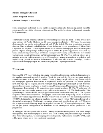 Rynek energii: Ukraina Autor: Wojciech Kwinta („Polska Energia” – nr 9/2010) Mimo znacznych nadwyżek mocy, elektroenergetyka ukraińska boryka się jednak z problemami, przede wszystkim wiekową infrastrukturą. Nie jest też w stanie wykorzystać potencjału eksportowego. Terytorium Ukrainy obejmuje obszar o powierzchni ponad 603 tys. km2 – to kraj prawie dwa razy większy od Polski. Ma też o ok. 20 proc. więcej mieszkańców – 45,7 mln. Konsumpcja elektryczności na osobę jest podobna jak nad Wisłą, jednak Ukraina to państwo znacznie uboższe. Nasz wschodni sąsiad boleśnie odczuł światowy kryzys gospodarczy: PKB w 2009 r. spadło o ok. 15 proc. Ta sytuacja odbiła się także na elektroenergetyce, która wytworzyła o prawie 10 proc. mniej energii elektrycznej niż w 2009 r. Po pierwszej połowie roku 2010 sytuacja zaczyna się poprawiać, a produkcja i zużycie znów rosną. Zainstalowana moc źródeł wytwarzania energii elektrycznej na Ukrainie przekracza 52 GW. To o połowę więcej niż w polskim systemie elektroenergetycznym. Z formalnego punktu widzenia są to pokaźne nadwyżki mocy, jednak archaiczna infrastruktura i wiekowe elektrownie powodują, że duża część bloków energetycznych nie jest wykorzystywana i wymaga remontów. Wytwarzanie Na ponad 52 GW mocy składają się przede wszystkim elektrownie cieplne i elektrociepłownie, zasilane gazem ziemnym lub węglem. To ok. 64 proc. całości. 26 proc. przypada na elektrownie atomowe, a ok. 9 proc. na wodne. Prawie połowę energii elektrycznej dostarcza jednak energetyka jądrowa. Elektrownie w większości należą do państwa – w rękach prywatnych znajduje się ok. 11 proc. zainstalowanych mocy. Pięć najważniejszych spółek dysponujących elektrowniami cieplnymi to Centrenergo, Donbasenergo, Dniproenergo, Skhidenergo i Zahidenergo. Ich majątek to 14 jednostek o mocy przekraczającej 27 GW. W państwowych rękach jest cała energetyka jądrowa: cztery elektrownie o mocy 13,8 GW. Dwie spółki, Ukrhydroenergo i Dniester HPSP, zarządzają elektrowniami wodnymi o mocy ok. 5 GW. System uzupełnia zbiór elektrociepłowni. Energetyka odnawialna ma marginalny wkład w wytwarzanie. Sprowadza się praktycznie do farm wiatrowych, których moc na razie nie przekracza 100 MW. Potencjalnie na Ukrainie mogłoby powstać nawet 16 tys. MW zainstalowanych w siłowniach wiatrowych. Możliwości energetyki słonecznej określa się na ok. 16 TWh rocznie, a wykorzystanie biomasy mogłoby przynieść rocznie 82 TWh energii elektrycznej. Ukraina nie jest jednak zobligowana do wdrażania takich rozwiązań i trudno przesądzać o ich przyszłości. W ubiegłym roku wszystkie elektrownie Ukrainy wyprodukowały prawie 173 TWh energii elektrycznej. Rok wcześniej było to prawie 192 TWh. Według danych ukraińskiego Ministerstwa Paliw i Energetyki, w pierwszym półroczu tego roku wytworzono ponad 93 TWh, czyli o 11,1 proc. więcej niż w tym czasie rok wcześniej. Wiekowa infrastruktura Głównym problemem elektroenergetyki jest wiek bloków energetycznych w elektrowniach cieplnych. 80 proc. dawno przekroczyło 30 lat użytkowania. Ponad połowa przepracowała już 200 tys. godzin, a 95 proc. – 100 tys. Duża część elektrowni za ok. pięć lat powinna zakończyć działalność. W przypadku elektrowni atomowych okres zakończenia działalności rozłoży się w czasie na lata 2011-2030. Plany modernizacji i odbudowy mocy ujęto w trzech dokumentach – kończącym się Narodowym Programie Energetycznym, w planie renowacji elektrowni cieplnych i Strategii Energetycznej Ukrainy do 2030 r. Brakuje w nich określenia sposobów modernizacji systemu i wskazania źródeł finansowania. Receptą mają być podwyżki taryf i dalsza prywatyzacja, jednak problemy finansowe są wciąż poważnym zagrożeniem dla przyszłości elektroenergetyki. Energorynok, państwowy operator rynku hurtowego, jest poważnie zadłużony, niebezpiecznie wysoki jest też poziom nieregulowanych rachunków przez odbiorców indywidualnych. Mimo wzrostu taryf w ostatnich latach, w przypadku gospodarstw domowych wciąż nie pokrywają one kosztów wytwarzania i dostawy. Przesył i dystrybucja System przesyłowy Ukrainy liczy w sumie ponad 22 tys. km. W jego skład wchodzi 4115 km linii 750 kV, 375 km linii 500 kV, 340 km linii 400 kV, 13 tys. km linii 330 kV i 4170 km linii 220 kV. Operatorem sieci przesyłowej i połączeń transgranicznych jest państwowa spółka NEC Ukrenergo. Dystrybucją energii elektrycznej zajmuje się 27 spółek obejmujących 24 firm regionalnych, dwie miejskie obsługujące Kijów i Sewastopol oraz jedna dostarczająca elektryczność Autonomicznej Republice Krymskiej. Dodatkowo istnieje grupa dostawców niezależnych dla odbiorców niepodlegających taryfom regulowanym. Przede wszystkim są to podmioty przemysłowe kupujące energię elektryczną na własne potrzeby. Dostawcy niezależni mogą korzystać z krajowych sieci dystrybucyjnych. W rękach prywatnych jest 40 proc. spółek dystrybucyjnych, a dodatkowo niektóre państwowe sieci rozdzielcze mają prywatnych operatorów. Straty przesyłowe na Ukrainie wynoszą 14-15 proc. Ich ograniczenie wymaga kosztownych inwestycji w sieci przesyłowe i dystrybucyjne. Ukraina posiada połączenie transgraniczne ze wszystkimi sąsiadami (Rosją, Mołdawią, Białorusią, Polską, Słowacją, Węgrami i Rumunią), jednak przesył elektryczności do europejskiego systemu UCTE może się odbywać wyłącznie z elektrowni zlokalizowanych w zachodniej Ukrainie. Zdolność przesyłowa wynosi 550 MW. Ukraiński eksport spada – w 2008 r. wyniósł 7,7 TWh, w ubiegłym roku tylko ok. 4 TWh. W pierwszym półroczu tego roku wyeksportowano 2,1 TWh, a trzy czwarte energii elektrycznej trafiło na Białoruś. Rynek energii Regulacją rynku energii elektrycznej zajmuje się Narodowy Urząd Regulacji Elektroenergetyki (NERC), powstały w 1994 r., kiedy rozpoczęła się restrukturyzacja