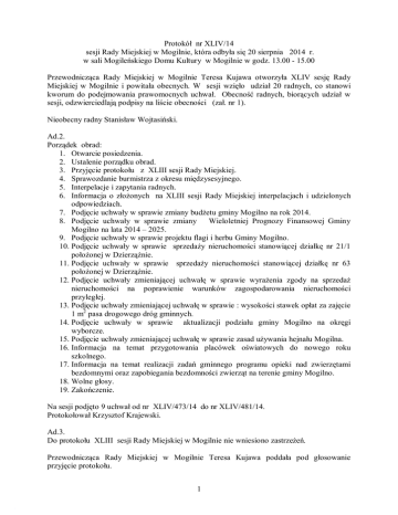 Protokół nr XLIV/14 sesji Rady Miejskiej w Mogilnie, która odbyła się 20 sierpnia 2014 r. w sali Mogileńskiego Domu Kultury w Mogilnie w godz. 13.00 - 15.00 Przewodnicząca Rady Miejskiej w Mogilnie Teresa Kujawa otworzyła XLIV sesję Rady Miejskiej w Mogilnie i powitała obecnych. W sesji wzięło udział 20 radnych, co stanowi kworum do podejmowania prawomocnych uchwał. Obecność radnych, biorących udział w sesji, odzwierciedlają podpisy na liście obecności (zał. nr 1). Nieobecny radny Stanisław Wojtasiński. Ad.2. Porządek obrad: 1. Otwarcie posiedzenia. 2. Ustalenie porządku obrad. 3. Przyjęcie protokołu z XLIII sesji Rady Miejskiej. 4. Sprawozdanie burmistrza z okresu międzysesyjnego. 5. Interpelacje i zapytania radnych. 6. Informacja o złożonych na XLIII sesji Rady Miejskiej interpelacjach i udzielonych odpowiedziach. 7. Podjęcie uchwały w sprawie zmiany budżetu gminy Mogilno na rok 2014. 8. Podjęcie uchwały w sprawie zmiany Wieloletniej Prognozy Finansowej Gminy Mogilno na lata 2014 – 2025. 9. Podjęcie uchwały w sprawie projektu flagi i herbu Gminy Mogilno. 10. Podjęcie uchwały w sprawie sprzedaży nieruchomości stanowiącej działkę nr 21/1 położonej w Dzierzążnie. 11. Podjęcie uchwały w sprawie sprzedaży nieruchomości stanowiącej działkę nr 63 położonej w Dzierzążnie. 12. Podjęcie uchwały zmieniającej uchwałę w sprawie wyrażenia zgody na sprzedaż nieruchomości na poprawienie warunków zagospodarowania nieruchomości przyległej. 13. Podjęcie uchwały zmieniającej uchwałę w sprawie : wysokości stawek opłat za zajęcie 1 m2 pasa drogowego dróg gminnych. 14. Podjęcie uchwały w sprawie aktualizacji podziału gminy Mogilno na okręgi wyborcze. 15. Podjęcie uchwały zmieniającej uchwałę w sprawie zasad używania hejnału Mogilna. 16. Informacja na temat przygotowania placówek oświatowych do nowego roku szkolnego. 17. Informacja na temat realizacji zadań gminnego programu opieki nad zwierzętami bezdomnymi oraz zapobiegania bezdomności zwierząt na terenie gminy Mogilno. 18. Wolne głosy. 19. Zakończenie. Na sesji podjęto 9 uchwał od nr XLIV/473/14 do nr XLIV/481/14. Protokołował Krzysztof Krajewski. Ad.3. Do protokołu XLIII sesji Rady Miejskiej w Mogilnie nie wniesiono zastrzeżeń. Przewodnicząca Rady Miejskiej w Mogilnie Teresa Kujawa poddała pod głosowanie przyjęcie protokołu. 1 W wyniku głosowania 20 głosami za, przeciwko 0, wstrzymujących się, 0 protokół przyjęty. został Ad.4. Radny Stanisław Redmann powiedział, że na 24.07.2014 r. było zaplanowane spotkanie burmistrza Mogilna Leszka Duszyńskiego, starosty Mogileńskiego Tomasza Barczaka i dyrektora Zarządu Dróg Wojewódzkich w Bydgoszczy Mirosława Kielnika. Poprosił o informację na temat tego spotkania. Radna Alina Dobersztyn powiedziała, że burmistrz brał udział w spotkaniu z przedstawicielami włoskiej firmy. Zapytała, jaki był finał spotkania i gdzie ma mieć miejsce przetwarzanie odpadów komunalnych. Burmistrz Mogilna Leszek Duszyński odpowiadając na pytanie radnego Stanisława Redmanna poinformował, że spotkanie dotyczyło budowy chodnika w Marcinkowie, przy drodze wojewódzkiej nr 262. Stwierdził, że inicjatywa w sprawie inwestycji leży zawsze po stronie właściciela drogi, w tym wypadku po stronie Urzędu Marszałkowskiego. Przypomniał, że razem z Wicestarostą Mogileńskim Tadeuszem Szymańskim i radnym Stanisławem Redmannem, jakiś czas temu byli na spotkaniu w Zarządzie Dróg Wojewódzkich w Bydgoszczy, gdzie ustalono, że gmina Mogilno wykona projekt budowy chodnika w ciągu drogi wojewódzkiej w Marcinkowie. Projekt został wykonany. Podczas wykonywania projektu trwały konsultacje, w czasie których sugerowano nam jaka ma być nawierzchnia, przepusty itd. Doszło także wreszcie do spotkania u pana Starosty z dyrektorem Zarządu Dróg Wojewódzkich w Bydgoszczy Mirosławem Kielnikiem. Koszt inwestycji to ponad 900 tys. zł. Według dyrektora Mirosława Kielnika byłby to najdroższy chodnik w Województwie Kujawsko - Pomorskim. Zarząd Dróg Wojewódzkich w dalszym ciągu chce realizować tę inwestycję przy zaangażowaniu środków gminy i powiatu. Przypomniał, że gmina partycypuje w kosztach budowy chodników przy drogach powiatowych. Jako przykład podał chodnik z Mogilna do Padniewka i z Mogilna do Świerkówca oraz szereg innych inwestycji w latach poprzednich. Ma dojść do kolejnego spotkania z projektantami, w celu obniżenia kosztów inwestycji. Decyzja w sprawie budowy chodnika należy do Zarządy Dróg Wojewódzkich. Nie wyklucza się, że inwestycja będzie podzielona na dwa etapy. Odpowiadając na pytanie radnej Aliny Dobersztyn powiedział, że organizatorem spotkania z przedstawicielami firmy włoskiej było starostwo. W spotkaniu uczestniczyli włodarze wszystkich gmin Powiatu Mogileńskiego, przedstawiciel Urzędu Marszałkowskiego w Toruniu oraz Wicemarszałek Województwa Kujawsko-Pomorskiego Dariusz Kurzawa. Na spotkaniu przedstawiciele włoskiej firmy przedstawili swoją propozycję dotyczącą segregacji i przetwarzania odpadów komunalnych i przemysłowych. Dodał, że firma jest zainteresowana realizacją inwestycji w gminie Jeziora Wielkie. Zaproszono uczestników spotkania do złożenia wizyty we Włoszech, gdzie zobaczylibyśmy jak funkcjonuje to przedsiębiorstwo. Ad.5. Radny Łukasz Drzazgowski po raz kolejny poruszył kwestię przebudowy kanalizacji deszczowej od ulicy 11 Listopada do ulicy Padniewskiej. Zaproponował, by wykonać chociaż część inwestycji, w taki sposób, by woda wylewała się na łąkę, a nie na działki. Poinformował, że razem z radnym Ryszardem Strzeleckim byli u pana Śmigielskiego, który 2 wyraził zgodę na wejście na swoją nieruchomość w celu wykonana niezbędnych prac. Zapytał, na jakim etapie są prace związane z wyczyszczeniem przepustu pod torami PKP. Radna Iwona Golis w imieniu mieszkańców podziękowała burmistrzo