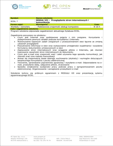 Symbol: Nazwa szkolenia: ECDL 7 MODUŁ VII – Przeglądanie stron internetowych i komunikacja Forma zajęć: Wymagania: Wykłady i warsztaty - Podstawowa znajomość obsługi komputera Czas: 8-16 h Cele i zagadnienia szkolenia: Program szkolenia odpowiada zagadnieniom aktualnego Sylabusa ECDL. Zagadnienia poruszane na szkoleniu: Czym jest Internet oraz podstawowe pojęcia z nim związane. Korzystanie i podejmowanie pewnych działań podczas korzystania z Internetu Wykonywanie topowych zadań związanych z przeszukiwaniem sieci łącznie ze zmianą ustawień przeglądarki Poszukiwanie informacji w sieci oraz wykazywanie umiejętności wypełniania i wysyłania formularzy dokumentów umieszczonych w sieci Zapisywanie stron internatowych oraz sciąganie plików z Internetu, jak również kopiowanie zawartości stron internetowych do dokumentu Czym jest e-mail oraz znajomość wad i zalet używania tego sposobu komunikacji, jak również znać inne metody komunikacji Wykaz się znajomością zasad dobrego wychowania (etykiety) i wymogów dotyczących bezpiecznego korzystania z poczty elektronicznej Tworzenie, sprawdzanie poprawności językowej i wysyłanie e-mail. Odpowiadanie na email, przesyłanie dalej, załączenie plików, drukowanie Sposoby zwiększenia wydajności pracy podczas pracy z oprogramowaniem poczty elektronicznej. Organizowanie i zarządzanie przesyłkami e-mail Szkolenie kończy się próbnym egzaminacyjnego ECDL. PC Open Sp. z o.o. Wojska Polskiego 120 95-070 Aleksandrów Ł. egzaminem z MODUŁU www.pcopen.pl [email protected] tel./fax: 42 276 79 74 VII NIP: 7322170013 REGON: 101407249 oraz prezentacją sytemu KRS: 0000421064 Sąd Rejonowy dla Łódź Śródmieście w Łodzi