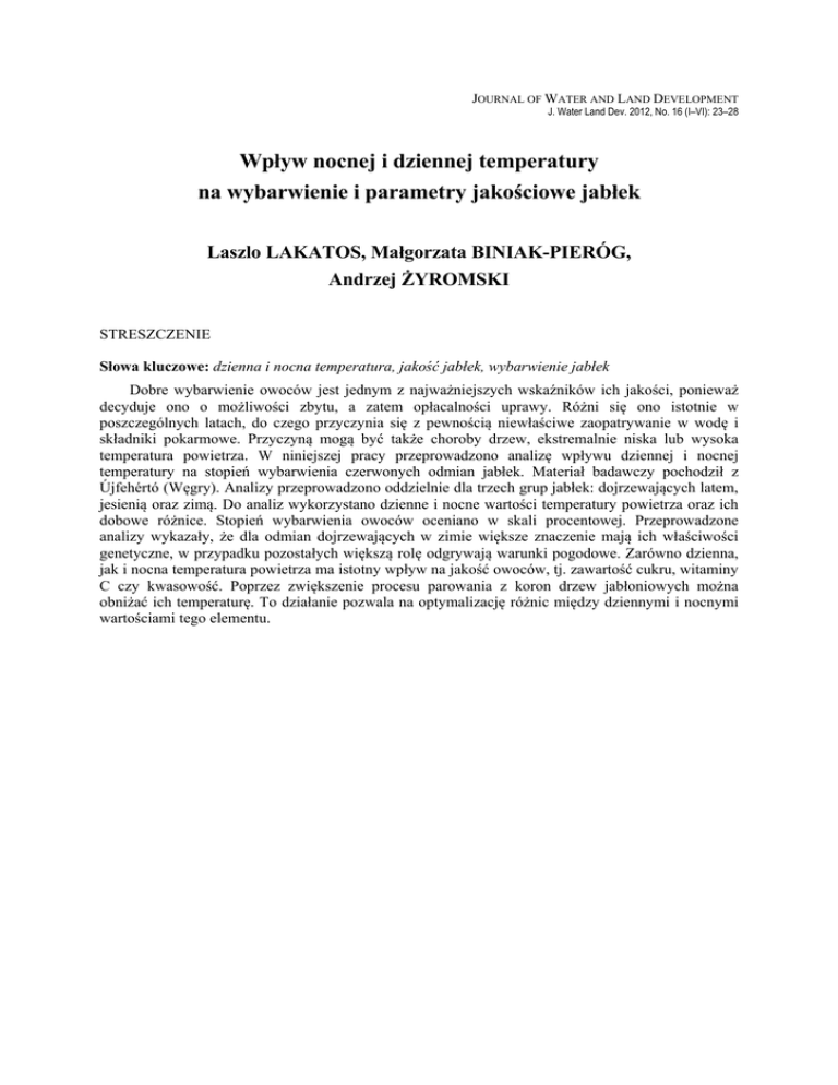 JOURNAL OF WATER AND LAND DEVELOPMENT J. Water Land Dev. 2012, No. 16 (I–VI): 23–28 Wpływ nocnej i dziennej temperatury na wybarwienie i parametry jakościowe jabłek Laszlo LAKATOS, Małgorzata BINIAK-PIERÓG, Andrzej ŻYROMSKI STRESZCZENIE Słowa kluczowe: dzienna i nocna temperatura, jakość jabłek, wybarwienie jabłek Dobre wybarwienie owoców jest jednym z najważniejszych wskaźników ich jakości, ponieważ decyduje ono o możliwości zbytu, a zatem opłacalności uprawy. Różni się ono istotnie w poszczególnych latach, do czego przyczynia się z pewnością niewłaściwe zaopatrywanie w wodę i składniki pokarmowe. Przyczyną mogą być także choroby drzew, ekstremalnie niska lub wysoka temperatura powietrza. W niniejszej pracy przeprowadzono analizę wpływu dziennej i nocnej temperatury na stopień wybarwienia czerwonych odmian jabłek. Materiał badawczy pochodził z Újfehértó (Węgry). Analizy przeprowadzono oddzielnie dla trzech grup jabłek: dojrzewających latem, jesienią oraz zimą. Do analiz wykorzystano dzienne i nocne wartości temperatury powietrza oraz ich dobowe różnice. Stopień wybarwienia owoców oceniano w skali procentowej. Przeprowadzone analizy wykazały, że dla odmian dojrzewających w zimie większe znaczenie mają ich właściwości genetyczne, w przypadku pozostałych większą rolę odgrywają warunki pogodowe. Zarówno dzienna, jak i nocna temperatura powietrza ma istotny wpływ na jakość owoców, tj. zawartość cukru, witaminy C czy kwasowość. Poprzez zwiększenie procesu parowania z koron drzew jabłoniowych można obniżać ich temperaturę. To działanie pozwala na optymalizację różnic między dziennymi i nocnymi wartościami tego elementu.