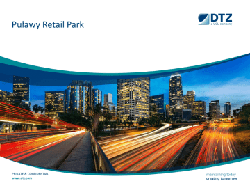 Puławy Retail Park PRIVATE & CONFIDENTIAL www.dtz.com COVER SLIDE: If you see this text, you must copy the ‘swish’ graphic from a pre-built COVER slide and onto this slide. This text will no longer be visible if done correctly. Puławy Puławy Puławy – miasto w zachodniej części województwa lubelskiego, położone nad Wisłą. Puławy sąsiadują z dwiema popularnymi miejscowościami turystycznymi – Kazimierzem Dolnym oraz Nałęczowem, wspólnie są określane mianem trójkąta turystycznego. W Puławach mieszczą się liczne zakłady przemysłowe głównie z sektora chemicznego, farmaceutycznego i budowlanego. Miasto jest także prężnym ośrodkiem naukowokulturalnym. W Puławach mieszczą się instytuty naukowe, centra badawczo-rozwojowe oraz uczelnie wyższe. Puławy zamieszkuje około 50.000 ludności, w tym około 61,7% jest w wieku produkcyjnym. Stopa bezrobocia w Puławach maleje i w maju 2012 r. wyniosła 11,8%. 1 Puławy Odległość od ważnych miast: Lublin – 50 km Radom – 65 km Warszawa – 125 km Siedlce – 132 km Biała Podlaska – 134 km 2 Location Lokalizacja przy ul. Dęblińskiej, która łączy obwodnicę miasta z jego centrum. Ulica Dęblińska krzyżuje się z drogą krajową nr 12 łączącą Łódź, Radom i Lublin. 5 minut jazdy z centrum miasta. 3 Strefa oddziaływania Puławy Retail Park Zasięg geograficzny stref oddziaływania parku handlowego Zostały zdefiniowane następujące strefy oparte na czasie dojazdu do przedmiotowej nieruchomości: • 0 - 10 minut – strefa I – 54.571 mieszkańców • 10 - 20 minut – strefa II – 33.146 mieszkańców • 20 - 30 minut – strefa III – 71.579 mieszkańców Całkowita strefa oddziaływania obejmuje około 159 296 mieszkańców. 4 Site plan Retail Park mieści się w sąsiedztwie całodobowego hipermarketu Tesco, marketu budowlanego Leroy Merlin oraz restauracji Mc Donald’s. Retail Park zaoferuje około 6.800 m kw. powierzchni. Otwarcie jest przewidziane na IV Q 2014. . . 5 Kontakt DTZ tel. +48 22 222 3000 Lumen / Złote Tarasy fax +48 22 222 3001 Złota 59 street [email protected] 00-120 Warsaw www.dtz.com/pl Edyta Paszkowska Senior Consultant, Retail Agency [email protected] + 48 22 22 23 078 + 48 (0) 668 224 117 6