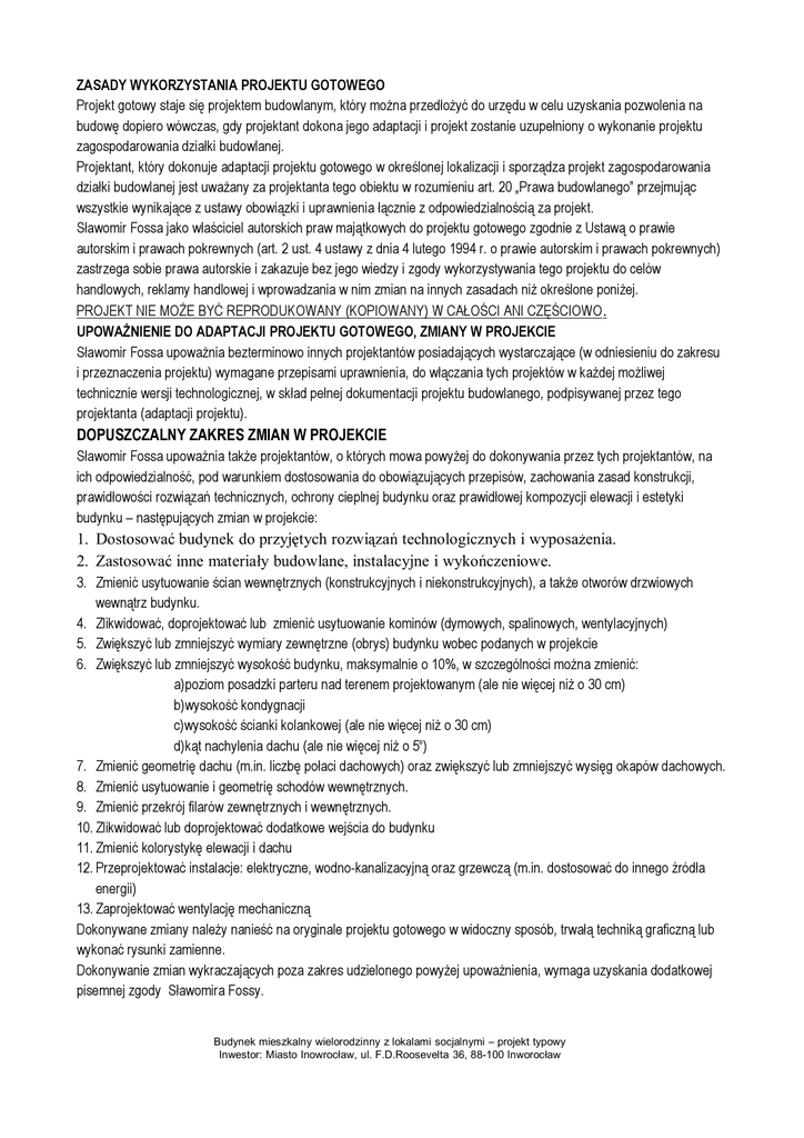 ZASADY WYKORZYSTANIA PROJEKTU GOTOWEGO Projekt gotowy staje się projektem budowlanym, który można przedłożyć do urzędu w celu uzyskania pozwolenia na budowę dopiero wówczas, gdy projektant dokona jego adaptacji i projekt zostanie uzupełniony o wykonanie projektu zagospodarowania działki budowlanej. Projektant, który dokonuje adaptacji projektu gotowego w określonej lokalizacji i sporządza projekt zagospodarowania działki budowlanej jest uważany za projektanta tego obiektu w rozumieniu art. 20 „Prawa budowlanego” przejmując wszystkie wynikające z ustawy obowiązki i uprawnienia łącznie z odpowiedzialnością za projekt. Sławomir Fossa jako właściciel autorskich praw majątkowych do projektu gotowego zgodnie z Ustawą o prawie autorskim i prawach pokrewnych (art. 2 ust. 4 ustawy z dnia 4 lutego 1994 r. o prawie autorskim i prawach pokrewnych) zastrzega sobie prawa autorskie i zakazuje bez jego wiedzy i zgody wykorzystywania tego projektu do celów handlowych, reklamy handlowej i wprowadzania w nim zmian na innych zasadach niż określone poniżej. PROJEKT NIE MOŻE BYĆ REPRODUKOWANY (KOPIOWANY) W CAŁOŚCI ANI CZĘŚCIOWO . UPOWAŻNIENIE DO ADAPTACJI PROJEKTU GOTOWEGO, ZMIANY W PROJEKCIE Sławomir Fossa upoważnia bezterminowo innych projektantów posiadających wystarczające (w odniesieniu do zakresu i przeznaczenia projektu) wymagane przepisami uprawnienia, do włączania tych projektów w każdej możliwej technicznie wersji technologicznej, w skład pełnej dokumentacji projektu budowlanego, podpisywanej przez tego projektanta (adaptacji projektu). DOPUSZCZALNY ZAKRES ZMIAN W PROJEKCIE Sławomir Fossa upoważnia także projektantów, o których mowa powyżej do dokonywania przez tych projektantów, na ich odpowiedzialność, pod warunkiem dostosowania do obowiązujących przepisów, zachowania zasad konstrukcji, prawidłowości rozwiązań technicznych, ochrony cieplnej budynku oraz prawidłowej kompozycji elewacji i estetyki budynku – następujących zmian w projekcie: 1. Dostosować budynek do przyjętych rozwiązań technologicznych i wyposażenia. 2. Zastosować inne materiały budowlane, instalacyjne i wykończeniowe. 3. Zmienić usytuowanie ścian wewnętrznych (konstrukcyjnych i niekonstrukcyjnych), a także otworów drzwiowych wewnątrz budynku. 4. Zlikwidować, doprojektować lub zmienić usytuowanie kominów (dymowych, spalinowych, wentylacyjnych) 5. Zwiększyć lub zmniejszyć wymiary zewnętrzne (obrys) budynku wobec podanych w projekcie 6. Zwiększyć lub zmniejszyć wysokość budynku, maksymalnie o 10%, w szczególności można zmienić: a)poziom posadzki parteru nad terenem projektowanym (ale nie więcej niż o 30 cm) b)wysokość kondygnacji c)wysokość ścianki kolankowej (ale nie więcej niż o 30 cm) d)kąt nachylenia dachu (ale nie więcej niż o 5o) 7. Zmienić geometrię dachu (m.in. liczbę połaci dachowych) oraz zwiększyć lub zmniejszyć wysięg okapów dachowych. 8. Zmienić usytuowanie i geometrię schodów wewnętrznych. 9. Zmienić przekrój filarów zewnętrznych i wewnętrznych. 10. Zlikwidować lub doprojektować dodatkowe wejścia do budynku 11. Zmienić kolorystykę elewacji i dachu 12. Przeprojektować instalacje: elektryczne, wodno-kanalizacyjną oraz grzewczą (m.in. dostosować do innego źródła energii) 13. Zaprojektować wentylację mechaniczną Dokonywane zmiany należy nanieść na oryginale projektu gotowego w widoczny sposób, trwałą techniką graficzną lub wykonać rysunki zamienne. Dokonywanie zmian wykraczających poza zakres udzielonego powyżej upoważnienia, wymaga uzyskania dodatkowej pisemnej zgody Sławomira Fossy. Budynek mieszkalny wielorodzinny z lokalami socjalnymi – projekt typowy Inwestor: Miasto Inowrocław, ul. F.D.Roosevelta 36, 88-100 Inworocław OBOWIĄZKOWY ZAKRES ADAPTACJI PROJEKTU GOTOWEGO Projektant (autor adaptacji) sporządzający projekt budowlany służący uzyskaniu pozwolenia na budowę, w ramach adaptacji projektu gotowego na ten cel jest zobowiązany spełnić wszystkie wymagania dotyczące projektów gotowych (przeznaczonych do wielokrotnego zastosowania) określone w przepisach aktualnych na dzień wykonania adaptacji, min. w Prawie Budowlanym i w Rozporządzeniu Ministra Infrastruktury w sprawie szczegółowego zakresu i formy projektu budowlanego. W szczególności w projekcie architektoniczno-budowlanym należy: ✔ Wykonać sprawdzenie i adaptację projektu dostosowującą do zmian w obowiązujących przepisach i normach, jakie wprowadzono po dacie wykonania projektu gotowego ✔ Dostosować projekt do warunków miejscowych i stref klimatycznych, w szczególności wykonać sprawdzenie lub przeliczenie konstrukcji budynku w zakresie jej dostosowania do obciążeń normatywnych wynikających ze strefy klimatycznej ✔ Wykonać adaptację fundamentów do lokalnych warunków gruntowych. Określić kategorię geotechniczną obiektu. ✔ Uzyskać wymagane przepisami uzgodnienia związane z docelowym przeznaczeniem obiektu i lokalizacją ✔ Podpisać projekt jako autor adaptacji budynku do konkretnej lokalizacji z podaniem rodzaju i numeru posiadanych uprawnień projektowych Ponadto do dokumentacji projektowej należy dołączyć: 1. Projekt zagospodarowania działki lub terenu 2. Kopię uprawnień zawodowych i kopię potwierdzenia przynależności do izby zawodowej autorów adaptacji 3. Oświadczenie autorów adaptacji o zgodności projektu z przepisami i zasadami wiedzy technicznej, aktualne na dzień wykonania adaptacji 4. Informację BIOZ 5. Sporządzić charakterystykę energetyczną obiektu budowlanego (dotyczy obiektów wymienionych w przepisach budowlanych) Budynek mieszkalny wielorodzinny z lokalami socjalnymi – projekt typowy Inwestor: Miasto Inowrocław, ul. F.D.Roosevelta 36, 88-100 Inworocław SPIS ZAWARTOŚCI PROJEKTU ARCHITEKTONICZNO - BUDOWLANEGO OŚWIADCZENIE PROJEKTANTÓW ZASADY WYKORZYSTANIA PROJEKTU GOTOWEGO DOPUSZCZALNY ZAKRES ZMIAN PROJEKTU GOTOW