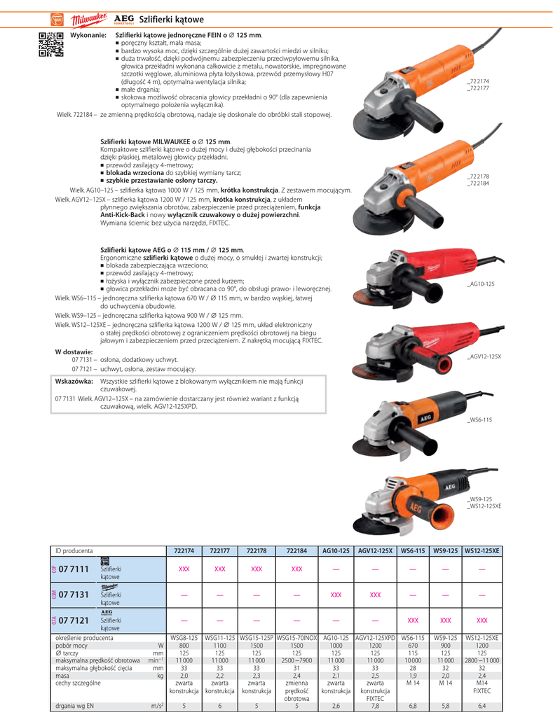 Szlifierki kątowe Szlifierki kątowe jednoręczne FEIN o ⌀ 125 mm. poręczny kształt, mała masa; bardzo wysoka moc, dzięki szczególnie dużej zawartości miedzi w silniku; duża trwałość, dzięki podwójnemu zabezpieczeniu przeciwpyłowemu silnika, głowica przekładni wykonana całkowicie z metalu, nowatorskie, impregnowane szczotki węglowe, aluminiowa płyta łożyskowa, przewód przemysłowy H07 (długość 4 m), optymalna wentylacja silnika; małe drgania; skokowa możliwość obracania głowicy przekładni o 90° (dla zapewnienia optymalnego położenia wyłącznika). Wielk. 722184 – ze zmienną prędkością obrotową, nadaje się doskonale do obróbki stali stopowej. Wykonanie: _72 2174 _72 2177 Szlifierki kątowe MILWAUKEE o ⌀ 125 mm. Kompaktowe szlifierki kątowe o dużej mocy i dużej głębokości przecinania dzięki płaskiej, metalowej głowicy przekładni. przewód zasilający 4-metrowy; blokada wrzeciona do szybkiej wymiany tarcz; szybkie przestawianie osłony tarczy. Wielk. AG10–125 – szlifierka kątowa 1000 W / 125 mm, krótka konstrukcja. Z zestawem mocującym. Wielk. AGV12–125X – szlifierka kątowa 1200 W / 125 mm, krótka konstrukcja, z układem płynnego zwiększania obrotów, zabezpieczenie przed przeciążeniem, funkcja Anti-Kick-Back i nowy wyłącznik czuwakowy o dużej powierzchni. Wymiana ściernic bez użycia narzędzi, FIXTEC. _72 2178 _72 2184 Szlifierki kątowe AEG o ⌀ 115 mm / ⌀ 125 mm. Ergonomiczne szlifierki kątowe o dużej mocy, o smukłej i zwartej konstrukcji; blokada zabezpieczająca wrzeciono; przewód zasilający 4-metrowy; łożyska i wyłącznik zabezpieczone przed kurzem; głowica przekładni może być obracana co 90°, do obsługi prawo- i leworęcznej. Wielk. WS6–115 – jednoręczna szlifierka kątowa 670 W / ⌀ 115 mm, w bardzo wąskiej, łatwej do uchwycenia obudowie. Wielk. WS9–125 – jednoręczna szlifierka kątowa 900 W / ⌀ 125 mm. Wielk. WS12–125XE – jednoręczna szlifierka kątowa 1200 W / ⌀ 125 mm, układ elektroniczny o stałej prędkości obrotowej z ograniczeniem prędkości obrotowej na biegu jałowym i zabezpieczeniem przed przeciążeniem. Z nakrętką mocującą FIXTEC. _AG10-125 W dostawie: 07 7131 – osłona, dodatkowy uchwyt. 07 7121 – uchwyt, osłona, zestaw mocujący. _AGV12-125X Wskazówka: Wszystkie szlifierki kątowe z blokowanym wyłącznikiem nie mają funkcji czuwakowej. 07 7131 Wielk. AGV12–125X – na zamówienie dostarczany jest również wariant z funkcją czuwakową, wielk. AGV12-125XPD. _WS6-115 _WS9-125 _WS12-125XE 722174 722177 722178 722184 AG10-125 AGV12-125X WS6-115 Szlifierki kątowe XXX XXX XXX XXX — — — — — Szlifierki kątowe — — — — XXX XXX — — — — — — — — — XXX XXX XXX WS9-125 900 125 11 000 32 2,0 M 14 WS12-125XE 1200 125 2800 −11 000 32 2,4 M14 FIXTEC 5,8 6,4 03F 07 7111 03M 07 7131 07A ID producenta 07 7121 Szlifierki kątowe określenie producenta pobór mocy ⌀ tarczy maksymalna prędkość obrotowa maksymalna głębokość cięcia masa cechy szczególne drgania wg EN W mm min−1 mm kg m/s2 WSG8-125 WSG11-125 WSG15-125P WSG15-70INOX AG10-125 AGV12-125XPD WS6-115 800 1100 1500 1500 1000 1200 670 125 125 125 125 125 125 115 11 000 11 000 11 000 2500 −7900 11 000 11 000 10 000 33 33 33 31 33 33 28 2,0 2,2 2,3 2,4 2,1 2,5 1,9 M 14 zwarta zwarta zwarta zwarta zwarta zmienna konstrukcja konstrukcja konstrukcja konstrukcja konstrukcja prędkość FIXTEC obrotowa 5 6 5 5 2,6 7,8 6,8 WS9-125 WS12-125XE