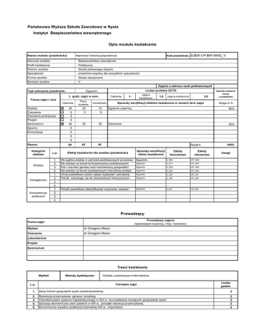 Państwowa Wyższa Szkoła Zawodowa w Nysie Instytut Bezpieczeństwa wewnętrznego Opis modułu kształcenia Nazwa modułu (przedmiotu) Kod przedmiotu S-BW-I-P-BW-NHG_V Najnowsz historia gospodarcza. Kierunek studiów Bezpieczeństwo wewnętrzne Profil kształcenia Praktyczny Poziom studiów Studia pierwszego stopnia Specjalność przedmiot wspólny dla wszystkich specjalności Forma studiów Studia stacjonarne Semestr studiów V Zajęcia z zakresu nauk podstawowych Tryb zaliczenia przedmiotu Liczba punktów ECTS Egzamin L. godz. zajęć w sem. Formy zajęć i inne Egzamin Konsultacje Razem: Kategoria efektów Wiedza Umiejętności Kompetencje społeczne L.p. 1. 2. 3. 4. 1. 2. 3. 4. 1. 2. 3. 4. zajęcia kontaktowe 4 zajęcia praktyczne 1,8 3,6 Pracy studenta Kontaktowe 35 0 0 0 55 0 0 0 0 20 0 15 0 Egzamin pisemny. 80% 25 30 Zaliczenie 20% 90 45 45 Całkowita Wykład Ćwiczenia Ćwiczenia praktyczne Projekt Seminarium Całkowita Sposób ustalania oceny z przedmiotu Sposoby weryfikacji efektów kształcenia w ramach form zajęć Razem Efekty kształcenia dla modułu (przedmiotu) Ma ogólną wiedzę w zakresie podstawowych procesów Ma wiedzę na temat funkcjonowania podstawowyxh Zna i rozumie genezę oraz mechanizmy gospodarki Ma wiedzę na temat podstawowych kierunków polityki ekonomicznej Polski w przeszłości i ich konsekwencji Umie prawidłowo ocenić wpływ wydarzeń i procesów Potrafi, odwołując się do doświadczeń historycznych, Potrafi prawidłowo identyfikować wyzwania, szanse i Sposoby weryfikacji efektu kształcenia Efekty kierunkowe Efekty obszarowe Egzamin K_W04 S1P_W08 Egzamin K_W11 S1P_W07 Egzamin K_W23 S1P_W03 Egzamin K_W24 S1P_W03 Egzamin K_U03 S1P_U01 Egzamin K_U06 S1P_U04 Egzamin K_K01 S1P_K03 Waga w % 100% Uwagi Prowadzący Prowadzący zajęcia (tytuł/stopień naukowy, imię i nazwisko) Forma zajęć Wykład dr Grzegorz Mazur Ćwiczenia dr Grzegorz Mazur Laboratorium Projekt Seminarium Treści kształcenia Wykład Metody dydaktyczne Wykład, prezentacja multimedialna. Tematyka zajęć L.p. Liczba godzin 1. Zarys historii gospodarki epoki przedindustrialnej. 2 2. 3. 4. 5. Rewolucja przemysłowa: geneza i przebieg. Charakterystyka systemu kapitalistycznego w XIX w. na przykładzie wiodących gospodarek epoki. Sytuacja ekonomiczna ziem polskich w XIX w., początki rewolucji przemysłowej. Ekonomiczne aspekty rywalizacji kolonialnej XIX w., imperializm. 2 2 2 2 6. 7. 8. 9. 10. 11. 12. 13. 14. 15. Wpływ I wojny światowej i jej skutków na gospodarkę światową lat 20. XX w. Gospodarka USA i światowa lat dwudziestych. Geneza Wielkiego Kryzysu. Wielki Kryzys 1. połowy lat trzydziestych i jego ekonomiczne i geopolityczne konsekwencje. Gospodarka Polski w okresie międzywojennym. Ekonomia ZSRR w okresie międzywojennym. Skutki gospodarcze II wojny światowej. Przemiany ekonomiczne w świecie po II wojnie światowej; główne zjawiska i trendy. System ekonomiczny bloku sowieckiego, przyczyny jego kryzysu i upadku. Gospodarka PRL. Sukcesy gospodarki rynkowej w końcu XX w., geneza współczesnej sytuacji ekonomicznej i wynikające z tego zagrożenia. Razem liczba godzin: Ćwiczenia Metody dydaktyczne 1. 2. 3. 4. 5. 6. 7. 8. 9. 10. 11. 12. 13. 14. 15. Wprowadzenie; podstawowe pojęcia związane z historią gospodarczą. Wybrane zagadnienia z dziejów gospodarczych epoki Postęp technologiczny i jego skutki. Rozwój ekonomiczny Śląska w epoce rewolucji przemysłowej. Zjawiska ekonomiczne epoki rewolucji przemysłowej, ich konsekwencje społeczne i polityczne. Ziemie polskie w okresie rewolucji przemysłowej. Wybrane zagadnienia. Imperializm i jego odmiany. Wojna a gospodarka. Przyczyny wielkiego kryzysu, metody wychodzenia z kryzysu - dyskusja. Doktryny ekonomiczne XIX i XX w. i ich konsekwencje. Gospodarka państw totalitarnych w okresie międzywojennym. Wpływ ekonomii na genezę II wojny światowej. Osiągnięcia gospodarcze II Rzeczypospolitej. Znaczenie gospodarki dla zabezpieczenia suwerenności państwa - dyskusja. Ekonomiczne mechanizmy odbudowy i rozwoju po II wojnie światowej. Dlaczego gospodarka socjalistyczna upadła? Ekonomiczne tło konfliktów międzynarodowych po II wojnie światowej. Przemiany kulturowe i społeczne po II wojnie śiwatowej a ekonomia. Razem liczba godzin: Ćwiczenia praktyczne 30 Referat/prezentacja, rozmowa, dyskusja. Tematyka zajęć L.p. 2 2 2 2 2 2 2 2 2 2 Liczba godzin 2 2 2 2 2 2 2 2 2 2 2 2 2 2 2 30 Metody dydaktyczne Liczba godzin Tematyka zajęć L.p. 1. 2. 3. 4. 5. 6. 7. 8. 9. 10. 11. 12. 13. 14. 15. Razem liczba godzin: Projekt L.p. 0 Metody dydaktyczne Liczba godzin Tematyka zajęć 1. 2. 3. 4. 5. 6. 7. 8. 9. 10. 11. 12. 13. 14. 15. Razem liczba godzin: 0 Seminarium Metody dydaktyczne Liczba godzin Tematyka zajęć L.p. 1. 2. 3. 4. 5. 6. 7. 8. 9. 10. 11. 12. 13. 14. 15. Razem liczba godzin: Literatura podstawowa: 1 2 3 4 5 6 7 8 R. Cameron, L. Neal, Historia gospodarcza świata, Warszawa 2009 J. Kaliński, Historia gospodarcza XIX i XX wieku. J. Kaliński, Z. Landau, Gospodarka Polski XX wieku. Z. Landau, W. Roszkowski, Historia gospodarcza II RP i PRL. M. Maciejewski, M. Sadowski, Powszechna historia gospodarcza od XV do XX wieku. Literatura uzupełniająca: 1 Geografia gospodarcza świata, p. red. I. Fierla, J. Brdulak 2 K. Jonca, Dzieje gospodarcze Polski do 1939 r. 3 W. Kwaśnicki, Historia myśli liberalnej: wolność, własność, odpowiedzialność. 4 W. Morawski, Zarys powszechnej historii pieniądza i bankowości. 5 Z. Sirojć, Podstawowe terminy historii gospodarczej. 6 J. Skodlarski, Zarys historii gospodarczej Polski 7 J. Skodlarski, R. Matera, Gospodarka światowa. 8 J. Szpak, Historia gospodarcza powszechna. ………………………………………………….. ………………………………………………………. Koordynator modułu (przedmiotu) Dyrektor Instytutu podpis pieczęć i podpis 0