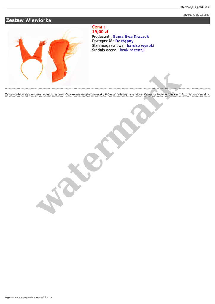 Informacje o produkcie Utworzono 08-03-2017 Zestaw Wiewiórka Cena : 19,00 zł er m ar k Producent : Gama Ewa Kraszek Dostępność : Dostępny Stan magazynowy : bardzo wysoki Średnia ocena : brak recenzji w at Zestaw składa się z ogonka i opaski z uszami. Ogonek ma wszyte gumeczki, które zakłada się na ramiona. Całość ozdobiona futerkiem. Rozmiar uniwersalny. Wygenerowano w programie www.oscGold.com