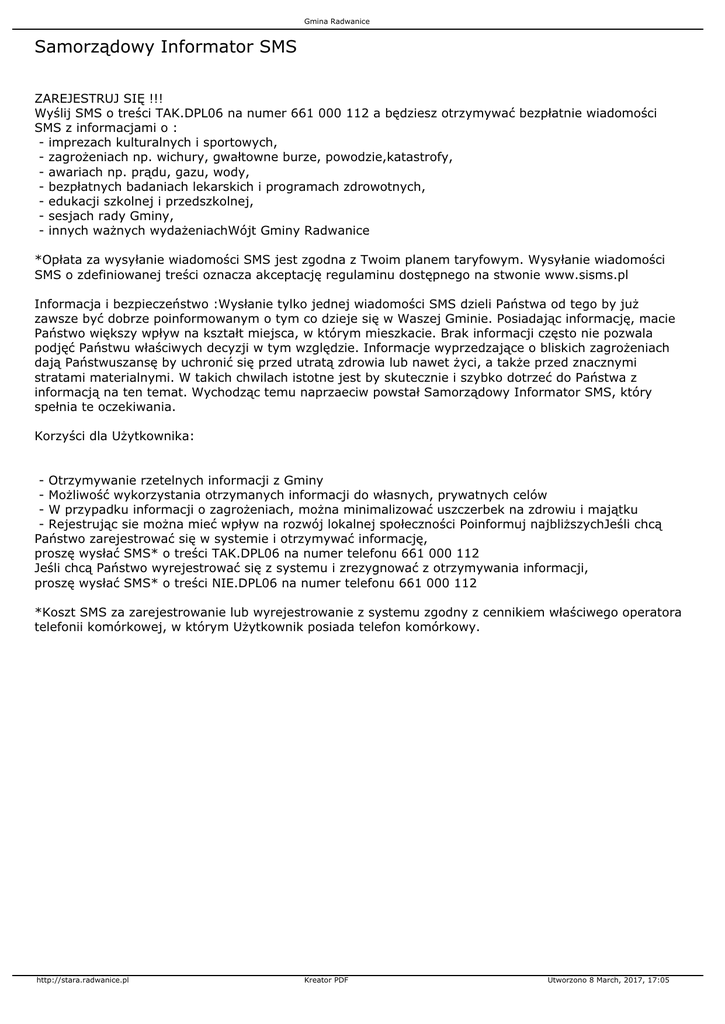 Gmina Radwanice Samorządowy Informator SMS ZAREJESTRUJ SIĘ !!! Wyślij SMS o treści TAK.DPL06 na numer 661 000 112 a będziesz otrzymywać bezpłatnie wiadomości SMS z informacjami o : - imprezach kulturalnych i sportowych, - zagrożeniach np. wichury, gwałtowne burze, powodzie,katastrofy, - awariach np. prądu, gazu, wody, - bezpłatnych badaniach lekarskich i programach zdrowotnych, - edukacji szkolnej i przedszkolnej, - sesjach rady Gminy, - innych ważnych wydażeniachWójt Gminy Radwanice *Opłata za wysyłanie wiadomości SMS jest zgodna z Twoim planem taryfowym. Wysyłanie wiadomości SMS o zdefiniowanej treści oznacza akceptację regulaminu dostępnego na stwonie www.sisms.pl Informacja i bezpieczeństwo :Wysłanie tylko jednej wiadomości SMS dzieli Państwa od tego by już zawsze być dobrze poinformowanym o tym co dzieje się w Waszej Gminie. Posiadając informację, macie Państwo większy wpływ na kształt miejsca, w którym mieszkacie. Brak informacji często nie pozwala podjęć Państwu właściwych decyzji w tym względzie. Informacje wyprzedzające o bliskich zagrożeniach dają Państwuszansę by uchronić się przed utratą zdrowia lub nawet życi, a także przed znacznymi stratami materialnymi. W takich chwilach istotne jest by skutecznie i szybko dotrzeć do Państwa z informacją na ten temat. Wychodząc temu naprzaeciw powstał Samorządowy Informator SMS, który spełnia te oczekiwania. Korzyści dla Użytkownika: - Otrzymywanie rzetelnych informacji z Gminy - Możliwość wykorzystania otrzymanych informacji do własnych, prywatnych celów - W przypadku informacji o zagrożeniach, można minimalizować uszczerbek na zdrowiu i majątku - Rejestrując sie można mieć wpływ na rozwój lokalnej społeczności Poinformuj najbliższychJeśli chcą Państwo zarejestrować się w systemie i otrzymywać informację, proszę wysłać SMS* o treści TAK.DPL06 na numer telefonu 661 000 112 Jeśli chcą Państwo wyrejestrować się z systemu i zrezygnować z otrzymywania informacji, proszę wysłać SMS* o treści NIE.DPL06 na numer telefonu 661 000 112 *Koszt SMS za zarejestrowanie lub wyrejestrowanie z systemu zgodny z cennikiem właściwego operatora telefonii komórkowej, w którym Użytkownik posiada telefon komórkowy. http://stara.radwanice.pl Kreator PDF Utworzono 8 March, 2017, 17:05