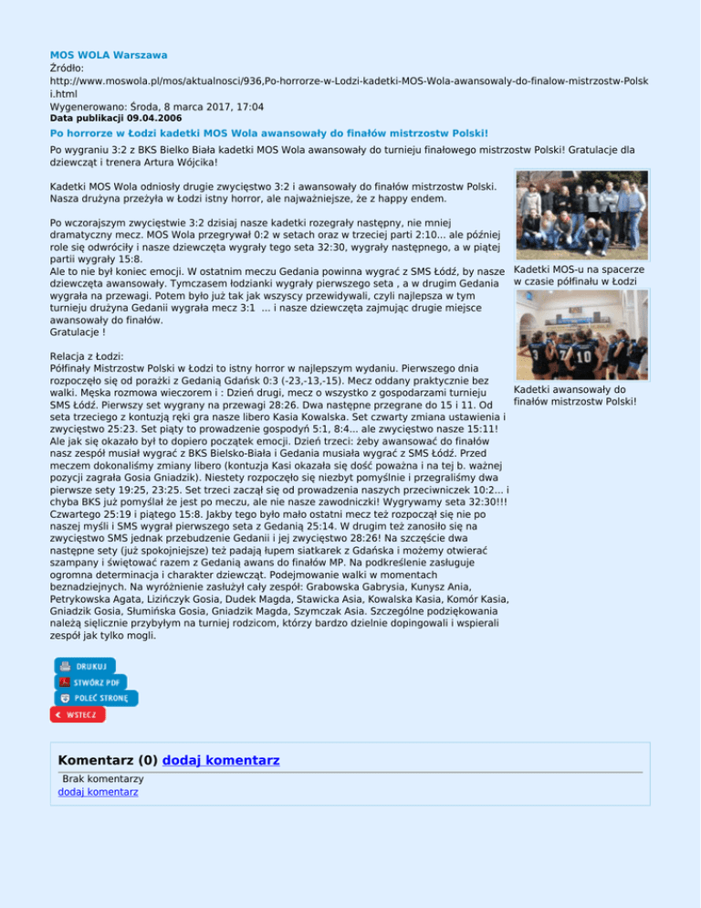 MOS WOLA Warszawa Źródło: http://www.moswola.pl/mos/aktualnosci/936,Po-horrorze-w-Lodzi-kadetki-MOS-Wola-awansowaly-do-finalow-mistrzostw-Polsk i.html Wygenerowano: Środa, 8 marca 2017, 17:04 Data publikacji 09.04.2006 Po horrorze w Łodzi kadetki MOS Wola awansowały do finałów mistrzostw Polski! Po wygraniu 3:2 z BKS Bielko Biała kadetki MOS Wola awansowały do turnieju finałowego mistrzostw Polski! Gratulacje dla dziewcząt i trenera Artura Wójcika! Kadetki MOS Wola odniosły drugie zwycięstwo 3:2 i awansowały do finałów mistrzostw Polski. Nasza drużyna przeżyła w Łodzi istny horror, ale najważniejsze, że z happy endem. Po wczorajszym zwycięstwie 3:2 dzisiaj nasze kadetki rozegrały następny, nie mniej dramatyczny mecz. MOS Wola przegrywał 0:2 w setach oraz w trzeciej parti 2:10... ale później role się odwróciły i nasze dziewczęta wygrały tego seta 32:30, wygrały następnego, a w piątej partii wygrały 15:8. Ale to nie był koniec emocji. W ostatnim meczu Gedania powinna wygrać z SMS Łódź, by nasze Kadetki MOS-u na spacerze dziewczęta awansowały. Tymczasem łodzianki wygrały pierwszego seta , a w drugim Gedania w czasie półfinału w Łodzi wygrała na przewagi. Potem było już tak jak wszyscy przewidywali, czyli najlepsza w tym turnieju drużyna Gedanii wygrała mecz 3:1 ... i nasze dziewczęta zajmując drugie miejsce awansowały do finałów. Gratulacje ! Relacja z Łodzi: Półfinały Mistrzostw Polski w Łodzi to istny horror w najlepszym wydaniu. Pierwszego dnia rozpoczęło się od porażki z Gedanią Gdańsk 0:3 (-23,-13,-15). Mecz oddany praktycznie bez Kadetki awansowały do walki. Męska rozmowa wieczorem i : Dzień drugi, mecz o wszystko z gospodarzami turnieju finałów mistrzostw Polski! SMS Łódź. Pierwszy set wygrany na przewagi 28:26. Dwa następne przegrane do 15 i 11. Od seta trzeciego z kontuzją ręki gra nasze libero Kasia Kowalska. Set czwarty zmiana ustawienia i zwycięstwo 25:23. Set piąty to prowadzenie gospodyń 5:1, 8:4... ale zwycięstwo nasze 15:11! Ale jak się okazało był to dopiero początek emocji. Dzień trzeci: żeby awansować do finałów nasz zespół musiał wygrać z BKS Bielsko-Biała i Gedania musiała wygrać z SMS Łódź. Przed meczem dokonaliśmy zmiany libero (kontuzja Kasi okazała się dość poważna i na tej b. ważnej pozycji zagrała Gosia Gniadzik). Niestety rozpoczęło się niezbyt pomyślnie i przegraliśmy dwa pierwsze sety 19:25, 23:25. Set trzeci zaczął się od prowadzenia naszych przeciwniczek 10:2... i chyba BKS już pomyślał że jest po meczu, ale nie nasze zawodniczki! Wygrywamy seta 32:30!!! Czwartego 25:19 i piątego 15:8. Jakby tego było mało ostatni mecz też rozpoczął się nie po naszej myśli i SMS wygrał pierwszego seta z Gedanią 25:14. W drugim też zanosiło się na zwycięstwo SMS jednak przebudzenie Gedanii i jej zwycięstwo 28:26! Na szczęście dwa następne sety (już spokojniejsze) też padają łupem siatkarek z Gdańska i możemy otwierać szampany i świętować razem z Gedanią awans do finałów MP. Na podkreślenie zasługuje ogromna determinacja i charakter dziewcząt. Podejmowanie walki w momentach beznadziejnych. Na wyróżnienie zasłużył cały zespół: Grabowska Gabrysia, Kunysz Ania, Petrykowska Agata, Lizińczyk Gosia, Dudek Magda, Stawicka Asia, Kowalska Kasia, Komór Kasia, Gniadzik Gosia, Słumińska Gosia, Gniadzik Magda, Szymczak Asia. Szczególne podziękowania należą sięlicznie przybyłym na turniej rodzicom, którzy bardzo dzielnie dopingowali i wspierali zespół jak tylko mogli. Komentarz (0) dodaj komentarz Brak komentarzy dodaj komentarz