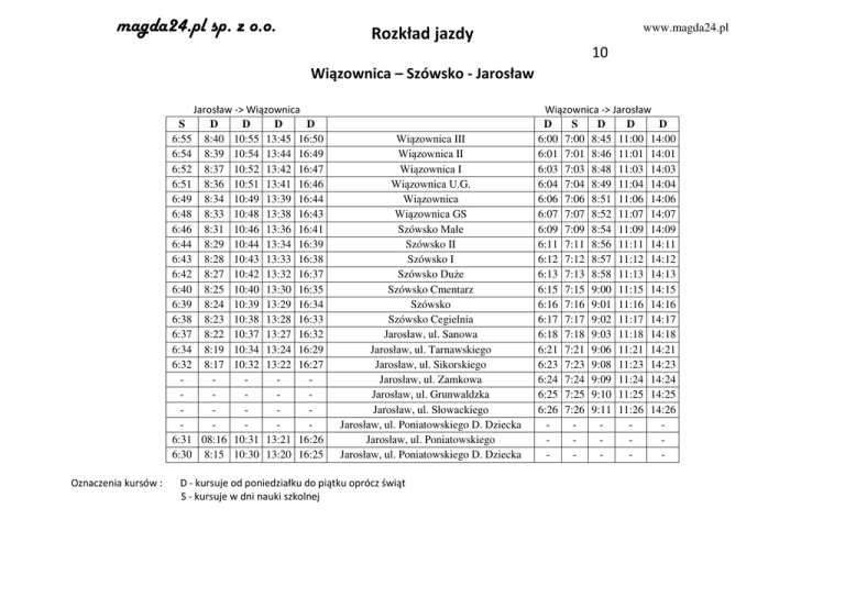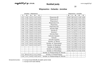 magda24.pl sp. z o.o. Rozkład jazdy www.magda24.pl 10 Wiązownica – Szówsko - Jarosław Jarosław -> Wiązownica S D D D D 6:55 8:40 10:55 13:45 16:50 6:54 8:39 10:54 13:44 16:49 6:52 8:37 10:52 13:42 16:47 6:51 8:36 10:51 13:41 16:46 6:49 8:34 10:49 13:39 16:44 6:48 8:33 10:48 13:38 16:43 6:46 8:31 10:46 13:36 16:41 6:44 8:29 10:44 13:34 16:39 6:43 8:28 10:43 13:33 16:38 6:42 8:27 10:42 13:32 16:37 6:40 8:25 10:40 13:30 16:35 6:39 8:24 10:39 13:29 16:34 6:38 8:23 10:38 13:28 16:33 6:37 8:22 10:37 13:27 16:32 6:34 8:19 10:34 13:24 16:29 6:32 8:17 10:32 13:22 16:27 6:31 08:16 10:31 13:21 16:26 6:30 8:15 10:30 13:20 16:25 Oznaczenia kursów : Wiązownica III Wiązownica II Wiązownica I Wiązownica U.G. Wiązownica Wiązownica GS Szówsko Małe Szówsko II Szówsko I Szówsko Duże Szówsko Cmentarz Szówsko Szówsko Cegielnia Jarosław, ul. Sanowa Jarosław, ul. Tarnawskiego Jarosław, ul. Sikorskiego Jarosław, ul. Zamkowa Jarosław, ul. Grunwaldzka Jarosław, ul. Słowackiego Jarosław, ul. Poniatowskiego D. Dziecka Jarosław, ul. Poniatowskiego Jarosław, ul. Poniatowskiego D. Dziecka D - kursuje od poniedziałku do piątku oprócz świąt S - kursuje w dni nauki szkolnej Wiązownica -> Jarosław D S D D D 6:00 7:00 8:45 11:00 14:00 6:01 7:01 8:46 11:01 14:01 6:03 7:03 8:48 11:03 14:03 6:04 7:04 8:49 11:04 14:04 6:06 7:06 8:51 11:06 14:06 6:07 7:07 8:52 11:07 14:07 6:09 7:09 8:54 11:09 14:09 6:11 7:11 8:56 11:11 14:11 6:12 7:12 8:57 11:12 14:12 6:13 7:13 8:58 11:13 14:13 6:15 7:15 9:00 11:15 14:15 6:16 7:16 9:01 11:16 14:16 6:17 7:17 9:02 11:17 14:17 6:18 7:18 9:03 11:18 14:18 6:21 7:21 9:06 11:21 14:21 6:23 7:23 9:08 11:23 14:23 6:24 7:24 9:09 11:24 14:24 6:25 7:25 9:10 11:25 14:25 6:26 7:26 9:11 11:26 14:26 -