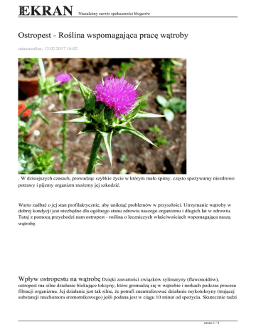 Niezależny serwis społeczności blogerów Ostropest - Roślina wspomagająca pracę wątroby naturaonline, 13.02.2017 16:02 . W dzisiejszych czasach, prowadząc szybkie życie w którym mało śpimy, często spożywamy niezdrowe potrawy i pijemy organizm możemy jej szkodzić. Warto zadbać o jej stan profilaktycznie, aby uniknąć problemów w przyszłości. Utrzymanie wątroby w dobrej kondycji jest niezbędne dla ogólnego stanu zdrowia naszego organizmu i długich lat w zdrowiu. Tutaj z pomocą przychodzi nam ostropest - roślina o leczniczych właściwościach wspomagająca naszą wątrobę. Wpływ ostropestu na wątrobę Dzięki zawartości związków sylimaryny (flawonoidów), ostropest ma silne działanie blokujące toksyny, które gromadzą się w wątrobie i nerkach podczas procesu filtracji organizmu. Jej działanie jest tak silne, że potrafi zneutralizować działanie mykotoksyny (trującej substancji muchomora sromotnikowego) jeśli podana jest w ciągu 10 minut od spożycia. Skutecznie radzi strona 1 / 4 Niezależny serwis społeczności blogerów sobie również z pestycydami, dwusiarczkiem węgla i innymi niebezpiecznymi związkami z którymi stykamy się każdego dnia. Ekstrakt z ostropestu wspomaga także wątrobę u osób, które nadużywają alkoholu poprzez usprawnianie w procesie pozbywania się cząsteczek szkodzących jej oraz stymuluje wątrobę do odbudowy i produkcji nowych komórek. Czym jest ostropest? Ostropest plamisty to roślina pochodząca z regionów Morza Śródziemnego. Dzięki niezbyt wygórowanym wymaganiom co do jakości gleby i warunków środowiska rozpowszechniła się niemal wszędzie. W Polsce jest uprawiana na blisko 2 tyś. hektarach. Na bazie nasion tej rośliny (w których jest najwięcej składników leczniczych) tworzy się wiele leków osłonowych na wątrobę i kosmetyków. Jej właściwości w leczeniu przewlekłych schorzeń wątroby są znane już od lat. Badania przeprowadzane na ludziach i zwierzętach potwierdzają te korzyści. Objawy świadczące, że wątroba może potrzebować wsparcia Problemy z funkcjonowaniem organizmu świadczące o tym, że z naszą wątrobą dzieje się coś niedobrego to między innymi: Osłabienie, problemy z koncentracją, nerwowość, nadmierne zmęczenie podczas wysiłku fizycznego, strona 2 / 4 Niezależny serwis społeczności blogerów uczucie wzdęcia brzucha, zaburzenia miesiączkowania u kobiet, spadek popędu seksualnego, ginekomastia u mężczyzn (nadmierny przerost piersi), problemy z krzepnięciem krwi W przypadku występowania kilku z tych objawów jednocześnie, warto wypróbować działanie ostropestu. Ważne: jeśli objawy te są nasilone, należy zwrócić się do lekarza, który skieruje nas na odpowiednie badania. Jak korzystać z właściwości ostropestu? Obecnie na rynku mamy bardzo dużo preparatów, które zawierają sylimarol. Można spotkać je pod kilku postaciami: nasion, w formie zmielonej, oleju z ostropestu i tabletek. Nasiona To jedna z najlepszych form, ponieważ jest najmniej przetworzona i mamy pewność, że cenne składniki odżywcze nie zostały utracone podczas procesu przetwarzania. Nasiona ostropestu zawierają w sobie od 2 do 3% sylimarolu. Dokładna wartość zależna jest od uprawy, warunków środowiskowych, pogody itd. Nasiona zaparzamy w formie herbaty lub możemy je zmielić w młynku i dodawać do posiłków. Warto dodać, że nasiona te nie mają smaku, więc nie kolidują z innymi składnikami jedzenia. Ostropest mielony Możemy także kupić nasiona w formie zmielonej. Możliwe jest jednak, że nie będą miały tak dobrego działania jak nasiona zmielone samodzielnie. Własności produktu mogły zostać utracone podczas przetwarzania, nie mamy także pełnej kontroli nad składem do którego mogły zostać dodane inne elementy rośliny, które nie są tak skuteczne. Jeśli już chcemy skorzystać z tego rozwiązania to warto zadbać aby były to produkty z oznaczeniami BIO / EKO i pochodziły z kontrolowanych upraw. strona 3 / 4 Niezależny serwis społeczności blogerów Olej z ostropestu Tutaj do wyboru mamy spożywanie oleju każdego dnia po 1 łyżeczce przed posiłkiem lub dodanie go do różnych potraw jak sałatki czy wypieki. Niektóre źródła mówią, że olej z ostropestu jest również świetnym sprzymierzeńcem w walce z przesuszonymi włosami i złą kondycją paznokci jeśli zastosujemy go zewnętrznie. Tabletki Jedna z najwygodniejszych opcji. Zalecana dawka to 1 tabletka 3 razy dziennie. Ich skład zawiera najczęściej wyciąg z łusek nasion. W nich podobno jest najwięcej sylimarolu. Ostateczny wybór należy do indywidualnego rozstrzygnięcia. Pewne jest, iż ostropest a właściwie sylimarol, jest wart dodania do swojej diety. Praktycznie znikoma toksyczność produktu na nasz organizm może tylko nam pomóc. Nie zaleca się jedynie podawanie ostropestu dzieciom do 12 roku życia z racji tego, że nie przeprowadzono żadnych badań z ich udziałem. Źródło: http://naturaonline.pl/ http://wylecz.to/pl/choroby/uklad-pokarmowy/jakie-objawy-wskazuja-ze-watroba-jest-chora-jak-rozpozn ac-problemy-z-watroba.html http://www.lifeextension.com/Magazine/2016/5/Mediterranean-Herb-Guards-Vital-Liver-Functions/Page -01 strona 4 / 4 Powered by TCPDF (www.tcpdf.org)