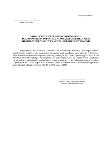 …........................................... miejscowość i data …............................................ pieczęć Oferenta OŚWIADCZENIE OFERENTA O ZOBOWIĄZANIU DO ZAPEWNIENIA POUFNOŚCI W ZWIĄZKU Z UDZIELANIEM NIEODPŁATNEJ POMOCY PRAWNEJ I JEJ DOKUMENTOWANIU Przystępując do udziału w konkursie na powierzenie realizacji zleconego zadania administracji rządowej dla organizacji pozarządowych z zakresu prowadzenia w Powiecie Nowodworskim punktu nieodpłatnej pomocy prawnej w 2017 roku ogłoszonego przez Zarząd Powiatu Nowodworskiego oświadczam, iż zobowiązuję się do zapewnienia poufności w związku z udzielaniem nieodpłatnej pomocy prawnej i jej dokumentowaniu, zgodnie z przepisem art. 11 ust. 6 pkt 3 lit. a ustawy z dnia 5 sierpnia 2015 r. o nieodpłatnej pomocy prawnej oraz edukacji prawnej (Dz. U. z 2015 r. poz. 1255). ….......................................... podpis/y osoby/osób uprawionych do reprezentowania Oferenta