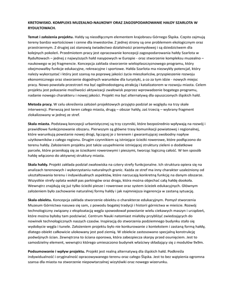 KRETOWISKO. KOMPLEKS MUZEALNO‐NAUKOWY ORAZ ZAGOSPODAROWANIE HAŁDY SZARLOTA W RYDUŁTOWACH. Temat i założenia projektu. Hałdy są nieodłącznym elementem krajobrazu Górnego Śląska. Często zajmują tereny bardzo wartościowe i cenne dla inwestorów. Z jednej strony są one problemem ekologicznym oraz przestrzennym. Z drugiej zaś stanowią świadectwo działalności przemysłowej i są dziedzictwem dla kolejnych pokoleń. Przedmiotem pracy jest opracowanie koncepcji zagospodarowania hałdy Szarlota w Rydułtowach – jednej z najwyższych hałd nasypowych w Europie ‐ oraz stworzenie kompleksu muzealno – naukowego w jej fragmencie. Koncepcja zakłada stworzenie wielopłaszczyznowego programu, który obejmowałby funkcje edukacyjne, rekreacyjne i sportowe. Hałda Szarlota ma niezwykły potencjał, który należy wykorzystać i który jest szansą na poprawę jakości życia mieszkańców, przyspieszenie rozwoju ekonomicznego oraz stworzenie dogodnych warunków dla turystyki, a co za tym idzie ‐ nowych miejsc pracy. Nowo powstała przestrzeń ma być ogólnodostępną atrakcją i katalizatorem w rozwoju miasta. Celem projektu jest pokazanie możliwości aktywizacji zwałowisk poprzez wprowadzenie bogatego programu, nadanie nowego charakteru i nowej jakości. Projekt ma być alternatywą dla opuszczonych śląskich hałd. Metoda pracy. W celu określenia założeń projektowych przyjęto podział ze względu na trzy skale interwencji. Pierwszą jest teren całego miasta, drugą – obszar hałdy, zaś trzecią – wybrany fragment zlokalizowany w jednej ze stref. Skala miasta. Podstawą koncepcji urbanistycznej są trzy czynniki, które bezpośrednio wpływają na rozwój i prawidłowe funkcjonowanie obszaru. Pierwszym są główne trasy komunikacji powiatowej i regionalnej, które warunkują powstanie nowej drogi, łączącej je z terenem i gwarantującej swobodny napływ użytkowników z całego regionu. Drugim czynnikiem są istniejące ścieżki rowerowe, które podłączono do terenu hałdy. Założeniem projektu jest także uzupełnienie istniejącej struktury zieleni o dodatkowe parcele, które przenikają się ze ścieżkami rowerowymi i pieszymi, tworząc logiczną całość. W ten sposób hałdę włączono do aktywnej struktury miasta. Skala hałdy. Projekt zakłada podział zwałowiska na cztery strefy funkcjonalne. Ich struktura opiera się na analizach terenowych i wykorzystaniu naturalnych granic. Każda ze stref ma inny charakter uzależniony od ukształtowania terenu i indywidualnych aspektów, które narzucają konkretną funkcję na danym obszarze. Wszystkie strefy oplata wokół pas parkingów oraz droga, która można objechać całą hałdę dookoła. Wewnątrz znajdują się już tylko ścieżki piesze i rowerowe oraz system ścieżek edukacyjnych. Głównym założeniem było zachowanie naturalnej formy hałdy i jak najmniejsza ingerencja w zastaną sytuację. Skala obiektu. Koncepcja zakłada stworzenie obiektu o charakterze edukacyjnym. Pomysł stworzenia Muzeum Górnictwa nasuwa się sam, z powodu bogatej tradycji i historii górnictwa w mieście. Rozwój technologiczny związany z eksploatacją węgla spowodował powstanie wielu ciekawych maszyn i urządzeń, które można byłoby tam podziwiać. Centrum Nauki natomiast miałoby przybliżyć zwiedzających do nowinek technologicznych naszych czasów. Inspiracją do stworzenia podziemnego budynku stało się wydobycie węgla i tunele. Założeniem projektu było nie konkurowanie z kontekstem i zastaną formą hałdy, dlatego obiekt całkowicie ulokowany jest pod ziemią. W obiekcie zastosowano specjalną konstrukcję podwójnych ścian. Zewnętrzna to ściana oporowa, która zabezpiecza skarpy przed osunięciem. Jest to samodzielny element, wewnątrz którego umieszczono budynek właściwy składający się z modułów 9x9m. Podsumowanie i wpływ projektu. Projekt jest realną alternatywą dla śląskich hałd. Podkreśla indywidualność i oryginalność opracowywanego terenu oraz całego Śląska. Jest to bez wątpienia ogromna szansa dla miasta na stworzenie niepowtarzalnej wizytówki oraz nowego wizerunku. KRETOWISKO. MULTIFUNCTIONAL COMPLEX AND URBAN CONCEPT FOR SLAG HEAP SZARLOTA IN RYDUŁTOWY, POLAND. Design theme. Spoil tips are inevitable and widely recognizable elements of Upper Silesia Industrial Region landmarks. These man‐made landforms are very often interpreted as landscape scars, which cover very valuable terrains in Silesia Upland. On the one hand, slag heaps are an environmental and spatial problem. On the other hand, they are a testimony of an industrial activity and are an heritage for future generations. The major issue of this project was to prepare an urban concept for Szarlota spoil tip in Rydułtowy, Poland, which is one of the most height spoil tip in Europe and to design an educational and museum complex in one part of It. The concept was to create a multifaceted program, which would contain educational, recreational and sport facilities. Szarlota slag heap has an incredible potential, which should be re‐used and which can provide positive benefits to local communities as well as is a chance to accelerate economic growth by creating convenient conditions to develop tourism (creation of new workplaces). This new space would be a public attraction and a catalyst of Rydułtowy development. The main aim of the project is to show new possibilities for heaps activation by implementing wide program and by creating new character and new quality. Project would become thereby an alternative for abandoned Silesian anthropogenic landforms. Work methodology. To conceptualize major design aspects, three scales of intervention were considered. The first one became an area of a Rydułtowy city, the second one – area of the spoil tip and the third – scale of the object – multifunctional complex. City scale. In the concept, it is possible to distinguish three major aspects which in