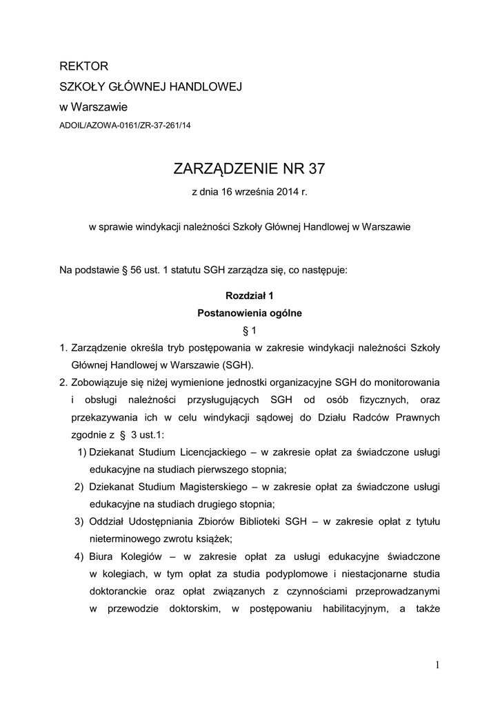 REKTOR SZKOŁY GŁÓWNEJ HANDLOWEJ w Warszawie ADOIL/AZOWA-0161/ZR-37-261/14 ZARZĄDZENIE NR 37 z dnia 16 września 2014 r. w sprawie windykacji należności Szkoły Głównej Handlowej w Warszawie Na podstawie § 56 ust. 1 statutu SGH zarządza się, co następuje: Rozdział 1 Postanowienia ogólne §1 1. Zarządzenie określa tryb postępowania w zakresie windykacji należności Szkoły Głównej Handlowej w Warszawie (SGH). 2. Zobowiązuje się niżej wymienione jednostki organizacyjne SGH do monitorowania i obsługi należności przysługujących SGH od osób fizycznych, oraz przekazywania ich w celu windykacji sądowej do Działu Radców Prawnych zgodnie z § 3 ust.1: 1) Dziekanat Studium Licencjackiego – w zakresie opłat za świadczone usługi edukacyjne na studiach pierwszego stopnia; 2) Dziekanat Studium Magisterskiego – w zakresie opłat za świadczone usługi edukacyjne na studiach drugiego stopnia; 3) Oddział Udostępniania Zbiorów Biblioteki SGH – w zakresie opłat z tytułu nieterminowego zwrotu książek; 4) Biura Kolegiów – w zakresie opłat za usługi edukacyjne świadczone w kolegiach, w tym opłat za studia podyplomowe i niestacjonarne studia doktoranckie oraz opłat związanych z czynnościami przeprowadzanymi w przewodzie doktorskim, w postępowaniu habilitacyjnym, a także 1 w postępowaniu o nadanie tytułu profesora oraz opłat za udział w konferencjach organizowanych przez kolegia; 5) Dział Konferencji – w zakresie opłat za udział w konferencjach; 6) Dział Rozwoju Edukacji – w zakresie opłat za organizowane kursy i szkolenia; 7) Centrum Nauki Języków Obcych – w zakresie opłat za organizowane kursy i szkolenia; 8) Dział Programów Międzynarodowych – w zakresie wierzytelności związanych z międzynarodową wymianą studentów i pracowników; 9) Dział Obsługi Studentów – w zakresie opłat za korzystanie z domów studenta SGH oraz wierzytelności związanych z wypłatą stypendiów studenckich i innych świadczeń na rzecz studentów; 10)Dział Organizacji i Rozliczania Dydaktyki – w zakresie wierzytelności związanych z wypłatą stypendiów doktoranckich; 11)Dział Socjalny – w zakresie zwrotu świadczeń finansowanych ze środków Zakładowego Funduszu Świadczeń Socjalnych; 12)Dział Płac – w zakresie wierzytelności związanych z wypłatą wynagrodzeń, potrąceniami oraz innymi wypłatami dla pracowników. 3. Zobowiązuje i się egzekwowania Dział Księgowości należności Finansowej przysługujących SGH do od monitorowania osób fizycznych w zakresie tytułów nieobjętych postanowieniami ust. 2 oraz należności od osób prawnych i innych podmiotów, w tym związanych z obrotem gospodarczym. 4. Decyzje w zakresie windykacji należności, a w szczególności w sprawach rozkładania ich na raty, odraczania terminów ich spłaty oraz odstąpienia od windykacji ze względu na niewspółmierne koszty podejmują, oraz ugody i porozumienia podpisują, na podstawie upoważnień udzielonych przez Rektora: 1) prorektor ds. dydaktyki i studentów – w zakresie tytułów określonych w ust. 2 pkt 8, 9 i 10; 2) właściwi dziekani – odpowiednio w zakresie tytułów określonych w ust. 2 pkt 1, 2 i 4; 3) dyrektor Biblioteki SGH – w zakresie tytułu określonego w ust. 2 pkt 3; 4) kanclerz – w zakresie tytułów niewymienionych w pkt 1 – 3. 5. SGH podejmuje działania zmierzające do dochodzenia swoich należności po upływie terminu, do którego dłużnik miał obowiązek wpłacić należność. Bieg 2 terminu przedawnienia roszczeń o zapłatę należności rozpoczyna się od dnia, w którym roszczenie SGH stało się wymagalne. 6. Dla celów wykonania obowiązków wskazanych w § 1 ust. 2, Dział Księgowości Finansowej przekazuje właściwym jednostkom organizacyjnym SGH poniższe dane: 1) informacje o stwierdzonych w danym miesiącu niezgodnościach na odpowiednich kontach rozrachunkowych – w terminie do 15. dnia następnego miesiąca; 2) w zakresie tytułów określonych w § 1 ust. 2 pkt 11: a) listy dłużników z podaniem kwot zaległości i okresu, którego dotyczą – sporządzane na koniec miesiąca w terminie do 25. dnia następnego miesiąca, b) informacje o dokonanych w danym miesiącu wpłatach dotyczących zawartych ugód – sporządzane w terminie do 10. dnia następnego miesiąca. 7. Dział Księgowości Projektowej przekazuje sekretarzom studiów podyplomowych i doktoranckich informacje o wpłatach dokonanych w zakresie tytułów określonych w § 1 ust. 2 pkt 4. Nie później niż ostatniego dnia miesiąca następującego po miesiącu, w którym upłynął termin płatności, lista słuchaczy oraz doktorantów wraz z informacją o dokonanych wpłatach, sporządzona przez sekretarza studiów, podpisana przez kierownika tych studiów i kierownika Działu Księgowości Projektowej, przekazywana jest do właściwego biura kolegium. Rozdział 2 Procedura windykacji należności wymagalnych §2 1. W ciągu 14 dni od daty upływu terminu płatności należności lub daty otrzymania informacji, o których mowa w § 1 ust. 6 i 7, jednostki organizacyjne, o których mowa w § 1 ust. 2 pkt 3 –12 i ust. 3, wysyłają do dłużników przedsądowe wezwania do zapłaty, ze wskazaniem 7-dniowego terminu płatności, liczonego od dnia jego otrzymania. Wezwania należy wysłać listem poleconym za zwrotnym potwierdzeniem odbioru. Dopuszcza się osobiste doręczenie wezwania za pokwitowaniem. 3 2. Jednostki organizacyjne wymienione w § 1 ust. 2 pkt 1 i 2 czynności określone w ust. 1 wykonują w terminie nie dłuższym niż 60 dni od daty upływu terminu płatności. 3. Dodatkowo jednostki organizacyjne wymienione w § 1 ust. 2, a także Dział Księgowości Finansowej (przy współudziale jednostek organizacyjnych, o których mowa w ust. 7), zobowiązane są do stosowania monitów mailowych oraz wyjaśniania przypadków kwestionowania wierzytelności przez dłużnika w zakresie jej zasadności, terminu za