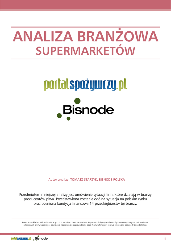 Analiza branżowa SUpermarketów Autor analizy: TOMASZ STARZYK, BISNODE POLSKA Przedmiotem niniejszej analizy jest omówienie sytuacji firm, które działają w branży producentów piwa. Przedstawiona zostanie ogólna sytuacja na polskim rynku oraz oceniona kondycja finansowa 14 przedsiębiorstw tej branży. Prawa autorskie 2014 Bisnode Polska Sp. z o.o. Wszelkie prawa zastrzeżone. Raport ten służy wyłącznie do użytku wewnętrznego w Państwa firmie. Jakiekolwiek przetwarzanie go, powielanie, kopiowanie i rozprowadzanie poza Państwa firmę jest surowo zabronione bez zgody Bisnode Polska. 1 A n a l i z a b r a n ż o w a s k l e p ó w d y s k o n t o w y c h SPIS TREŚCI WSTĘP������������������������������������������������������������2 OGÓLNA SYTUACJA GOSPODARCZA POLSKI ����2 INFORMACJE O FIRMACH��������������������������������4 ANALIZA RENTOWNOŚCI SPRZEDAŻY������������14 ANALIZA RENTOWNOŚCI KAPITAŁU I AKTYWÓW ��������������������������������������������������������������������18 ANALIZA PŁYNNOŚCI FINANSOWEJ����������������21 ANALIZA ZADŁUŻENIA�����������������������������������26 ANALIZA EFEKTYWNOŚCI������������������������������31 ANALIZA PIONOWA���������������������������������������36 ANALIZA POZIOMA���������������������������������������38 PODSUMOWANIE������������������������������������������40 SPIS TABEL I WYKRESÓW Tabela 1: Podstawowe informacje o analizowanych firmach ��������������������������������������������������4 Tabela 2: Przychody ze sprzedaży w analizowanych firmach w latach 2009-2013�������������������7 Tabela 3: Aktywa analizowanych firm w latach 2009–2013(w tys. zł)������������������������������������10 Tabela 4: Wartość netto przedsiębiorstw w latach 2009-2013��������������������������������������������11 Tabela 5: Zatrudnienie w analizowanych firmach w latach 2009-2013����������������������������12 Tabela 6: Wynik finansowy netto w latach 2009-2013 (w tys. zł)������������������������������������12 Tabela 7: Wskaźnik EBIT w latach 2009-2013 [Wskaźnik EBIT = (Wynik operacyjny / Przychody ze sprzedaży)]�������������������������������������������15 Tabela 12: Wysokość wskaźnika rentowności aktywów w latach 2009-2013 [ROA = (Zysk netto / aktywa)]���������������������������������������������19 Tabela 13: Wysokość wskaźnika stopy bieżącej w latach 2009-2013 [Wskaźnik bieżącej płynności = (Aktywa obrotowe / Zobowiązania krótkoterminowe)]����������������������������������������22 Tabela 14: Wysokość wskaźnika szybkiego w latach 2009-2013 [Wskaźnik szybki = (Aktywa obrotowe – Zapasy) / Zobowiązania krótkoterminowe)]������������������������������������������������������24 Tabela 15: Wysokość wskaźnika natychmiastowego w latach 2009-2013 [Wskaźnik natychmiastowy = (Środki pieniężne + Papiery wartościowe przeznaczone do obrotu) / Zobowiązania krótkoterminowe]���������������������������24 Tabela 16: Wysokość wskaźnika łącznego zadłużenia 2009-2013 [Wskaźnik łącznego zadłużenia = (Zobowiązania ogółem / Suma bilansowa)]���������������������������������������������������27 Tabela 17: Wysokość wskaźnika udziału kapitału własnego w latach 2009-2013 [Wskaźnik udziału kapitału własnego w finansowaniu majątku = (Kapitał własny / Suma bilansowa)] ��������������������������������������������������������������������29 Tabela 18: Wysokość wskaźnika zobowiązań długoterminowych w latach 2009-2013 [Wskaźnik zobowiązań długoterminowych = (Zobowiązania długoterminowe / (Zobowiązania długoterminowe + Zobowiązania krótkoterminowe)]����������������������������������������������������� 29 Tabela 19: Wysokość wskaźnika zadłużenia kapitału własnego w latach 2009-2013 [Wskaźnik zadłużenia kapitału własnego = zobowiązania ogółem / kapitał własny]�������������������������������30 Tabela 8: Wskaźnik EBITDA w latach 20092013 [Wskaźnik EBITDA = (Wynik operacyjny + amortyzacja) / Przychody ze sprzedaży)]���