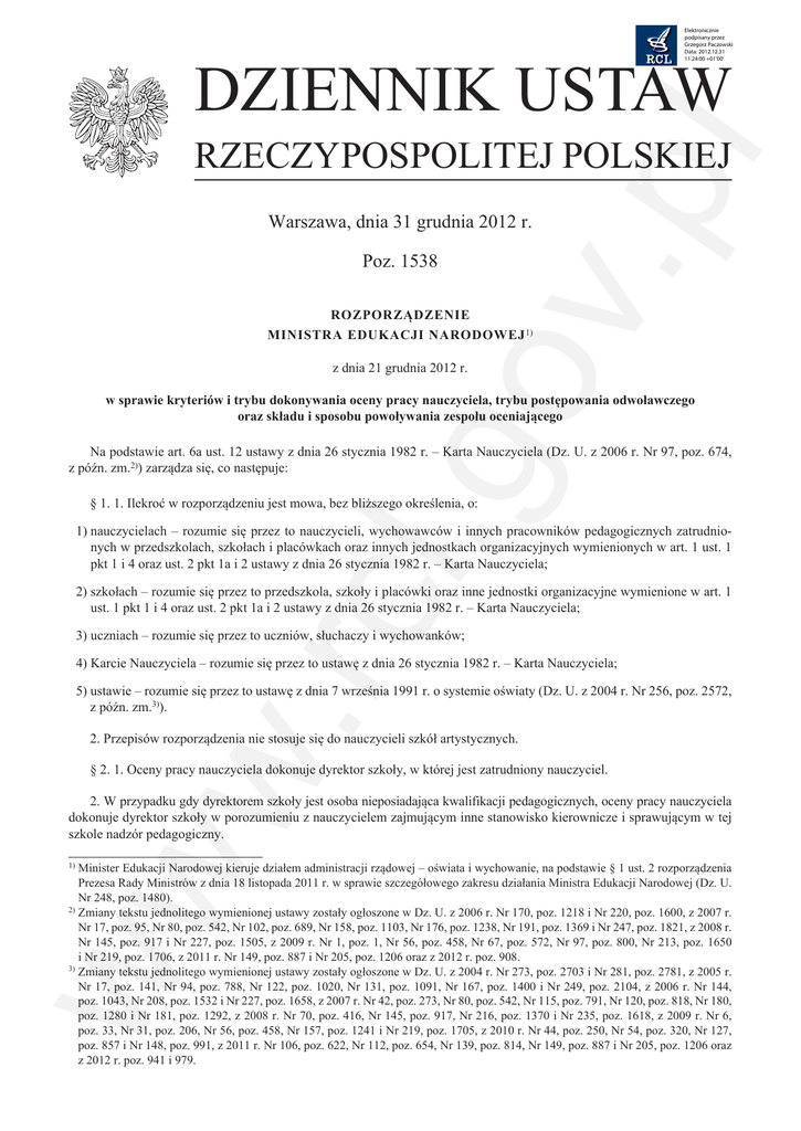 Elektronicznie podpisany przez Grzegorz Paczowski Data: 2012.12.31 11:24:00 +01'00' DZIENNIK USTAW v.p l RZECZYPOSPOLITEJ POLSKIEJ Warszawa, dnia 31 grudnia 2012 r. Poz. 1538 ROZPORZĄDZENIE MINISTRA EDUKACJI NARODOWEJ 1) .go z dnia 21 grudnia 2012 r. w sprawie kryteriów i trybu dokonywania oceny pracy nauczyciela, trybu postępowania odwoławczego oraz składu i sposobu powoływania zespołu oceniającego Na podstawie art. 6a ust. 12 ustawy z dnia 26 stycznia 1982 r. – Karta Nauczyciela (Dz. U. z 2006 r. Nr 97, poz. 674, z późn. zm.2)) zarządza się, co następuje: § 1. 1. Ilekroć w rozporządzeniu jest mowa, bez bliższego określenia, o: w. rcl 1) nauczycielach – rozumie się przez to nauczycieli, wychowawców i innych pracowników pedagogicznych zatrudnionych w przedszkolach, szkołach i placówkach oraz innych jednostkach organizacyjnych wymienionych w art. 1 ust. 1 pkt 1 i 4 oraz ust. 2 pkt 1a i 2 ustawy z dnia 26 stycznia 1982 r. – Karta Nauczyciela; 2) szkołach – rozumie się przez to przedszkola, szkoły i placówki oraz inne jednostki organizacyjne wymienione w art. 1 ust. 1 pkt 1 i 4 oraz ust. 2 pkt 1a i 2 ustawy z dnia 26 stycznia 1982 r. – Karta Nauczyciela; 3) uczniach – rozumie się przez to uczniów, słuchaczy i wychowanków; 4) Karcie Nauczyciela – rozumie się przez to ustawę z dnia 26 stycznia 1982 r. – Karta Nauczyciela; 5) ustawie – rozumie się przez to ustawę z dnia 7 września 1991 r. o systemie oświaty (Dz. U. z 2004 r. Nr 256, poz. 2572, z późn. zm.3)). 2. Przepisów rozporządzenia nie stosuje się do nauczycieli szkół artystycznych. § 2. 1. Oceny pracy nauczyciela dokonuje dyrektor szkoły, w której jest zatrudniony nauczyciel. ww 2. W przypadku gdy dyrektorem szkoły jest osoba nieposiadająca kwalifikacji pedagogicznych, oceny pracy nauczyciela dokonuje dyrektor szkoły w porozumieniu z nauczycielem zajmującym inne stanowisko kierownicze i sprawującym w tej szkole nadzór pedagogiczny. Minister Edukacji Narodowej kieruje działem administracji rządowej – oświata i wychowanie, na podstawie § 1 ust. 2 rozporządzenia Prezesa Rady Ministrów z dnia 18 listopada 2011 r. w sprawie szczegółowego zakresu działania Ministra Edukacji Narodowej (Dz. U. Nr 248, poz. 1480). 2) Zmiany tekstu jednolitego wymienionej ustawy zostały ogłoszone w Dz. U. z 2006 r. Nr 170, poz. 1218 i Nr 220, poz. 1600, z 2007 r. Nr 17, poz. 95, Nr 80, poz. 542, Nr 102, poz. 689, Nr 158, poz. 1103, Nr 176, poz. 1238, Nr 191, poz. 1369 i Nr 247, poz. 1821, z 2008 r. Nr 145, poz. 917 i Nr 227, poz. 1505, z 2009 r. Nr 1, poz. 1, Nr 56, poz. 458, Nr 67, poz. 572, Nr 97, poz. 800, Nr 213, poz. 1650 i Nr 219, poz. 1706, z 2011 r. Nr 149, poz. 887 i Nr 205, poz. 1206 oraz z 2012 r. poz. 908. 3) Zmiany tekstu jednolitego wymienionej ustawy zostały ogłoszone w Dz. U. z 2004 r. Nr 273, poz. 2703 i Nr 281, poz. 2781, z 2005 r. Nr 17, poz. 141, Nr 94, poz. 788, Nr 122, poz. 1020, Nr 131, poz. 1091, Nr 167, poz. 1400 i Nr 249, poz. 2104, z 2006 r. Nr 144, poz. 1043, Nr 208, poz. 1532 i Nr 227, poz. 1658, z 2007 r. Nr 42, poz. 273, Nr 80, poz. 542, Nr 115, poz. 791, Nr 120, poz. 818, Nr 180, poz. 1280 i Nr 181, poz. 1292, z 2008 r. Nr 70, poz. 416, Nr 145, poz. 917, Nr 216, poz. 1370 i Nr 235, poz. 1618, z 2009 r. Nr 6, poz. 33, Nr 31, poz. 206, Nr 56, poz. 458, Nr 157, poz. 1241 i Nr 219, poz. 1705, z 2010 r. Nr 44, poz. 250, Nr 54, poz. 320, Nr 127, poz. 857 i Nr 148, poz. 991, z 2011 r. Nr 106, poz. 622, Nr 112, poz. 654, Nr 139, poz. 814, Nr 149, poz. 887 i Nr 205, poz. 1206 oraz z 2012 r. poz. 941 i 979. 1) Dziennik Ustaw –2– Poz. 1538 v.p l 3. W przypadku gdy dyrektorem szkoły jest osoba nieposiadająca kwalifikacji pedagogicznych, oceny pracy nauczyciela zajmującego inne stanowisko kierownicze i sprawującego w tej szkole nadzór pedagogiczny dokonuje dyrektor szkoły w porozumieniu z organem sprawującym nadzór pedagogiczny nad szkołą. 4. W przypadku uzupełniania przez nauczyciela tygodniowego obowiązkowego wymiaru zajęć na podstawie art. 22 ust. 1 Karty Nauczyciela – oceny pracy nauczyciela dokonuje dyrektor szkoły, w której zatrudniony jest nauczyciel, w porozumieniu z dyrektorem szkoły, w której nauczyciel uzupełnia obowiązkowy wymiar zajęć. 5. Oceny pracy nauczyciela doradcy metodycznego dokonuje dyrektor szkoły, w której nauczyciel jest zatrudniony, po uzyskaniu oceny pracy dokonanej przez dyrektora właściwej placówki doskonalenia nauczycieli, w zakresie dotyczącym wykonywania funkcji doradcy metodycznego. 6. Kryterium oceny pracy nauczyciela stanowi stopień realizacji zadań określonych w art. 6 Karty Nauczyciela i art. 4 ustawy, zadań statutowych szkoły oraz obowiązków określonych w art. 42 ust. 2 Karty Nauczyciela – ustalony w wyniku sprawowanego nadzoru pedagogicznego. .go 7. Na ocenę pracy nauczyciela nie mogą mieć wpływu jego przekonania religijne i poglądy polityczne, a także fakt odmowy wykonania przez nauczyciela polecenia służbowego, gdy odmowa taka wynikała z uzasadnionego przekonania nauczyciela, że wydane polecenie było sprzeczne z dobrem ucznia, dobrem służby albo dobrem publicznym. 8. Dyrektor szkoły dokonuje oceny pracy nauczyciela, uwzględniając w szczególności: 1) poprawność merytoryczną i metodyczną prowadzonych zajęć dydaktycznych, wychowawczych i opiekuńczych, prawidłowość realizacji innych zadań zawodowych wynikających ze statutu szkoły, w której nauczyciel jest zatrudniony, kulturę i poprawność języka, pobudzanie inicjatywy uczniów, zachowanie odpowiedniej dyscypliny uczniów na zajęciach; 2) zaangażowanie zawodowe nauczyciela (uczestnictwo w pozalekcyjnej działalności szkoły, udział w pracach zespołów nauczycielskich, podejmowanie innowacyjnych działań w zakresie nauczania, wychowania i opieki, zainteresowanie uczniem i jego środowiskiem, współpraca z rodzicami); w. rcl 3) aktywność nauczyciela w doskonaleniu zawodowym; 4) działania n