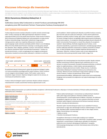 Kluczowe informacje dla inwestorów Niniejszy dokument zawiera kluczowe informacje dla inwestorów dotyczące tego Funduszu. Nie są to materiały marketingowe. Dostarczenie tych informacji jest wymogiem prawnym mającym na celu ułatwienie zrozumienia charakteru i ryzyka związanego z inwestowaniem w ten Fundusz. Przeczytanie niniejszego dokumentu jest zalecane inwestorowi, aby mógł on podjąć świadomą decyzję inwestycyjną. NN (L) Dynamiczny Globalnej Alokacji kat. K ISIN: Subfundusz (zwany dalej Funduszem) w ramach funduszu parasolowego NN SFIO zarządzany przez NN Investment Partners Towarzystwo Funduszy Inwestycyjnych S.A. Cele i polityka inwestycyjna Fundusz dąży do wzrostu wartości aktywów w wyniku wzrostu wartości jego lokat. Fundusz inwestuje do 100% zgromadzonych aktywów w fundusz luksemburski NN (L) First Class Multi Asset Premium. Stopa zwrotu Funduszu NN (L) Dynamiczny Globalnej Alokacji jest ściśle powiązana ze stopą zwrotu funduszu luksemburskiego. Ewentualne rozbieżności mogą wynikać z różnego poziomu opłat oraz niepełnej efektywności mechanizmu ograniczającego ryzyko walutowe pomiędzy polskim złotym a euro (hedging). NN (L) First Class Multi Asset Premium inwestuje w szeroką gamę różnych klas aktywów: akcje, obligacje, gotówkę, surowce i nieruchomości. Możliwe jest również stosowanie innych instrumentów finansowych. Fundusz nie posiada benchmarku, a celem zarządzających jest osiąganie atrakcyjnych stóp zwrotu niezależnie od warunków rynkowych z naciskiem na ochronę przed spadkami. Udział ryzykownych aktywów w portfelu funduszu wzrasta, gdy stosunek zysku do ryzyka jest atrakcyjny. Z kolei udział ryzykownych aktywów w portfelu funduszu maleje, gdy ryzyka i niepewność są wysokie. W ramach strategii funduszu zarządzający dąży do generowania atrakcyjnej stopy zwrotu poprzez: 1) zarządzanie alokacją pomiędzy klasami aktywów 2) dobór instrumentów finansowych w ramach klas aktywów 3) zarządzanie ryzykiem i dywersyfikacją Dochody osiągnięte przez Fundusz, w tym otrzymane dywidendy, są ponownie inwestowane i powiększają jego aktywa. Fundusz odkupuje jednostki uczestnictwa na żądanie uczestnika w każdym dniu, na który przypada sesja na Giełdzie Papierów Wartościowych w Warszawie. Zalecenie: niniejszy Fundusz może nie być odpowiedni dla inwestorów, którzy planują wycofać swoje środki w ciągu 5 lat. Profil ryzyka i zysku niższe ryzyko - potencjalnie niższy zysk 1 2 3 wyższe ryzyko - potencjalnie wyższy zysk 4 5 6 7 Na podstawie danych historycznych użytych do przypisania kategorii ryzyka, nie można przewidzieć przyszłego profilu ryzyka Funduszu. Celem Funduszu nie jest osiąganie danej kategorii ryzyka. Profil ryzyka i zysku może w przyszłości ulegać zmianom. Najniższa kategoria ryzyka (1) nie oznacza, że inwestycja jest pozbawiona ryzyka. osiągnięcia celu inwestycyjnego jest stosunkowo wysokie. Ryzyko rynkowe tytułów uczestnictwa funduszy zagranicznych uzależnione jest m.in od sytuacji na rynkach finansowych, kondycji finansowej emitentów, na których wpływ ma ogólnoświatowa, a także krajowa sytuacja gospodarcza i polityczna. Ryzyko płynności jest średnie. Wiąże się ono z trudnością odsprzedaży składowych inwestycji Funduszu przy zachowaniu ceny rynkowej. Wahania kursów walutowych mogą istotnie wpłynąć na stopy zwrotu Funduszu. Fundusz nie gwarantuje zwrotu całości zainwestowanychśrodków. Zabezpieczenie ryzyka zmian kursu walutowego (hedging) może prowadzić do zwiększenia się ryzyka kredytowego lub ryzyka rynkowego. Fundusz należy do kategorii ryzyka 5 ponieważ: Ryzyko rynkowe związane z inwestowaniem w tytuły uczestnictwa funduszy zagranicznych w celu Opłaty Pobierane opłaty przeznaczone są na pokrycie kosztów zarządzania i administracji Funduszem, włączając w to koszty dystrybucji. Niniejsze opłaty pomniejszają potencjalny zysk z inwestycji. Opłaty jednorazowe pobierane przed lub po dokonaniu inwestycji Opłata dystrybucyjna 5% Opłata umorzeniowa brak Opłata za zamianę 1% Są to maksymalne stawki opłat, jakie mogą zostać pobrane z Państwa środków przed ich zainwestowaniem / przed wypłaceniem środków z inwestycji. Opłaty pobierane z Funduszu w ciągu roku Opłaty bieżące 2,29% Opłaty pobierane z Funduszu w określonych warunkach szczególnych Opłata za wyniki brak Podane opłaty dystrybucyjne i umorzeniowe są maksymalnymi stawkami opłat, jakie mogą zostać pobrane z Państwa środków przed ich zainwestowaniem / przed wypłaceniem środków z inwestycji. W niektórych przypadkach mogą być one niższe. W celu uzyskania informacji na temat wysokości opłat mających zastosowanie do Państwa inwestycji zalecamy kontakt z doradcą lub dystrybutorem. Wysokość opłat i kosztów bieżących opiera się na wydatkach Funduszu poniesionych w ciągu roku obrotowego Funduszu zakończonego w 12-2016 roku. Wysokość opłat i kosztów bieżących może co roku ulegać zmianie. Opłaty i koszty bieżące nie zawierają: • Opłaty za wynik, • Kosztów transakcyjnych Funduszu. Szczegółowe informacje na temat opłat znajdują się w rozdziale poświęconym Funduszowi w punkcie “Informacje o wysokości opłat i prowizji związanych z uczestnictwem w Subfunduszu sposobie ich naliczania i pobierania oraz o kosztach obciążających Subfundusz” prospektu informacyjnego dostępnego na stronie internetowej www.nntfi.pl lub u dystrybutorów. Wyniki osiągnięte w przeszłości Dla niniejszej kategorii jednostki funduszu brakuje dostatecznych danych, umożliwiających rzetelne przedstawienie historycznych wyników funduszu. 120% 100% 80% 60% 40% 20% 0% 2012 2013 2014 2015 2016 Fundusz Informacje praktyczne • Depozytariuszem Funduszu jest: ING Bank Śląski S.A. • Dodatkowe informacje o Funduszu, w tym o innych kategoriach jednostek uczestnictwa Funduszu, prospekt informacyjny oraz roczne i półroczne sprawozdania finanso