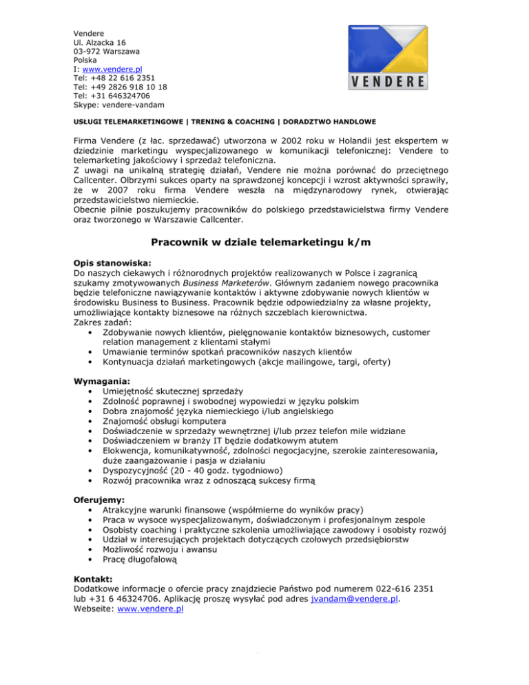 Vendere Ul. Alzacka 16 03-972 Warszawa Polska I: www.vendere.pl Tel: +48 22 616 2351 Tel: +49 2826 918 10 18 Tel: +31 646324706 Skype: vendere-vandam USŁUGI TELEMARKETINGOWE | TRENING & COACHING | DORADZTWO HANDLOWE Firma Vendere (z łac. sprzedawać) utworzona w 2002 roku w Holandii jest ekspertem w dziedzinie marketingu wyspecjalizowanego w komunikacji telefonicznej: Vendere to telemarketing jakościowy i sprzedaż telefoniczna. Z uwagi na unikalną strategię działań, Vendere nie można porównać do przeciętnego Callcenter. Olbrzymi sukces oparty na sprawdzonej koncepcji i wzrost aktywności sprawiły, że w 2007 roku firma Vendere weszła na międzynarodowy rynek, otwierając przedstawicielstwo niemieckie. Obecnie pilnie poszukujemy pracowników do polskiego przedstawicielstwa firmy Vendere oraz tworzonego w Warszawie Callcenter. Pracownik w dziale telemarketingu k/m Opis stanowiska: Do naszych ciekawych i różnorodnych projektów realizowanych w Polsce i zagranicą szukamy zmotywowanych Business Marketerów. Głównym zadaniem nowego pracownika będzie telefoniczne nawiązywanie kontaktów i aktywne zdobywanie nowych klientów w środowisku Business to Business. Pracownik będzie odpowiedzialny za własne projekty, umożliwiające kontakty biznesowe na różnych szczeblach kierownictwa. Zakres zadań: • Zdobywanie nowych klientów, pielęgnowanie kontaktów biznesowych, customer relation management z klientami stałymi • Umawianie terminów spotkań pracowników naszych klientów • Kontynuacja działań marketingowych (akcje mailingowe, targi, oferty) Wymagania: • Umiejętność skutecznej sprzedaży • Zdolność poprawnej i swobodnej wypowiedzi w języku polskim • Dobra znajomość języka niemieckiego i/lub angielskiego • Znajomość obsługi komputera • Doświadczenie w sprzedaży wewnętrznej i/lub przez telefon mile widziane • Doświadczeniem w branży IT będzie dodatkowym atutem • Elokwencja, komunikatywność, zdolności negocjacyjne, szerokie zainteresowania, duże zaangażowanie i pasja w działaniu • Dyspozycyjność (20 - 40 godz. tygodniowo) • Rozwój pracownika wraz z odnoszącą sukcesy firmą Oferujemy: • Atrakcyjne warunki finansowe (współmierne do wyników pracy) • Praca w wysoce wyspecjalizowanym, doświadczonym i profesjonalnym zespole • Osobisty coaching i praktyczne szkolenia umożliwiające zawodowy i osobisty rozwój • Udział w interesujących projektach dotyczących czołowych przedsiębiorstw • Możliwość rozwoju i awansu • Pracę długofalową Kontakt: Dodatkowe informacje o ofercie pracy znajdziecie Państwo pod numerem 022-616 2351 lub +31 6 46324706. Aplikację proszę wysyłać pod adres [email protected]. Webseite: www.vendere.pl .