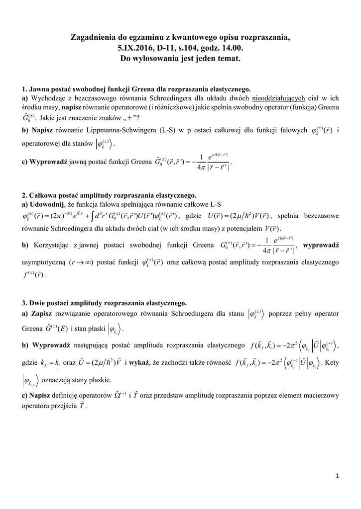 Zagadnienia do egzaminu z kwantowego opisu rozpraszania, 5.IX.2016, D-11, s.104, godz. 14.00. Do wylosowania jest jeden temat. 1. Jawna postać swobodnej funkcji Greena dla rozpraszania elastycznego. a) Wychodząc z bezczasowego równania Schroedingera dla układu dwóch nieoddziałujących ciał w ich środku masy, napisz równanie operatorowe (i różniczkowe) jakie spełnia swobodny operator (funkcja) Greena Gˆ 0( ) . Jakie jest znaczenie znaków „ ”? b) Napisz równanie Lippmanna-Schwingera (L-S) w p ostaci całkowej dla funkcji falowych k( ) ( r ) i operatorowej dla stanów k( ) . 1 e ik |r r '| c) Wyprowadź jawną postać funkcji Greena Gˆ 0( ) ( r , r ') . 4 | r r ' | 2. Całkowa postać amplitudy rozpraszania elastycznego. a) Udowodnij, że funkcja falowa spełniająca równanie całkowe L-S k( ) ( r ) (2 ) 3 2 eik r d 3r ' G0( ) ( r , r ')U ( r ')k( ) ( r ') , gdzie U (r ) (2 2 )V ( r ) , spełnia bezczasowe równanie Schroedingera dla układu dwóch ciał (w ich środku masy) z potencjałem V ( r ) . b) Korzystając z jawnej postaci swobodnej funkcji Greena G0( ) ( r , r ') 1 e ik |r r '| , wyprowadź 4 | r r ' | asymptotyczną ( r ) postać funkcji k( ) ( r ) oraz całkową postać amplitudy rozpraszania elastycznego f ( ) ( rˆ) . 3. Dwie postaci amplitudy rozpraszania elastycznego. a) Zapisz rozwiązanie operatorowego równania Schroedingera dla stanu k( ) poprzez pełny operator Greena Gˆ ( ) ( E ) i stan płaski k . i b) Wyprowadź następującą postać amplituda rozpraszania elastycznego f (k f , ki ) 2 2 k Uˆ k( ) , f gdzie k f ki oraz Uˆ (2 k 2 i )Vˆ i wykaż, że zachodzi także równość f (k f , ki ) 2 2 k( ) Uˆ k . Kety f i oznaczają stany płaskie. i, f ˆ ( ) i Tˆ oraz przedstaw amplitudę rozpraszania poprzez element macierzowy c) Napisz definicję operatorów operatora przejścia Tˆ . 1 4. Wzór Rutherforda. a) Zapisz amplitudę rozpraszania elastycznego f (k f , ki ) 2 2 k( ) Uˆ k f w przybliżeniu Borna. i b) Wyprowadź postać amplitudy rozpraszania w przybliżeniu Borna dla rozpraszania elektronu na atomie wieloelektronowym przy dużej energii zderzenia. Potencjał oddziaływania to potencjał Yukawy V (r ) Cr 1e r , gdzie C Zkel e2 . Wskazówka: Pomocnym jest wzór f B ( q) 1 dr r sin( qr )U ( r ) . q 0 c) Następnie, przechodząc do granicy 0 , wyprowadź wzór Rutherforda na różniczkowy przekrój czynny 2 Zkel e2 ( ) . 2 4 E sin ( 2) B 5. Stosowalność przybliżenia Borna. Zapisz całkowe równanie L-S, jako sumę fali płaskiej k ( r ) i fali rozproszonej s( ) ( r ) . Następnie przyjmij, że potencjał o zasięgu a daje się od góry oszacować, r | U ( r ) | U0 , oraz że jest na tyle słaby, że | s( ) ( r ) | | k ( r ) | . Wykaż, że wtedy nierówność ta wymusza a) | V0 | 2 ( a 2 ) dla ka 0 , b) | V0 | v a dla ka . 6. Rozwinięcie parcjalne. Korzystając z rozwinięcia parcjalnego fali płaskiej k ( r ) l /0 i l (2l 1) jl (kr ) Pl (kˆ rˆ) oraz asymptotycznej postaci rozwiązania równania L-S, k( ) ( r ) (2 )3 2 [eik r eikr f ( rˆ) r ] , dla rozpraszania elastycznego na potencjale sferycznie symetrycznym, wyprowadź rozwinięcie parcjalne a) amplitudy rozpraszania f ( rˆ) , b) przekroju czynnego. Wskazówki: Przyjmij, że rozwinięcie parcjalne funkcji k( ) ( r ) ma dla każdego r postać k( ) ( r ) l /0 Cl (k ) l ( r )r 1Pl (kˆ rˆ) , natomiast dla kr mamy l (r) Al (k )sin[kr l 2 l (k )] oraz jl (kr ) sin(kr l 2)] (kr ) . 7. Długość rozpraszania elastycznego. Wiadomo, że funkcja radialna l (kr ) wchodząca w skład rozwinięcia parcjalnego k( ) ( r ) (2 ) 3 2 (1 kr)l /0 i l (2l 1)ei ( k ) l (kr) Pl (kˆ rˆ) ma asymptotykę (dla kr ): l l (r) Al (k )sin[kr l 2 l (k )] . a) Znając w danym punkcie r0 wartość funkcji l ( r0 ) oraz jej pochodnej d l ( r0 ) dr , oblicz długość rozpraszania limk 0 tg[ 0 (k )] k . b) Wykaż, że przy k 0 całkowity przekrój czynny na rozpraszanie elastyczne wynosi tot 4 2 . 2 8. Rozpraszanie z absorbcją i operatory Møllera. a) Rozpraszanie z absorbcją może być opisane matematycznie przy pomocy potencjału optycznego, tzn. potencjału zespolonego z ujemną częścią urojoną ImV(r) = -W(r). Wykaż, że całkowity przekrój czynny na absorbcję ma postać abs (2 )3 (k E ) k( ) W k( ) . b) Podaj definicję operatorów Møllera oraz udowodnij, że spełniają one odpowiednie równanie L-S. 1 (2l 1)eil ( k ) sin[ l (k )]Pl ( cos ) , wyprowadź k l /0 postać rozwinięcia parcjalnego całkowitego przekroju czynnego na rozpraszanie elastyczne. 4 l * Wskazówka: Pl (aˆ bˆ) Ylm (aˆ )Ylm (bˆ) . 2l 1 m/ l 9. a) Korzystając z postaci amplitudy rozpraszania f ( ) b) Wykaż, że w przypadku występowania rezonansu kształtu dla fali parcjalnej lr przy energii zderzenia Er , całkowity przekrój czynny przybiera postać wzoru Breita-Wignera 1 ( lr 2)2 4 d ( E ) 2 (2lr 1) , gdzie 2 ctg ( E ) lr lr dE . k ( E E )2 ( 2)2 r lr 10. Podaj definicję operatorów Møllera i udowodnij następujące twierdzenia: ˆ ( ) d 3k ( ) , a) k i ,k † gdzie i ,k i ,k , natomiast i ,k oznacza ket fali płaskiej, ˆ ( )† ˆ () 1 , b) ˆ ( ) ˆ ( )† 1 , gdzie n oznacza stan związany, c) n n n ˆ ( )† 1 ˆ ( )†VG ˆ ˆ ( ) (E) , d) 0 ˆ ( ) [1 Gˆ ( ) ( E )Vˆ ]1 . e) 0 11. a) Podaj definicję i udowodnij unitarność operatora Ŝ . Wskazówka: Dowód przeprowadź w bazie stanów płaskich, skorzystaj z odpowiednich twierdzeń z punktu 10. b) Na wykładzie wykazałem, że różniczkowy przekrój czynny na przejście kwantowe między stanami płaskimi k k i w wyniku zderzenia (nie koniecznie elastycznego) ma postać f d (2 )4 2 ki 2 ( Ef Ei ) Tk ,k d 3kf , gdzie Tkf ,ki kf Vˆ k(i ) . f i Wykaż, że w przypadku rozpraszania elastycznego ( k f ki ) cząstek bez struktury (punktowych) wzór ten, 2 po wykonaniu jednego całkowania, redukuje się do znanego wzoru d f (kf , ki ) d f . 3 12. Rozkład parcjalny macierzy rozpraszania. Wiedząc, że związek pomiędzy macierzami operatorów rozpraszania Ŝ i 