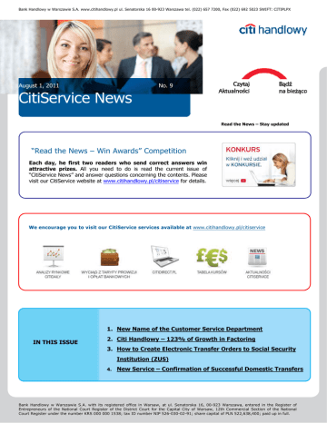 Bank Handlowy w Warszawie S.A. www.citihandlowy.pl ul. Senatorska 16 00-923 Warszawa tel. (022) 657 7200, Fax (022) 692 5023 SWIFT: CITIPLPX August 1, 2011 No. 9 CitiService News Read the News – Stay updated “Read the News – Win Awards” Competition Each day, he first two readers who send correct answers win attractive prizes. All you need to do is read the current issue of “CitiService News” and answer questions concerning the contents. Please visit our CitiService website at www.citihandlowy.pl/citiservice for details. We encourage you to visit our CitiService services available at www.citihandlowy.pl/citiservice 1. New Name of the Customer Service Department IN THIS ISSUE 2. Citi Handlowy – 123% of Growth in Factoring 3. How to Create Electronic Transfer Orders to Social Security Institution (ZUS) 4. New Service – Confirmation of Successful Domestic Transfers Bank Handlowy w Warszawie S.A. with its registered office in Warsaw, at ul. Senatorska 16, 00-923 Warszawa, entered in the Register of Entrepreneurs of the National Court Register of the District Court for the Capital City of Warsaw, 12th Commercial Section of the National Court Register under the number KRS 000 000 1538; tax ID number NIP 526-030-02-91; share capital of PLN 522,638,400; paid up in full. Bank Handlowy w Warszawie S.A. www.citihandlowy.pl ul. Senatorska 16 00-923 Warszawa tel. (022) 657 7200, Fax (022) 692 5023 SWIFT: CITIPLPX This August 1, 2011 we are changing the name of our Customer Service Department to CitiService. Over the years, the Customer Service Department has cemented its strong position among corporate clients. It has been 16 years since we started supporting our corporate clients in solving their operational and transactional issues. NEW NAME OF THE CUSTOMER SERVICE DEPARTMENT Our unique structure in which all matters are reported in one place is an effective and proved mechanism. Personalized approach to each company and good knowledge of your needs help us build long-lasting relationships. With the new name, we will be able to position our corporate service as a place in which both the existing and potential clients can receive any information they need in a quick and professional manner. For this purpose we give you access to one CitiService phone number, 801 2484 24, and one e-mail address. Our customer service standards remain unchanged. We make customer satisfaction our top priority so that each client sees CitiService as his or her trusted adviser. Quality is one of the main strategic assumptions of Citi Handlowy for the coming years and the new CitiService with its principles certainly fits into this strategy. RETURN TO LIST OF TOPICS OF CITISERVICE NEWS Factoring volumes of Citi Handlowy (or, the value of invoices acquired by the Bank) ver the first six months of the year totaled PLN 2.6 billion compared with LN 1.2 billion in the first half of 2010. With that result Citi Handlowy increased its hare in the factoring market. Citi Handlowy took the second place among banks terms of factoring volumes with a share of 19% (up by 4% from last quarter), nd was ranked on the fifth place among all factoring institutions (banks and CITI HANDLOWY – her institutions that provide factoring services) with a share of 7.6% (up by 1.2% 123% OF GROWTH INom last quarter). The success was possible because of the dynamic growth in the number of signed FACTORING agreements – 110 agreements from January to June compared with a total of 144 throughout the entire last year. In particular, clients valued structured transactions, which combine a number of existing products adjusted to suit the needs of the company, and which allow for financing both the accounts receivable and accounts payable. RETURN TO LIST OF TOPICS OF CITISERVICE NEWS Bank Handlowy w Warszawie S.A. with its registered office in Warsaw, at ul. Senatorska 16, 00-923 Warszawa, entered in the Register of Entrepreneurs of the National Court Register of the District Court for the Capital City of Warsaw, 12th Commercial Section of the National Court Register under the number KRS 000 000 1538; tax ID number NIP 526-030-02-91; share capital of PLN 522,638,400; paid up in full. Bank Handlowy w Warszawie S.A. www.citihandlowy.pl ul. Senatorska 16 00-923 Warszawa tel. (022) 657 7200, Fax (022) 692 5023 SWIFT: CITIPLPX How to make an electronic transfer order to the Social Security Institution fast and hassle-free? Most frequently encountered problems: - NIP – in the field concerning the NIP number enter the 10-digit NIP of the payer (without any separators such as the dash ‘-‘, space, etc.!) - Identifier Type – the following values selected from the menu are permitted: REGON (R), PESEL (P), personal identity card number (1), passport number (2). - Number – in this field you need to enter the number of the Payer Identifier you selected; depending on the type of the identifier, the number consists of: Personal identity card number – 3 letters + 6 digits, HOW TO CREATE Passport number – the length of the passport number is not standardized, ELECTRONIC PESEL number – 11 digits, REGON number – 9 or 14 digits, TRANSFER ORDERS TO SOCIAL SECURITY - Declaration type – choose the right declaration type from the list: INSTITUTION REMINDER A – additional payment, private individual; B – additional payment, institution; D – additional payment determined by the Social Security Institution; E – enforcement costs; T – deferred payment date; U – installment scheme; M – period longer than one month; S – contribution for one month. - Date – enter the date according to the YYYYMM format (year – 4 digits, month – 2 digits) for all Declaration Types, e.g. 200503. - Declaration Number – enter two-digit declaration number. RETURN TO LIST OF TOPICS OF CITISERVICE NEWS Bank Handlowy w Warszawie S.A. with its registered office in Warsaw, at ul. Senatorska 16, 00-923 Warszawa, entered in the Register of Entrepreneurs of the