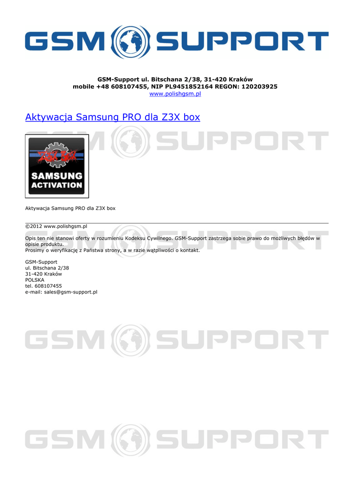 GSM-Support ul. Bitschana 2/38, 31-420 Kraków mobile +48 608107455, NIP PL9451852164 REGON: 120203925 www.polishgsm.pl Aktywacja Samsung PRO dla Z3X box Aktywacja Samsung PRO dla Z3X box ©2012 www.polishgsm.pl Opis ten nie stanowi oferty w rozumieniu Kodeksu Cywilnego. GSM-Support zastrzega sobie prawo do możliwych błędów w opisie produktu. Prosimy o weryfikację z Państwa strony, a w razie wątpliwości o kontakt. GSM-Support ul. Bitschana 2/38 31-420 Kraków POLSKA tel. 608107455 e-mail: [email protected] Powered by TCPDF (www.tcpdf.org)