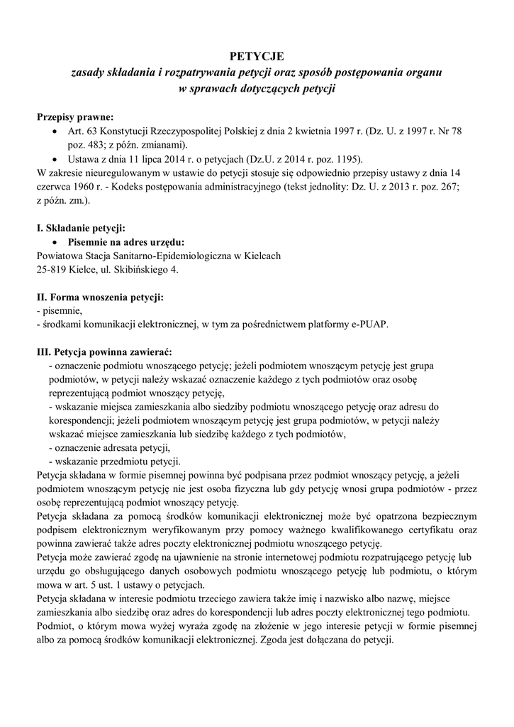 PETYCJE zasady składania i rozpatrywania petycji oraz sposób postępowania organu w sprawach dotyczących petycji Przepisy prawne: Art. 63 Konstytucji Rzeczypospolitej Polskiej z dnia 2 kwietnia 1997 r. (Dz. U. z 1997 r. Nr 78 poz. 483; z późn. zmianami). Ustawa z dnia 11 lipca 2014 r. o petycjach (Dz.U. z 2014 r. poz. 1195). W zakresie nieuregulowanym w ustawie do petycji stosuje się odpowiednio przepisy ustawy z dnia 14 czerwca 1960 r. - Kodeks postępowania administracyjnego (tekst jednolity: Dz. U. z 2013 r. poz. 267; z późn. zm.). I. Składanie petycji: Pisemnie na adres urzędu: Powiatowa Stacja Sanitarno-Epidemiologiczna w Kielcach 25-819 Kielce, ul. Skibińskiego 4. II. Forma wnoszenia petycji: - pisemnie, - środkami komunikacji elektronicznej, w tym za pośrednictwem platformy e-PUAP. III. Petycja powinna zawierać: - oznaczenie podmiotu wnoszącego petycję; jeżeli podmiotem wnoszącym petycję jest grupa podmiotów, w petycji należy wskazać oznaczenie każdego z tych podmiotów oraz osobę reprezentującą podmiot wnoszący petycję, - wskazanie miejsca zamieszkania albo siedziby podmiotu wnoszącego petycję oraz adresu do korespondencji; jeżeli podmiotem wnoszącym petycję jest grupa podmiotów, w petycji należy wskazać miejsce zamieszkania lub siedzibę każdego z tych podmiotów, - oznaczenie adresata petycji, - wskazanie przedmiotu petycji. Petycja składana w formie pisemnej powinna być podpisana przez podmiot wnoszący petycję, a jeżeli podmiotem wnoszącym petycję nie jest osoba fizyczna lub gdy petycję wnosi grupa podmiotów - przez osobę reprezentującą podmiot wnoszący petycję. Petycja składana za pomocą środków komunikacji elektronicznej może być opatrzona bezpiecznym podpisem elektronicznym weryfikowanym przy pomocy ważnego kwalifikowanego certyfikatu oraz powinna zawierać także adres poczty elektronicznej podmiotu wnoszącego petycję. Petycja może zawierać zgodę na ujawnienie na stronie internetowej podmiotu rozpatrującego petycję lub urzędu go obsługującego danych osobowych podmiotu wnoszącego petycję lub podmiotu, o którym mowa w art. 5 ust. 1 ustawy o petycjach. Petycja składana w interesie podmiotu trzeciego zawiera także imię i nazwisko albo nazwę, miejsce zamieszkania albo siedzibę oraz adres do korespondencji lub adres poczty elektronicznej tego podmiotu. Podmiot, o którym mowa wyżej wyraża zgodę na złożenie w jego interesie petycji w formie pisemnej albo za pomocą środków komunikacji elektronicznej. Zgoda jest dołączana do petycji. IV. Rejestracja petycji: Petycje wpływające do Państwowego Powiatowego Inspektora Sanitarnego są rejestrowane w Rejestrze Petycji prowadzonym przez Oddział Kadr i Szkoleń Powiatowej Stacji Sanitarno- Epidemiologicznej w Kielcach. V. Informacje ogólne: - Prawo składania petycji do organów administracji publicznej gwarantuje obywatelom Konstytucja RP. - Petycja może być złożona przez osobę fizyczną, osobę prawną, jednostkę organizacyjną niebędącą osobą prawną lub grupę tych podmiotów, zwaną dalej "podmiotem wnoszącym petycję", do organu władzy publicznej, a także do organizacji lub instytucji społecznej w związku z wykonywanymi przez nią zadaniami zleconymi z zakresu administracji publicznej. - Petycja może być złożona w interesie publicznym, podmiotu wnoszącego petycję, podmiotu trzeciego, za jego zgodą. - Przedmiotem petycji może być żądanie, w szczególności, zmiany przepisów prawa, podjęcia rozstrzygnięcia lub innego działania w sprawie dotyczącej podmiotu wnoszącego petycję, życia zbiorowego lub wartości wymagających szczególnej ochrony w imię dobra wspólnego, mieszczących się w zakresie zadań i kompetencji adresata petycji. - Petycję należy kierować do organu właściwego do jej rozpatrzenia. - Petycja powinna być rozpatrzona bez zbędnej zwłoki, jednak nie później niż w terminie 3 miesięcy od dnia jej złożenia. - W przypadku wystąpienia okoliczności niezależnych od podmiotu rozpatrującego petycję uniemożliwiających rozpatrzenie petycji w terminie, o którym mowa wyżej, termin ten ulega przedłużeniu, nie dłużej jednak niż do 3 miesięcy, licząc od upływu terminu, o którym mowa wyżej. - Adresat petycji, który jest niewłaściwy do jej rozpatrzenia, przesyła ją niezwłocznie, nie później jednak niż w terminie 30 dni od dnia jej złożenia, do podmiotu właściwego do rozpatrzenia petycji, zawiadamiając o tym równocześnie podmiot wnoszący petycję. - Jeżeli petycja nie spełnia wymogów, o których mowa w art. 4 ust. 2 pkt 1 lub 2 ustawy o petycjach, pozostawia się ją bez rozpatrzenia. - Jeżeli petycja, nie spełnia wymogów określonych w art. 4 ust. 1, ust. 2 pkt 3 lub 4 lub art. 5 ust. 1 lub 2 ustawy o petycjach, podmiot właściwy do rozpatrzenia petycji wzywa, w terminie 30 dni od dnia złożenia petycji, podmiot wnoszący petycję do uzupełnienia lub wyjaśnienia treści petycji w terminie 14 dni z pouczeniem, że petycja, której treść nie zostanie uzupełniona lub wyjaśniona, nie będzie rozpatrzona. - Na stronie internetowej podmiotu rozpatrującego petycję lub urzędu go obsługującego niezwłocznie zamieszcza się informację zawierającą odwzorowanie cyfrowe (skan) petycji, datę jej złożenia oraz – w przypadku wyrażenia zgody, o której mowa w art. 4 ust. 3 ustawy o petycjach - imię i nazwisko albo nazwę podmiotu wnoszącego petycję lub podmiotu, w interesie którego petycja jest składana. - Informacja, o której mowa wyżej jest niezwłocznie aktualizowana o dane dotyczące przebiegu postępowania, w szczególności dotyczące zasięganych opinii, przewidywanego terminu oraz sposobu załatwienia petycji. - Podmiot rozpatrujący petycję zawiadamia podmiot wnoszący petycję o sposobie jej załatwienia wraz z uzasadnieniem w formie pisemnej albo za pomocą środków komunikacji elektronicznej. - Sposób załatwienia petycji nie może by
