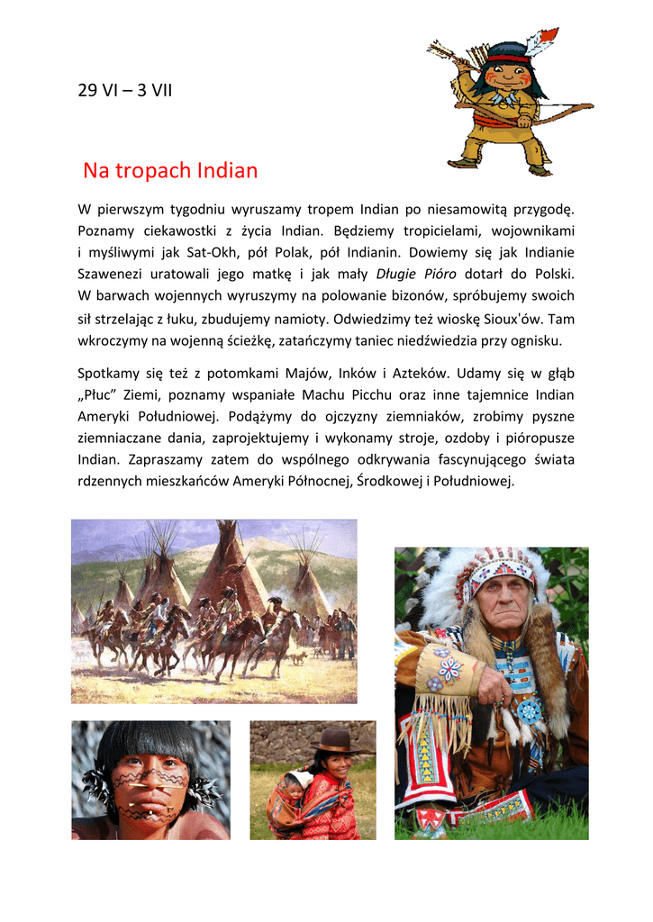 29 VI – 3 VII Na tropach Indian W pierwszym tygodniu wyruszamy tropem Indian po niesamowitą przygodę. Poznamy ciekawostki z życia Indian. Będziemy tropicielami, wojownikami i myśliwymi jak Sat-Okh, pół Polak, pół Indianin. Dowiemy się jak Indianie Szawenezi uratowali jego matkę i jak mały Długie Pióro dotarł do Polski. W barwach wojennych wyruszymy na polowanie bizonów, spróbujemy swoich sił strzelając z łuku, zbudujemy namioty. Odwiedzimy też wioskę Sioux'ów. Tam wkroczymy na wojenną ścieżkę, zatańczymy taniec niedźwiedzia przy ognisku. Spotkamy się też z potomkami Majów, Inków i Azteków. Udamy się w głąb „Płuc” Ziemi, poznamy wspaniałe Machu Picchu oraz inne tajemnice Indian Ameryki Południowej. Podążymy do ojczyzny ziemniaków, zrobimy pyszne ziemniaczane dania, zaprojektujemy i wykonamy stroje, ozdoby i pióropusze Indian. Zapraszamy zatem do wspólnego odkrywania fascynującego świata rdzennych mieszkańców Ameryki Północnej, Środkowej i Południowej.