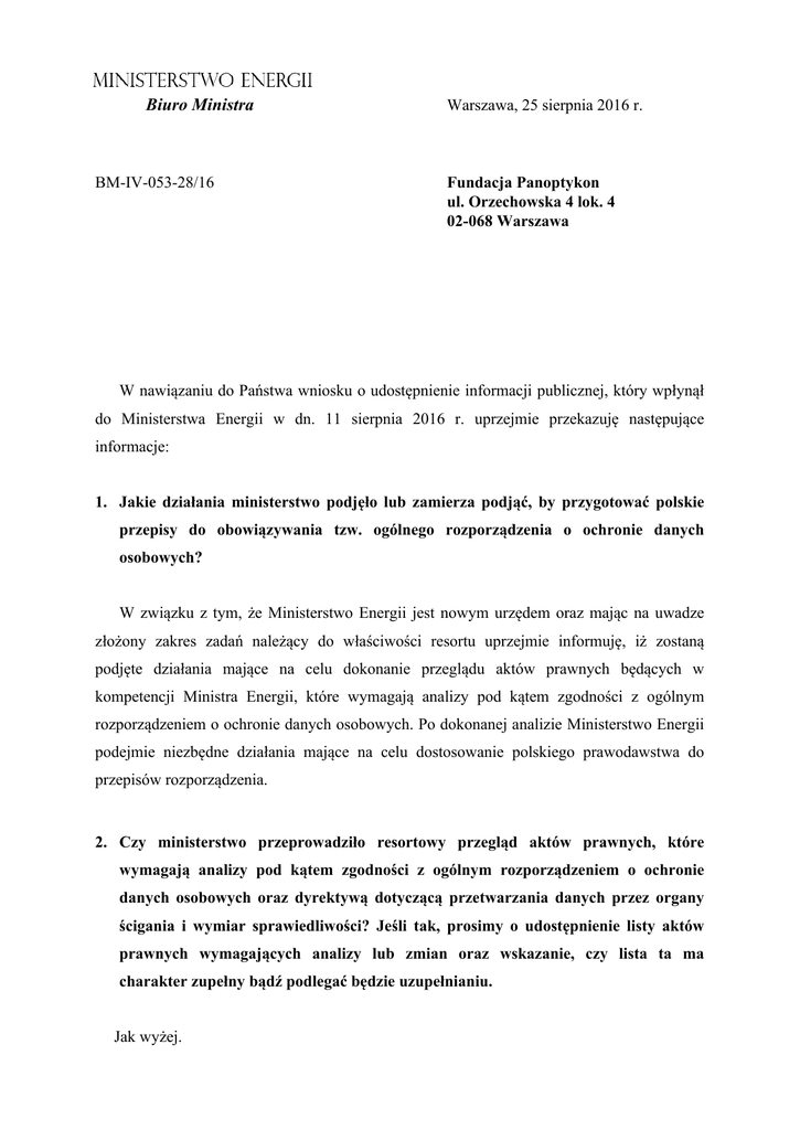 Biuro Ministra BM-IV-053-28/16 Warszawa, 25 sierpnia 2016 r. Fundacja Panoptykon ul. Orzechowska 4 lok. 4 02-068 Warszawa W nawiązaniu do Państwa wniosku o udostępnienie informacji publicznej, który wpłynął do Ministerstwa Energii w dn. 11 sierpnia 2016 r. uprzejmie przekazuję następujące informacje: 1. Jakie działania ministerstwo podjęło lub zamierza podjąć, by przygotować polskie przepisy do obowiązywania tzw. ogólnego rozporządzenia o ochronie danych osobowych? W związku z tym, że Ministerstwo Energii jest nowym urzędem oraz mając na uwadze złożony zakres zadań należący do właściwości resortu uprzejmie informuję, iż zostaną podjęte działania mające na celu dokonanie przeglądu aktów prawnych będących w kompetencji Ministra Energii, które wymagają analizy pod kątem zgodności z ogólnym rozporządzeniem o ochronie danych osobowych. Po dokonanej analizie Ministerstwo Energii podejmie niezbędne działania mające na celu dostosowanie polskiego prawodawstwa do przepisów rozporządzenia. 2. Czy ministerstwo przeprowadziło resortowy przegląd aktów prawnych, które wymagają analizy pod kątem zgodności z ogólnym rozporządzeniem o ochronie danych osobowych oraz dyrektywą dotyczącą przetwarzania danych przez organy ścigania i wymiar sprawiedliwości? Jeśli tak, prosimy o udostępnienie listy aktów prawnych wymagających analizy lub zmian oraz wskazanie, czy lista ta ma charakter zupełny bądź podlegać będzie uzupełnianiu. Jak wyżej. 3. Czy w planach legislacyjnych ministerstwa uwzględniono potrzebę dostosowania polskiego prawodawstwa do przepisów rozporządzenia? W planach legislacyjnych Ministerstwa Energii nie uwzględniono potrzeby dostosowania polskiego prawodawstwa do przepisów rozporządzenia. Z poważaniem Iwona Dżygała Zastępca Dyrektora Biura Ministra /podpisano elektronicznie/ 2/2 Potwierdzam zgodność kopii wydruku z dokumentem elektronicznym: Identyfikator dokumentu 26671.87225.44176 Nazwa dokumentu UDIP Akty prawne w zakresie dostosowania krajowych aktów prawnych dot. danych osobowych.doc Tytuł dokumentu UDIP Akty prawne w zakresie dostosowania krajowych aktów prawnych dot. danych osobowych Sygnatura dokumentu BM-IV-053-28/16 Data dokumentu 2016-08-25 Skrót dokumentu F40D88A725603DBC518FB5E767E5D31E74D81EB8 Wersja dokumentu 1.1 Data podpisu 2016-08-25 15:45:32 Podpisane przez Iwona Maria Dżygała EZD 3.18.2020.2499.7039 Data wydruku: 2016-08-25 Autor wydruku: Bartkowska Ilona (referendarz)