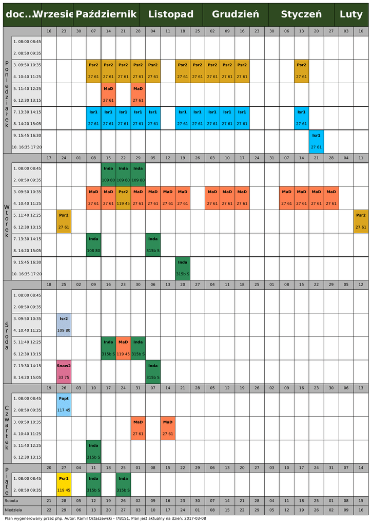 doc.... Wrzesień Październik 16 23 30 Listopad 07 14 21 28 04 3. 09:50 10:35 Psr2 Psr2 Psr2 Psr2 4. 10:40 11:25 27 61 27 61 27 61 27 61 11 Grudzień 23 Styczeń 18 25 02 09 16 30 06 13 Psr2 Psr2 Psr2 Psr2 Psr2 Psr2 Psr2 27 61 27 61 27 61 27 61 27 61 27 61 27 61 20 Luty 27 03 10 04 11 1. 08:00 08:45 2. 08:50 09:35 P o n i e d z i a ł e k 5. 11:40 12:25 MaD MaD 6. 12:30 13:15 27 61 27 61 7. 13:30 14:15 Isr1 Isr1 Isr1 Isr1 Isr1 Isr1 Isr1 Isr1 Isr1 Isr1 Isr1 8. 14:20 15:05 27 61 27 61 27 61 27 61 27 61 27 61 27 61 27 61 27 61 27 61 27 61 9. 15:45 16:30 Isr1 10. 16:35 17:20 27 61 17 24 01 08 1. 08:00 08:45 2. 08:50 09:35 W t o r e k 15 22 29 Inda Inda Inda 05 12 19 26 03 10 17 24 31 07 14 21 28 109 80 109 80 109 80 3. 09:50 10:35 MaD MaD Psr2 MaD MaD MaD MaD MaD MaD MaD MaD MaD MaD MaD 4. 10:40 11:25 27 61 27 61 119 45 27 61 27 61 27 61 27 61 27 61 27 61 27 61 27 61 27 61 27 61 27 61 5. 11:40 12:25 Psr2 Psr2 6. 12:30 13:15 27 61 27 61 7. 13:30 14:15 Inda Inda 8. 14:20 15:05 108 80 315b S 9. 15:45 16:30 Inda 10. 16:35 17:20 315b S 18 25 02 09 16 23 30 Inda MaD Inda 06 13 20 27 04 11 18 25 01 08 15 22 29 05 12 14 21 28 05 12 19 26 02 09 16 23 30 06 13 1. 08:00 08:45 2. 08:50 09:35 Ś r o d a 3. 09:50 10:35 Isr2 4. 10:40 11:25 109 80 5. 11:40 12:25 6. 12:30 13:15 315b S 119 45 315b S 7. 13:30 14:15 Snaw2 Inda 8. 14:20 15:05 33 75 315b S 19 C z w a r t e k 26 1. 08:00 08:45 Fopt 2. 08:50 09:35 117 45 03 10 17 24 31 07 3. 09:50 10:35 MaD MaD 4. 10:40 11:25 27 61 27 61 5. 11:40 12:25 Inda 6. 12:30 13:15 315b S P i 1. 08:00 08:45 ą t 2. 08:50 09:35 e k Sobota 20 27 04 11 18 21 28 05 12 19 Niedziela 22 29 06 13 20 25 01 08 15 22 29 06 13 20 27 03 10 17 24 31 07 14 26 02 09 16 23 30 07 14 21 28 04 11 18 25 01 08 15 27 03 10 17 24 01 08 15 22 29 05 12 19 26 02 09 16 Psr1 Inda Inda 119 45 315b S 315b S Plan wygenerowany przez php. Autor: Kamil Ostaszewski - I7B1S1. Plan jest aktualny na dzień: 2017-03-08