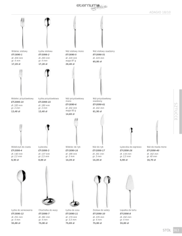 ADAGIO 18/10 Widelec stołowy Łyżka stołowa Nóż stołowy mono Nóż stołowy osadzony ET-2090-1 ET-2090-2 ET-2090-5 ET-2090-51 dł. 204 mm gr. 4 mm dł. 205 mm gr. 4 mm dł. 224 mm waga 87 g dł. 224 mm 17,20 zł 17,20 zł 20,40 zł Widelec przystawkowy Łyżka przystawkowa ET-2090-14 ET-2090-15 Nóż przystawkowy mono Nóż przystawkowy osadzony dł. 183 mm gr. 3 mm dł. 180 mm gr. 3 mm ET-2090-6 ET-2090-61 dł. 202 mm 13,40 zł 13,40 zł dł. 202 mm waga 60 g Widelczyk do ciasta Łyżeczka Widelec do ryb Nóż do ryb Łyżeczka do espresso Nóż do masła mono ET-2090-4 ET-2090-3 ET-2090-16 ET-2090-17 ET-2090-26 ET-2090-40 dł. 140 mm gr. 2,5 mm dł. 137 mm gr. 2,5 mm dł. 189 mm gr. 3 mm dł. 201 mm gr. 3 mm dł. 116 mm gr. 2,5 mm dł. 162 mm gr. 40 mm 8,30 zł 8,00 zł 14,20 zł 14,20 zł 6,90 zł 16,70 zł Łyżka do serwowania Chochelka do wazy Łyżka do sosu Zestaw do sałaty Łopatka do tortu ET-2090-12 ET-2090-7 ET-2090-11 ET-2090-10 ET-2090-8 dł. 251 mm gr. 4 mm dł. 281 mm gr. 4 mm dł. 174 mm gr. 3,5 mm dł. 235 mm gr. 4 mm dł. 242 mm gr. 4 mm 55,00 zł 75,00 zł 75,00 zł 75,00 zł 55,00 zł SZTUĆCE 14,60 zł 65,00 zł 61,90 zł STÓŁ 363