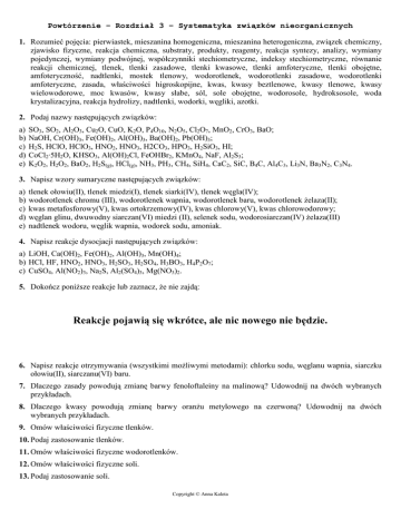 Powtórzenie – Rozdział 3 – Systematyka związków nieorganicznych 1. Rozumieć pojęcia: pierwiastek, mieszanina homogeniczna, mieszanina heterogeniczna, związek chemiczny, zjawisko fizyczne, reakcja chemiczna, substraty, produkty, reagenty, reakcja syntezy, analizy, wymiany pojedynczej, wymiany podwójnej, współczynniki stechiometryczne, indeksy stechiometryczne, równanie reakcji chemicznej, tlenek, tlenki zasadowe, tlenki kwasowe, tlenki amfoteryczne, tlenki obojętne, amfoteryczność, nadtlenki, mostek tlenowy, wodorotlenek, wodorotlenki zasadowe, wodorotlenki amfoteryczne, zasada, właściwości higroskopijne, kwas, kwasy beztlenowe, kwasy tlenowe, kwasy wielowodorowe, moc kwasów, kwasy słabe, sól, sole obojętne, wodorosole, hydroksosole, woda krystalizacyjna, reakcja hydrolizy, nadtlenki, wodorki, węgliki, azotki. 2. Podaj nazwy następujących związków: a) b) c) d) e) SO3, SO2, Al2O3, Cu2O, CuO, K2O, P4O10, N2O5, Cl2O7, MnO2, CrO3, BaO; NaOH, Cr(OH)3, Fe(OH)2, Al(OH)3, Ba(OH)2, Pb(OH)3; H2S, HClO, HClO3, HNO2, HNO3, H2CO3, HPO3, H2SiO3, HI; CoCl2·5H2O, KHSO3, Al(OH)2Cl, FeOHBr2, KMnO4, NaF, Al2S3; K2O2, H2O2, BaO2, H2S(g), HCl(g), NH3, PH3, CH4, SiH4, CaC2, SiC, B4C, Al4C3, Li3N, Ba3N2, C3N4. 3. Napisz wzory sumaryczne następujących związków: a) b) c) d) e) tlenek ołowiu(II), tlenek miedzi(I), tlenek siarki(IV), tlenek węgla(IV); wodorotlenek chromu (III), wodorotlenek wapnia, wodorotlenek baru, wodorotlenek Ŝelaza(II); kwas metafosforowy(V), kwas ortokrzemowy(IV), kwas chlorowy(V), kwas chlorowodorowy; węglan glinu, dwuwodny siarczan(VI) miedzi (II), selenek sodu, wodorosiarczan(IV) Ŝelaza(III) nadtlenek wodoru, węglik wapnia, wodorek sodu, amoniak. 4. Napisz reakcje dysocjacji następujących związków: a) LiOH, Ca(OH)2, Fe(OH)2, Al(OH)3, Mn(OH)4; b) HCl, HF, HNO2, HNO3, H2SO3, H2SO4, H3BO3, H4P2O7; c) CuSO4, Al(NO2)3, Na2S, Al2(SO4)3, Mg(NO3)2. 5. Dokończ poniŜsze reakcje lub zaznacz, Ŝe nie zajdą: Reakcje pojawią się wkrótce, ale nic nowego nie będzie. 6. Napisz reakcje otrzymywania (wszystkimi moŜliwymi metodami): chlorku sodu, węglanu wapnia, siarczku ołowiu(II), siarczanu(VI) baru. 7. Dlaczego zasady powodują zmianę barwy fenoloftaleiny na malinową? Udowodnij na dwóch wybranych przykładach. 8. Dlaczego kwasy powodują zmianę barwy oranŜu metylowego na czerwoną? Udowodnij na dwóch wybranych przykładach. 9. Omów właściwości fizyczne tlenków. 10. Podaj zastosowanie tlenków. 11. Omów właściwości fizyczne wodorotlenków. 12. Omów właściwości fizyczne soli. 13. Podaj zastosowanie soli. Copyright © Anna Kaleta Amfoteryczność tlenków1: Zad. 1. UłoŜyć równania reakcji rozpuszczania siarkowym(IV) i zasadzie potasowej. amfoterycznego tlenku ołowiu(IV) w kwasie Zad. 2. Tlenek arsenu(III) As2O3 jest tlenkiem amfoterycznym. UłoŜyć odpowiednie równania reakcji tego tlenku w kwasie chlorowodorowym i zasadzie sodowej. Zad. 3. UłoŜyć równania reakcji rozpuszczania amfoterycznego tlenku ołowiu(IV) w dowolnym mocnym kwasie i dowolnej mocnej zasadzie. Podać nazwy powstających soli. UWAGA: W reakcjach z zasadą mogą powstawać metaołowiany(IV) M2PbO3 lub ortoołowiany(IV) M4PbO4 (M-metal jednowartościowy). Amfoteryczność wodorotlenków1: Zad. 1. UłoŜyć w formie cząsteczkowej i jonowej równania reakcji rozpuszczania wodorotlenku cynku w roztworze wodorotlenku sodu i w roztworze kwasu siarkowego(VI). Podać nazwy powstających soli. UWAGA: Sole zawierające anion ZnO22− to cynkany. Zad. 2. UłoŜyć w formie cząsteczkowej i jonowej równania reakcji rozpuszczania wodorotlenku ołowiu(II) w roztworze wodorotlenku wapnia i w roztworze kwasu solnego. Podać nazwy powstających soli. UWAGA: Sole zawierające anion PbO22− to ołowiany(II). Zad. 3. UłoŜyć równania reakcji rozpuszczania wodorotlenku cyny(II) i wodorotlenku cyny(IV) w roztworze mocnej zasady oraz mocnego kwasu. Podać nazwy produktów. UWAGA: Sn2+ - związki cyny(II), Sn4+ - związki cyny(IV), SnO22− - cyniany(II), SnO32− cyniany(IV). 1 Reakcje naleŜy zapisać w formie cząsteczkowej, jonowej i jonowej skróconej.