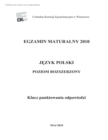 Pobrano ze strony www.sqlmedia.pl Centralna Komisja Egzaminacyjna w Warszawie EGZAMIN MATURALNY 2010 JĉZYK POLSKI POZIOM ROZSZERZONY Klucz punktowania odpowiedzi MAJ 2010 Pobrano ze strony www.sqlmedia.pl 2 Tworzenie informacji Egzamin maturalny z jĊzyka polskiego Klucz punktowania odpowiedzi – poziom rozszerzony Pisanie wáasnego tekstu w związku z tekstem literackim zamieszczonym w arkuszu I. ROZWINIĉCIE TEMATU Za rozwiniĊcie tematu moĪna uzyskaü maksymalnie 26 punktów. Temat 1. Porównaj obrazy Īycia ludzkiego przedstawione w podanych fragmentach. Zwróü uwagĊ na kreacjĊ osoby mówiącej oraz funkcjĊ motywów czasu i natury. 1. Odkrycie zasady zestawienia tekstów, np.: 1 p. teksty z róĪnych epok o podobnym temacie. 2. Przedstawienie kreacji osoby mówiącej w utworze ĩywot czáowieka poczciwego, np.: 3 p. a. doĞwiadczony gospodarz (szlachcic), b. poucza wspóábraci o zasadach Īycia ziemskiego (moralizator, mentor), c. zwraca siĊ bezpoĞrednio do odbiorcy (apostroficznoĞü, impresywnoĞü), d. stosuje chwyty retoryczne (apostrofy, pytania retoryczne, wyliczenia...), e. przyjmuje postawĊ refleksyjną (obserwator), f. postrzega naturĊ jako dzieáo Boga, g. afirmuje rzeczywistoĞü. 3. Przedstawienie kreacji osoby mówiącej w utworze Prawiek i inne czasy, np.: 3 p. a. narrator trzecioosobowy, b. obserwator Ğwiata przedstawionego, c. porządkuje opisywany Ğwiat, d. stosuje Ğrodki typowe dla liryki (np. metafory, uosobienia...), e. kreuje Ğwiat, f. odbiera Ğwiat zmysáowo, g. odbiera Ğwiat symbolicznie. 4. Przedstawienie obrazu ludzkiego Īycia w utworze ĩywot czáowieka poczciwego, np.: 4 p. a. podlega zmianom zgodnym z naturą, b. o jego ksztaácie decyduje Bóg (los), c. daje radoĞü (szczĊĞcie), d. cechuje je spokój i harmonia, e. dzieli siĊ na naturalne okresy (máodoĞü, dojrzaáoĞü, staroĞü), f. daje poczucie speánienia (przykáad gospodarza). 5. Przedstawienie obrazu ludzkiego Īycia w utworze Prawiek i inne czasy, np.: 4 p. a. podlega (cyklicznym) zmianom, b. oparte na antynomiach, Czas jabáoni c. dynamika (ruch), d. ewoluowanie form (przeksztaácanie siĊ), e. niepokój, f. wzrastanie, g. oddawanie siĊ marzeniom, Czas gruszy h. niezmiennoĞü, i. spowolnienie zmian, j. stabilnoĞü (spokój), k. dorodnoĞü, l. speánianie siĊ marzeĔ. Pobrano ze strony www.sqlmedia.pl Egzamin maturalny z jĊzyka polskiego Klucz punktowania odpowiedzi – poziom rozszerzony 3 6. OkreĞlenie funkcji motywu czasu w utworze ĩywot czáowieka poczciwego, np.: 2 p. a. unaocznia powtarzalnoĞü zjawisk w naturze (cyklicznoĞü), b. obrazuje niezmiennoĞü praw rządzących Īyciem czáowieka i natury, c. obrazuje róĪne etapy Īycia czáowieka, d. jest znakiem pogodzenia siĊ czáowieka z przemijaniem. 7. OkreĞlenie funkcji motywu czasu w utworze Prawiek i inne czasy, np.: 2 p. a. ukazuje równolegáoĞü istnienia róĪnych bytów (czas czáowieka, czas sadu), b. pokazuje pozornoĞü (brak) granicy miĊdzy Ğwiatem czáowieka i Ğwiatem przyrody, c. obrazuje cyklicznoĞü (powtarzalnoĞü) zjawisk, d. obrazuje zmiennoĞü (przemijalnoĞü) zjawisk. 8. OkreĞlenie funkcji motywu natury w utworze ĩywot czáowieka poczciwego, np.: 2 p. a. wspóátworzy uniwersalny obraz Īycia czáowieka, b. obrazuje piĊkno Ğwiata, uroki Īycia, c. objaĞnia prawa rządzące Īyciem czáowieka, d. obrazuje trwaáoĞü (nienaruszalnoĞü) ustanowionego przez Boga porządku, e. sáuĪy przekonaniu czytelnika, Īe akceptacja praw natury czyni czáowieka szczĊĞliwym. 9. OkreĞlenie funkcji motywu natury w utworze Prawiek i inne czasy, np.: 2 p. a. jest metaforą Īycia czáowieka (sad), b. objaĞnia uniwersalne prawa rządzące Īyciem czáowieka, c. obrazuje uniwersalne zjawiska (np. spoáeczne, biologiczne), d. obrazuje związek czáowieka z naturą, e. sáuĪy mityzacji Ğwiata przedstawionego (wspóátworzy opowieĞü objaĞniającą Ğwiat), f. wspóátworzy baĞniowoĞü Ğwiata przedstawionego (antropomorfizacja). 10. Podsumowanie, np.: DostrzeĪenie podobieĔstw i róĪnic w obrazowaniu ludzkiego Īycia (autorzy ukazują podporządkowanie Īycia czáowieka prawom natury, zauwaĪają cyklicznoĞü zmian w naturze. Rej doradza, jak Īyü, Tokarczuk zapisuje swoje obserwacje) oraz uwzglĊdnienie funkcjonowania motywów czasu i natury. 3 p. DostrzeĪenie podobieĔstwa i róĪnicy w obrazowaniu ludzkiego Īycia. 2 p. DostrzeĪenie podobieĔstwa lub róĪnicy w obrazowaniu ludzkiego Īycia. 1 p. Uwaga: za funkcjonalne wykorzystanie kontekstów przyznawano punkty z puli szczególnych walorów pracy. Pobrano ze strony www.sqlmedia.pl 4 Egzamin maturalny z jĊzyka polskiego Klucz punktowania odpowiedzi – poziom rozszerzony Temat 2. Porównaj konwencje literackie podanych tekstów. Zwróü uwagĊ na wykreowane w nich przestrzenie i bohaterów literackich. I. ROZWINIĉCIE TEMATU Za rozwiniĊcie tematu moĪna uzyskaü maksymalnie 26 punktów. 1. Odkrycie zasady zestawienia tekstów, np.: 3 p. a. odmienne konwencje literackie, b. opis sytuacji – sklepy, ich wáaĞciciele, subiekci, c. wáaĞciciel sklepu jako postaü centralna, d. sklep jako miejsce szczególnie waĪne dla narratora, e. narracja pierwszoosobowa, subiektywna (retrospekcja). 2. OkreĞlenie przestrzeni w Lalce, np.: 3 p. a. uporządkowana, b. zamkniĊta, c. powtarzalnoĞü, niezmiennoĞü, obraz statyczny, d. sklep jako makrokosmos – bogactwo towaru, e. sklep jako warsztat pracy, f. przestrzeĔ wypeániona, czĊĞü sklepu pogrąĪona w ciemnoĞci, g. dzieĔ. 3. Przedstawienie kreacji bohatera w Lalce, np.: 3 p. a. czuwa nad sklepem, b. karze i nagradza, wszystko widzi, c. subiekci są mu posáuszni, d. dobroduszny i surowy zarazem, e. nie opuszcza swojego miejsca, f. pogodzony ze Ğwiatem, g. panuje nad Ğwiatem, ustanawia prawa, narzuca porządek, h. opanowany, i. sentymentalny stosunek narratora do starego Mincla. 4. DostrzeĪenie sposobów kreacji bohatera i przestrzeni w Lalce, np.: 3 p. a. mimetyzm, b