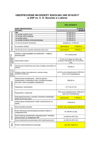 UBEZPIECZENIE MŁODZIEŻY SZKOLNEJ NW 2016/2017 w ZSP im. C. K. Norwida w Lublinie PZU 2016/2017 10 000,00 zł NW na skutek zawału serca na skutek ataku epilepsji na skutek sepsy na skutek krwotoku śródczaszkowego na terenie placówki oświatowej 1 000,00 zł do 25 roku życia z powodu wrodzonej wady serca jednorazowo 1 000,00 zł ZACHOROWANIA, ZDARZENIA USZCZERBERK NA ZDROWIU TRWAŁY USZCZERBEK NA ZDROWIU - TABELA ŚWIADCZEŃ Wstrząs mózgu lub podejrzenie o wstrząs mózgu (HOSPITALIZACJA) ZWROT KOSZTÓW dodatkowo 10.000,00 jednorazowo Utrata zębów stałych INNE 42,00 zł 10 000,00 zł 10 000,00 zł 10 000,00 zł 10 000,00 zł 10 000,00 zł na nowotwór złośliwy POBYT W SZPITALU ŚMIERĆ UBEZPIECZONEGO SUMA UBEZPIECZENIA SKŁADKA Jednorazowe świadczenie przy braku trwałego uszczerbku na zdrowiu Jednorazowe świadczenie - zatrucie gazami, substancjami i produktami chem, porażenie prądem, piorunem, które wymagały hospitalizacji %% według tabeli 2% SU do 9 zębów za każdy ząb, powyżej 9 zębów20% SU za wszystkie zęby 150,00 zł do 3% sumy ubezpieczenia 300,00 zł (min 2 dni hospitalizacji) 500,00 zł Oparzenia i odmrożenia 1,5 % lub 4% SU Pogryzienie i ukąszenie 10% sumy ubezpieczenia 1000,00 zł (pod war hospitalizacji) Amputacja kończyny z powodu nowotworu złośliwego dzieci do 25 roku życia Jednorazowe świadczenie z tytułu zachorowania na sepsę Zwrot kosztów leczenia Koszt odbudowy stomatologicznej zębów stałych w następstwie NW jednorazowo 1 000,00 zł 1 000,00 zł do 30% sumy ubezpieczenia 3000,00 zł do 200,00 za ząb Koszt nabycia przedmiotów ortopedycznych i środków pomocniczych w następstwie NW do 2500,00 (25% SU) Koszt przeszkolenia zawodowego osób niepełnosprawnych do 2500,00 (25% SU) Śmierć rodzica/opiekuna prawnego przy NW 1000,00 zł