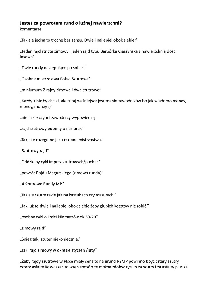 Jesteś za powrotem rund o luźnej nawierzchni? komentarze „Tak ale jedna to troche bez sensu. Dwie i najlepiej obok siebie.” „Jeden rajd stricte zimowy i jeden rajd typu Barbórka Cieszyńska z nawierzchnią dość losową” „Dwie rundy następujące po sobie.” „Osobne mistrzostwa Polski Szutrowe” „miniumum 2 rajdy zimowe i dwa szutrowe” „Każdy kibic by chciał, ale tutaj ważniejsze jest zdanie zawodników bo jak wiadomo money, money, money :)” „niech sie czynni zawodnicy wypowiedzą” „rajd szutrowy bo zimy u nas brak” „Tak, ale rozegrane jako osobne mistrzostwa.” „Szutrowy rajd” „Oddzielny cykl imprez szutrowych/puchar” „powrót Rajdu Magurskiego (zimowa runda)” „4 Szutrowe Rundy MP” „Tak ale szutry takie jak na kaszubach czy mazurach.” „Jak już to dwie i najlepiej obok siebie żeby głupich kosztów nie robić.” „osobny cykl o ilości kilometrów ok 50-70” „zimowy rajd” „Śnieg tak, szuter niekoniecznie.” „Tak, rajd zimowy w okresie styczeń /luty” „Żeby rajdy szutrowe w Plsce miały sens to na 8rund RSMP powinno bbyc cztery szutry cztery asfalty.Rozwiązać to wten sposób że można zdobyc tytułó za szutry i za asfalty plus za cały sezon, myslę że poprawiło by to frekwencje przynajmniej jeśli chodzi o szutrowe rundy. Jednak problem jest taki że chyba nie bardzo gdzie jest zrobić w Polsce 4 szutrowe rajdy.” „Nie jestem fanem szutrów ale jak będzie to też fajnie” „zimowy dolnośląski”