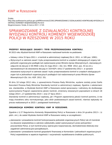 KWP w Rzeszowie Źródło: http://bip.podkarpacka.policja.gov.pl/KPR/kontrole/22393,SPRAWOZDANIE-Z-DZIALALNOSCI-KONTROLNEJ-WYDZIALU-K ONTROLI-KOMENDY-WOJEWODZKIEJ-PO.html Wygenerowano: Środa, 8 marca 2017, 17:05 SPRAWOZDANIE Z DZIAŁALNOŚCI KONTROLNEJ WYDZIAŁU KONTROLI KOMENDY WOJEWÓDZKIEJ POLICJI W RZESZOWIE W 2015 ROKU PRZEPISY REGULUJĄCE ZASADY I TRYB PRZEPROWADZANIA KONTROLI. W 2015 roku Wydział Kontroli KWP w Rzeszowie realizował kontrole na podstawie: ● Ustawy z dnia 15 lipca 2011 r. o kontroli w administracji rządowej (Dz.U. 2011. nr 185 poz. 1092); ● Wytycznych w zakresie zasad i trybu przeprowadzania kontroli w urzędach obsługujących organy lub jednostki organizacyjne podległe lub nadzorowane przez Ministra Spraw Wewnętrznych, stanowiących załącznik do decyzji nr 65 MSW z dnia 31 maja 2012 r. (Dz. Urz. MSW 2012. poz. 43 ze zm.), wprowadzonych do stosowania decyzją nr 319 KGP z dnia 17 października 2012 r. w sprawie stosowania wytycznych w zakresie zasad i trybu przeprowadzania kontroli w urzędach obsługujących organ lub w jednostkach organizacyjnych podległych lub nadzorowanych przez Ministra Spraw Wewnętrznych (Dz. Urz. KGP. 2012. 55). W dniu 10 lutego 2012 roku, z upoważnienia Prezesa Rady Ministrów, wydane zostały przez Szefa Kancelarii Prezesa Rady Ministrów Standardy kontroli w administracji rządowej. Zgodnie z założeniami ww. standardów, w Wydziale Kontroli KWP w Rzeszowie został opracowany i wdrożony do służbowego wykorzystania Program zapewnienia jakości kontroli, zmieniony stosownymi poprawkami w dniach 18 lutego 2014 r.,17 października 2014 r. oraz 27 lipca 2015 r. Standardy kontroli w administracji rządowej, jak i Program zapewnienia jakości kontroli pomimo, iż nie mają charakteru aktu normatywnego, jako zbiór podstawowych zasad kontroli, również wpływały na proces realizowanych w 2015 r. postępowań kontrolnych. ORGANIZACJA KOMÓRKI KONTROLI KWP W RZESZOWIE. Zgodnie z § 27 Regulaminu Komendy Wojewódzkiej Policji w Rzeszowie z dnia 24 grudnia 2013 r. (z późn. zm.), do zadań Wydziału Kontroli KWP w Rzeszowie należy w szczególności: ● planowanie i prowadzenie kontroli funkcjonowania jednostek organizacyjnych Policji lub ich komórek na obszarze województwa w zakresie całokształtu zadań wykonywanych przez policjantów i pracowników Policji, w tym kontroli pracy operacyjno-rozpoznawczej, dochodzeniowo-śledczej oraz zagadnień administracyjno-porządkowych, ● planowanie i prowadzenie kontroli gospodarki finansowej w Komendzie i jednostkach organizacyjnych Policji województwa w aspekcie legalności i racjonalności wydatkowania środków publicznych, poprawności udokumentowania wydatków, prawidłowości przyjętej polityki rachunkowości i sporządzania sprawozdawczości budżetowej, przestrzegania ustanowionych procedur kontroli finansowej oraz gospodarowania rzeczowymi składnikami majątku będącymi w ich posiadaniu, zarządzie lub użytkowaniu, ● prowadzenie kontroli stanu bezpieczeństwa pożarowego w jednostkach organizacyjnych Policji województwa oraz w komórkach organizacyjnych Komendy; ● przyjmowanie, rozpatrywanie i załatwianie skarg i wniosków, dla których organem właściwym jest Komendant oraz nadzorowanie i koordynowanie rozpatrywania skarg i wniosków przez jednostki organizacyjne Policji województwa, ● monitorowanie, analizowanie i diagnozowanie przyczyn wydarzeń nadzwyczajnych z udziałem policjantów i pracowników Policji, nieprawidłowości lub niepożądanych zjawisk ujawnianych w ramach działalności inspekcyjnej, w tym poprzez prowadzenie wymaganej sprawozdawczości oraz proponowanie na tej podstawie przedsięwzięć o charakterze naprawczym, usprawniającym lub rozstrzygającym. Wewnętrzną strukturę Wydziału Kontroli KWP w Rzeszowie określa Szczegółowy zakres zadań wydziału, zgodnie z którym wyodrębniono nieetatowe zespoły: Kontroli Ogólnopolicyjnej, Kontroli Finansowo-Gospodarczej, Skarg i Wniosków oraz Stanowisko ds. Kontroli Bezpieczeństwa Pożarowego (zwane dalej stanowiskiem ds. KBP). Rozkazem organizacyjnym nr 8/15 z dnia 15 czerwca 2015 r. Komendanta Wojewódzkiego Policji w Rzeszowie z dniem 15 lipca 2015 r. uległa zmianie struktura organizacyjna Wydziału Kontroli tut. KWP poprzez zlikwidowanie Stanowiska ds. Kontroli Bezpieczeństwa Pożarowego (KBP), ze względu na konieczność rozdzielenia zadań o charakterze wykonawczym od zadań kontrolnych. Zmiana ta spowodowała przeniesienie etatu z korpusu służby cywilnej ze stanu etatowego Wydziału Kontroli na stan etatowy Zespołu BHP i P.poż. Działalność kontrolna koncentrowała się na wykonaniu zatwierdzonego przez Komendanta Wojewódzkiego Policji planu kontroli na 2015 r. Poza zbadaniem zagadnień ujętych w planie, przeprowadzono także, nie ujęte w planie kontroli, kontrole w trybie uproszczonym, jak również czynności wyjaśniające podejmowane na polecenie kierownictwa KWP oraz koordynowano czynności zlecone do przeprowadzenia komórkom organizacyjnym KMP/KPP. Stan etatowy Wydziału Kontroli na dzień 31 grudnia 2015 r. Liczba osób realizujących kontrole Kierownictwo 2 2 --Sekretariat 1 1 --Zespół Kontroli Ogólnopolicyjnej 10 10 10 Zespół Kontroli Finansowo-Gospodarczej 2 2 2 Zespół Skarg i Wniosków 4 i ½ etatu 4 i ½ etatu 4 Razem 19 i ½ etatu 19 i ½ etatu 16 Etaty Zatrudnienie Wakaty 0 0 0 0 0 0 W 2015 r. czynności kontrolne w Wydziale Kontroli tut. KWP realizowało ogółem 16 osób, tj. funkcjonariuszy i pracowników (przy czym jeden z pracowników ds. Kontroli Bezpieczeństwa Pożarowego (KBP) z dniem 15 lipca 2015 r., rozkazem organizacyjnym nr 8/15 Komendanta Wojewódzkiego Policji w Rzeszowie, wyłączony został etatowo ze struktury Wydziału Kontroli). Fluktuacja kadry kontrolerów w Wydziale Kontroli wynikała z naturalnych procesów kadrowych związanych z awansem na wyższe stanowisko służbowe. W roku sprawozdawczym trzech kontrolerów awansowa