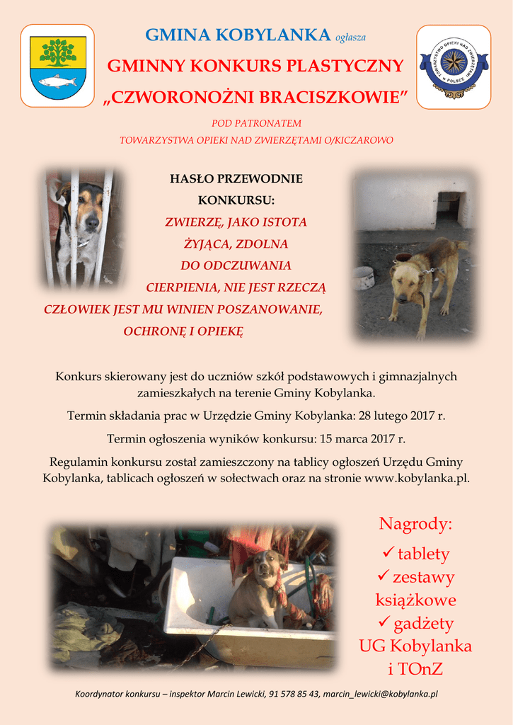GMINA KOBYLANKA ogłasza GMINNY KONKURS PLASTYCZNY „CZWORONOŻNI BRACISZKOWIE” POD PATRONATEM TOWARZYSTWA OPIEKI NAD ZWIERZĘTAMI O/KICZAROWO HASŁO PRZEWODNIE KONKURSU: ZWIERZĘ, JAKO ISTOTA ŻYJĄCA, ZDOLNA DO ODCZUWANIA CIERPIENIA, NIE JEST RZECZĄ CZŁOWIEK JEST MU WINIEN POSZANOWANIE, OCHRONĘ I OPIEKĘ Konkurs skierowany jest do uczniów szkół podstawowych i gimnazjalnych zamieszkałych na terenie Gminy Kobylanka. Termin składania prac w Urzędzie Gminy Kobylanka: 28 lutego 2017 r. Termin ogłoszenia wyników konkursu: 15 marca 2017 r. Regulamin konkursu został zamieszczony na tablicy ogłoszeń Urzędu Gminy Kobylanka, tablicach ogłoszeń w sołectwach oraz na stronie www.kobylanka.pl. Nagrody: tablety zestawy książkowe gadżety UG Kobylanka i TOnZ Koordynator konkursu – inspektor Marcin Lewicki, 91 578 85 43, [email protected]