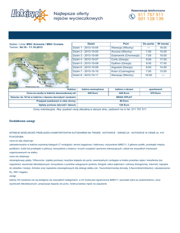 Statek / Linia: MSC Armonia / MSC Cruises Termin: 04.10 - 11.10.2013 Do portu W morze Dzień 1 - 2013-10-04 Dzień Wenecja (Włochy) Port --- 18.00 Dzień 2 - 2013-10-05 Ancona (Włochy) 7.00 15.00 Dzień 3 - 2013-10-06 Dubrownik (Chorwacja) 7.00 19.00 Dzień 4 - 2013-10-07 Corfu (Grecja) 9.00 17.00 Dzień 5 - 2013-10-08 Gythion (Grecja) 9.00 17.00 Dzień 6 - 2013-10-09 Argostoli (Grecja) 8.00 14.00 Dzień 7 - 2013-10-10 Kotor (Czarnogóra) 7.00 13.00 Dzień 8 - 2013-10-11 Wenecja (Włochy) 10.00 --- Ceny Kabina: Cena za osobę w kabinie dwuosobowej od: kabina wewnętrzna kabina z oknem apartament 429 Euro 629 Euro 979 Euro Dziecko do 18 lat w kabinie z dwoma dorosłymi osobami: BRAK OPŁAT Przejazd autokarem w obie strony: 80 Euro Opłaty portowe (dorośli i dzieci): 120 Euro Ceny orientacyjne. Aby uzyskać cenę aktualną w danym dniu, zadzwoń na nr tel. 511 757 511 Dodatkowe uwagi ISTNIEJE MOŻLIWOŚĆ PRZEJAZDU KOMFORTOWYM AUTOKAREM NA TRASIE: KATOWICE - WENECJA - KATOWICE W CENIE ok. 410 PLN/OSOBA. cena za rejs obejmuje: zakwaterowanie w kabinie wybranej kategorii (7 noclegów); serwis bagażowy i kabinowy; wyżywienie – 3 główne posiłki, przekąski między posiłkami, bufet lub przekąski o północy; korzystanie z basenu i innych urządzeń sportowo-rekreacyjnych; udział we wszystkich imprezach organizowanych na statku. cena nie obejmuje: obowiązkowej opłaty 120euro/os. (opłaty portowe); kosztów dojazdu do portu; ewentualnych noclegów w hotelu przed/po rejsie i transferów (na zapytanie); wycieczek fakultatywnych; korzystania z punktów usługowych (pralnia, fotograf, salon piękności i odnowy biologicznej, internet); napojów do obiadów i kolacji, drinków oraz napiwków obowiązkowych dla obsługi statku (ok. 7euro/dzień/osobę dorosłą; 3,5euro/dzień/dziecko); ubezpieczenia KL, NW i bagażu. uwagi: kabiny 3/4 osobowe nie są dostępne we wszystkich kategoriach, a ich liczba jest ograniczona – sprzedaż tylko po potwierdzeniu; ceny wycieczek fakultatywnych, propozycje dojazdu do portu, hoteli przed/po rejsie na zapytanie.