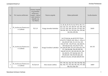 Archiwa Państwowe szukajwarchiwach.pl Lp 1 Nr i nazwa archiwum 35_Archiwum Państwowe w Lublinie Numer zespołu (wg formatu: archiwum / zespół / dalsza część numeru zespołu, np. 72/158/0) 35/1/0 Nazwa zespołu Zakres jednostek Liczba skanów Księgi ziemskie lubelskie 11, 20, 26, 29, 35, 36, 46, 70-76, 106, 113, 115, 116, 131, 133, 146-157, 167, 186, 169, 171-173, 189, 188, 192-194, 179-182, 190, 198-200, 205, 214, 223-224, 236, 238-240, 241-254, 255-256 26418 2 35_Archiwum Państwowe w Lublinie 35/8/0 Księgi Grodzkie Lubelskie 36-37,39,42,44, 46-49,52-55,57-59,6167,69-70, 72-88,91-102, 103cz.1- 103cz.2, 104-105,107-108, 111,113-114, 120122,127-129, 134,139-141, 146-148,153, 158-160,163-164, 167,170,177-179, 181,184,187,200, 211a,217,218a,222, 274275, 280,284,288, 294-295,300-301, 304,307,312-315, 322-325,330-333, 338341,348-351, 357-360,366-369, 375378,385,387, 394-395,399-400, 403405,411-412,414, 419,426-428,430-432 3 35_Archiwum Państwowe w Lublinie 35/22/0/4 Akta miasta Lublina 737, 739, 741, 744, 747, 749, 756-758, 760, 766, 768, 773, 778, 789, 790, 794, 797, 805, 808, 812, 820, 823 Narodowe Archiwum Cyfrowe 181 153 14069 1 Archiwa Państwowe szukajwarchiwach.pl 4 35_Archiwum Państwowe w Lublinie 35/22/0/2 Akta miasta Lublina 1-43,44-50,51-60,61-71,72-97,98-125,126131,132,134,135-139,140-144,147-174,175181,182-184,186-189,190-215,216-218, 220236,238,257,261,262,265-281,283,285288,289-295,296-,298-301,302-303,305306,307-308,337,342,345 5 35_Archiwum Państwowe w Lublinie 35/34/0 Akta miasta Hrubieszowa 1-24 9727 6 35_Archiwum Państwowe w Lublinie 35/61/0 Akta miasta Zamościa 2, 6-12, 15-18, 20, 24-29, 31-36, 38-62, 6566, 68-71, 77-79, 81-82, 85, 87-90, 94, 97, 99, 101-102, 106-108, 111-114, 117-120 42899 7 35_Archiwum Państwowe w Lublinie 35/79/0 Archiwum Lubomirskich z Dubna 1 -74, 77, 78 1637 8 35_Archiwum Państwowe w Lublinie 35/106/27 Akta parafii rzymskokatolickiej w Łaszczowie 1-2 36 9 35_Archiwum Państwowe w Lublinie 35/106/32 Akta parafii rzymskokatolickiej w Płazowie 20-21 89 10 35_Archiwum Państwowe w Lublinie 35/107/25 Akta parafii w Sławatyczach 1,4-7 276 11 35_Archiwum Państwowe w Lublinie 35/107/26 Akta parafii w Sulmicach 6 134 12 35_Archiwum Państwowe w Lublinie 35/107/36 Akta parafii w Uhrusku 1 12 Narodowe Archiwum Cyfrowe 251406 2 Archiwa Państwowe szukajwarchiwach.pl 35/107/38 Akta parafii greckokatolickiej w Żurawcach 3 100 235-266,288-297,328-347,767-788,789831,911-939,1013-1093,1180-1201,12441400,1407-1427 70186 13 35_Archiwum Państwowe w Lublinie 14 35_Archiwum Państwowe w Lublinie 35/639/0 Towarzystwo Rolnicze Hrubieszowskie Fundacji Staszica 15 35_Archiwum Państwowe w Lublinie 35/1188/0 Rząd Gubernialny Podlaski 10-13 619 16 35_Archiwum Państwowe w Lublinie 35/1428/0 Akta Jurydyki Gorajszczyzna 1 450 17 35_Archiwum Państwowe w Lublinie 35/1643/0 Akta stanu cywilnego Parafii Rzymskokatolickiej w Baranowie 26 22 18 35_Archiwum Państwowe w Lublinie 35/1654/0 Akta stanu cywilnego Parafii Rzymskokatolickiej w Bystrzycy 220 82 19 35_Archiwum Państwowe w Lublinie 35/1657/0 Akta stanu cywilnego Parafii Rzymskokatolickiej w Chełmie 177 224 20 35_Archiwum Państwowe w Lublinie 35/1657/0 Akta stanu cywilnego Parafii Rzymskokatolickiej w Chełmie 98-100,102,104-108,110,112,114,116 988 21 35_Archiwum Państwowe w Lublinie 35/1659/0 Akta stanu cywilnego Parafii Rzymskokatolickiej w Chodlu 27 24 22 35_Archiwum Państwowe w Lublinie 35/1773/0 Akta stanu cywilnego Okręgu Bożniczego w Szczebrzeszynie 1-7,9-42 2167 Narodowe Archiwum Cyfrowe 3 Archiwa Państwowe szukajwarchiwach.pl 35/1774/0 Akta stanu cywilnego Okręgu Bożniczego w Świerżach 1-26,28-31 556 35/1806/0 Akta stanu cywilnego Parafii Rzymskokatolickiej w Chodywańcach 2, 32 114 35/1813/0 Akta stanu cywilnego Parafii Rzymskokatolickiej w Dubience 54 42 53, 55-57 463 23 35_Archiwum Państwowe w Lublinie 24 35_Archiwum Państwowe w Lublinie 25 35_Archiwum Państwowe w Lublinie 26 35_Archiwum Państwowe w Lublinie 35/1831/0 Akta stanu cywilnego Parafii Rzymskokatolickiej w Huszlewie 27 35_Archiwum Państwowe w Lublinie 35/1833/0 Akta stanu cywilnego Parafii Rzymskokatolickiej w Janowie 144 127 28 35_Archiwum Państwowe w Lublinie 35/1836/0 Akta stanu cywilnego Parafii Rzymskokatolickiej w Kazimierzu 100 112 29 35_Archiwum Państwowe w Lublinie 35/1843/0 Akta stanu cywilnego Parafii Rzymskokatolickiej w Kodniu 85 50 30 35_Archiwum Państwowe w Lublinie 35/1848/0 Akta stanu cywilnego Parafii Rzymskokatolickiej w Krasnobrodzie 161 12 31 35_Archiwum Państwowe w Lublinie 35/1851/0 Akta stanu cywilnego Parafii Rzymskokatolickiej w Kryłowie 2-7, 22-23, 59 344 Narodowe Archiwum Cyfrowe 4 Archiwa Państwowe szukajwarchiwach.pl 35/1857/0 Akta stanu cywilnego Parafii Rzymskokatolickiej w Lubartowie, filia w Firleju 137 55 35/1869/0 Akta stanu cywilnego Parafii Rzymskokatolickiej w Łopienniku 131, 139 128 73 72 32 35_Archiwum Państwowe w Lublinie 33 35_Archiwum Państwowe w Lublinie 34 35_Archiwum Państwowe w Lublinie 35/1878/0 Akta stanu cywilnego Parafii Rzymskokatolickiej w Michowie 35 35_Archiwum Państwowe w Lublinie 35/1896/0 Akta stanu cywilnego Parafii Rzymskokatolickiej w Piotrawinie 31-32, 43-47 247 36 35_Archiwum Państwowe w Lublinie 35/1905/0 Akta stanu cywilnego Parafii Rzymskokatolickiej w Radoryżu 13-55 1252 37 35_Archiwum Państwowe w Lublinie 35/1905/0 Akta stanu cywilnego Parafii Rzymskokatolickiej w Radoryżu 13-55 1192 38 35_Archiwum Państwowe w Lublinie 35/1908/0 Akta stanu cywilnego Parafii Rzymskokatolickiej w Radzyniu 1-93 9420 39 35_Archiwum Państwowe w Lublinie 35/1908/0 Akta stanu cywilnego Parafii Rzymskokatolickiej w Radzyniu 1-16,19,21,23-24,26-27,29,32-33,35,3738,41,43-93 5418 40 35_Archiwum Państwowe w Lublinie 35/1914/0 Akta stanu cywilnego Parafii Rzymskokatolickiej w Rykach 6, 7 391 Narodowe Archiwum Cyfrowe 5 Archiwa Państwowe szukajwarchiwach.pl 35/1919/0 Akta stanu cywilnego Parafii Rzymskokatolickiej w Siennicy Różanej 225-226 153 35/1921/0 Akt