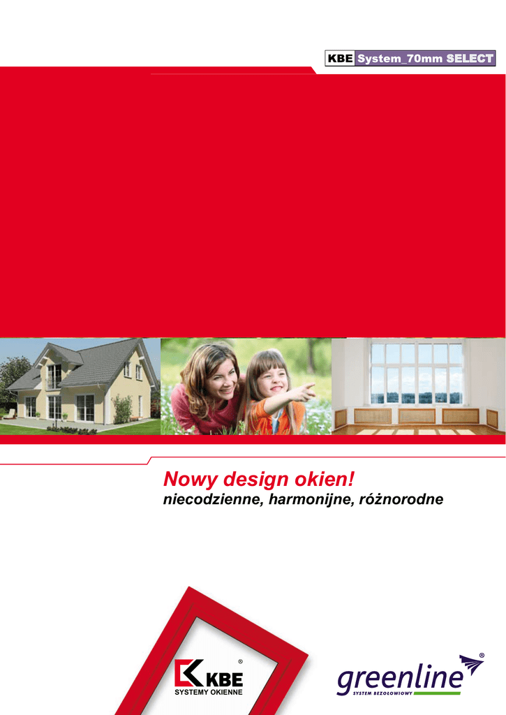 Nowy design okien! greenline macht niecodzienne, harmonijne, różnorodne Kunststoff-Fenster bleifrei SYSTEMY OKIENNE – okna niecodzienne, harmonijne, różnorodne Przy wyborze okien nie można godzić się na kompromisy. Trzeba znaleźć rozwiązania, które natychmiast zagwarantują wysoki komfort życia. 1,3 W/(m²K) Zaokrąglona, elegancka i harmonijna linia optyczna. Duże komory pozwalające na dobór wzmocnień odpowiednio do wymagań statycznych. 13 mm oś okuciowa zapewniająca optymalne zabezpieczenie przed włamaniem. Zgrzewalne uszczelki dostępne w klasycznej czerni lub jasnoszarym kolorze, doskonale harmonizującym z bielą profili. Atrakcyjna, elegancka i harmonijna linia optyczna. Wyprofilowany, gładki wrąb ułatwiający utrzymanie czystości i odprowadzanie ewentualnie nagromadzonej wody. Możliwość stosowania pakietów szybowych o grubości od 4 do 52 mm. Profile występują w szerokiej palecie kolorów - powlekane jedno- lub dwustronnie okleiną o strukturze drewna lub o strukturze uniwersalnej z fakturą gładką lub wytłaczaną. SYSTEMY OKIENNE Zmiany techniczne zastrzeżone! Numer zamówienia 61004550 Uf Profile o 70 mm szerokości zabudowy z uszczelką przylgową o współczynniku przenikania ciepła Uf = 1,3 (W/m2K) - wysoka izolacja akustyczna i termiczna dzięki wielokomorowej konstrukcji profili. Profine Polska Zaokrąglone kontury 5-komorowych, bezołowiowych profili KBE SELECT o 70 mm szerokości zabudowy sprawiają, że okna znakomicie komponują się z różnych stylami architektonicznymi. Profine Polska Sp. z o.o., KBE Fenstersysteme ul.Strachowicka 40, 54-512 Wrocław Tel.: +48 71 347 11 60 – 64, Fax: +48 71 354 71 62, e-mail: [email protected] www.oknagreenline.pl www.kbe-polska.pl